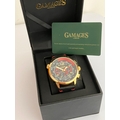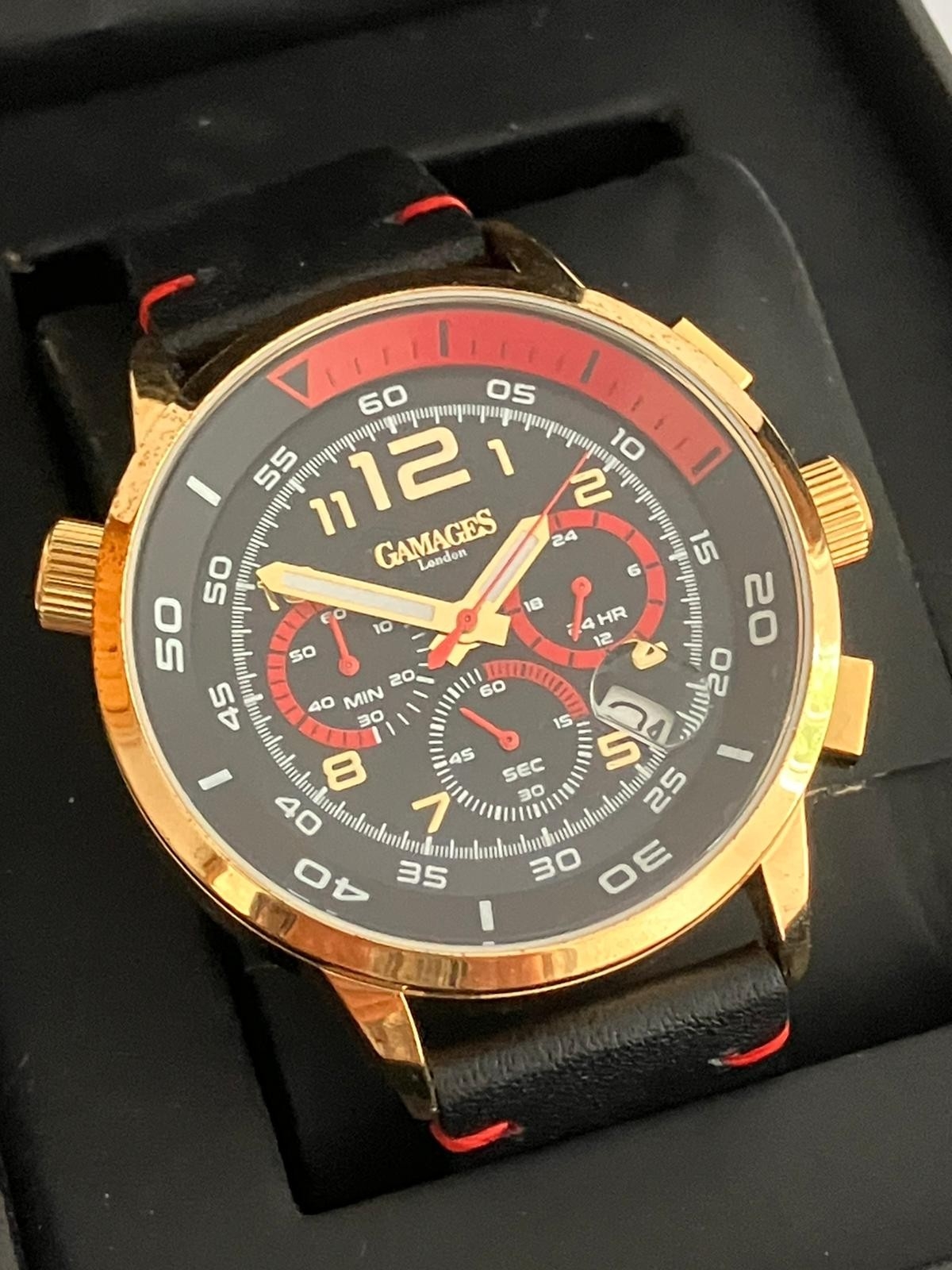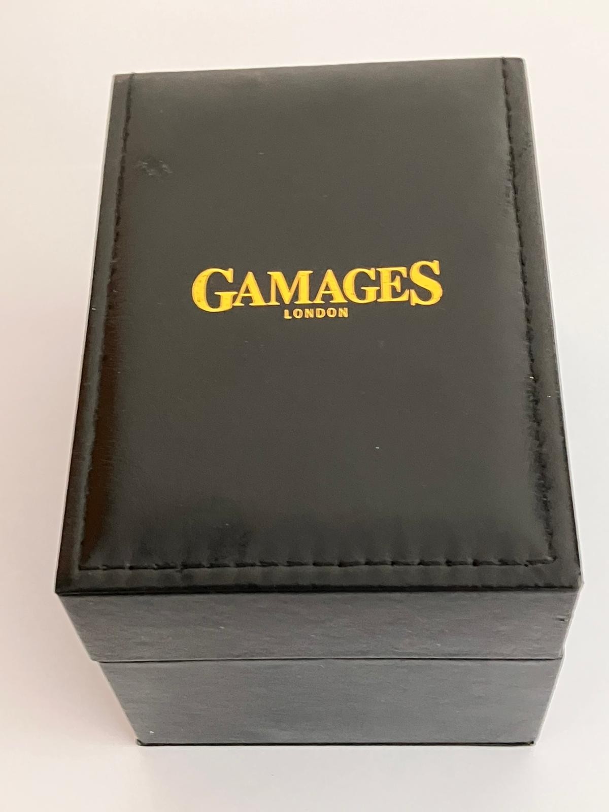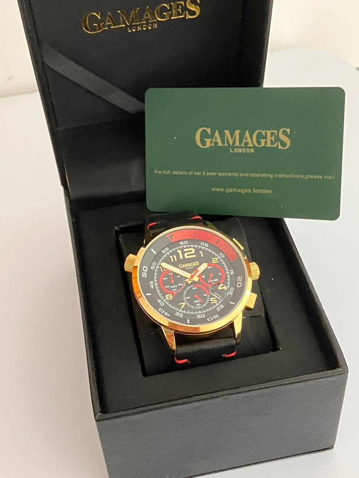 Gentleman’s GAMAGES of LONDON CHRONOGRAPH watch, finished in Gold tone stainless steel, Black face multi dial model . Complete with original case .Quartz Movement. Full working order. Complete with original case and Tag. Condition as new. Please see pictures.