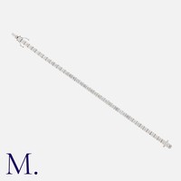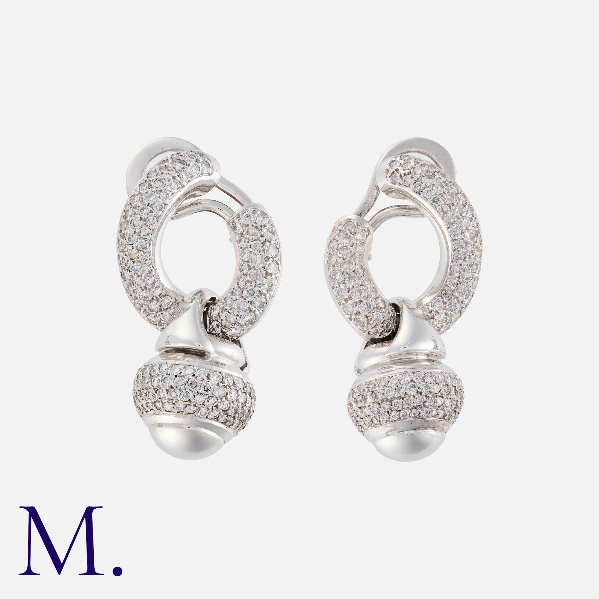 A Pair Of Diamond Drop Earrings in 18k white gold, of hoop design, suspending an articulated drop. Set with round cut diamonds. Stamped K18.