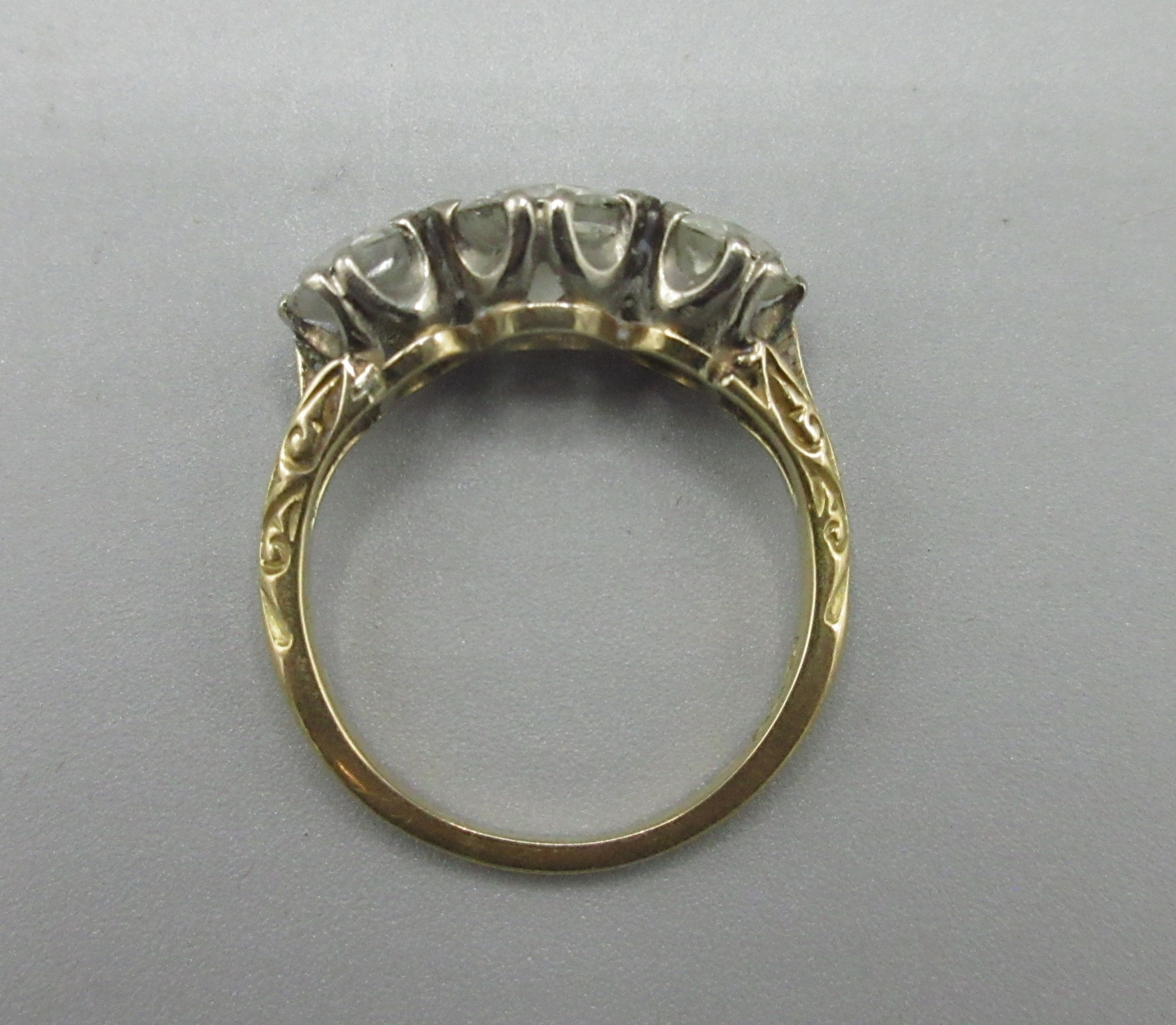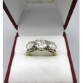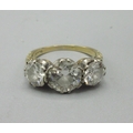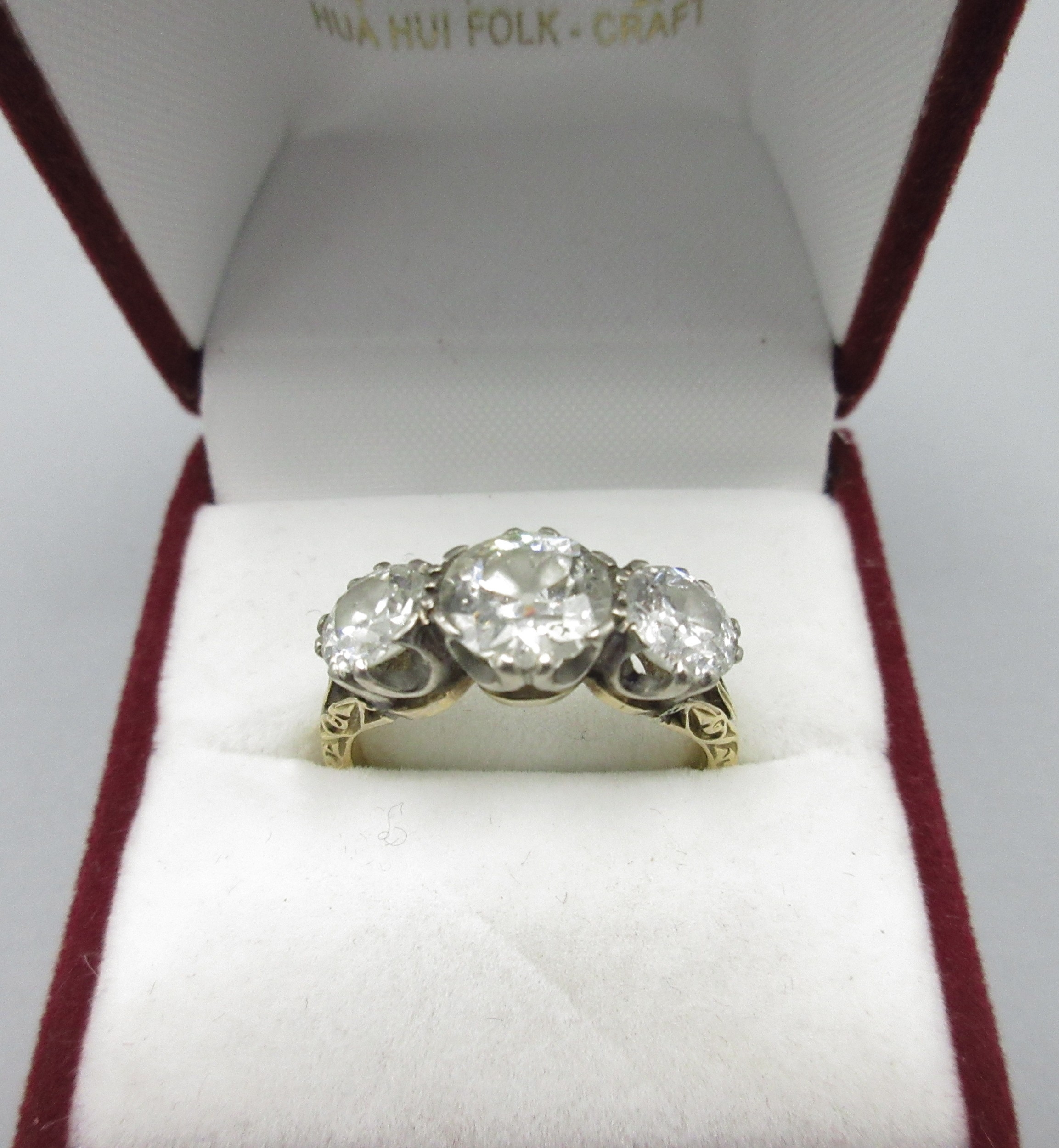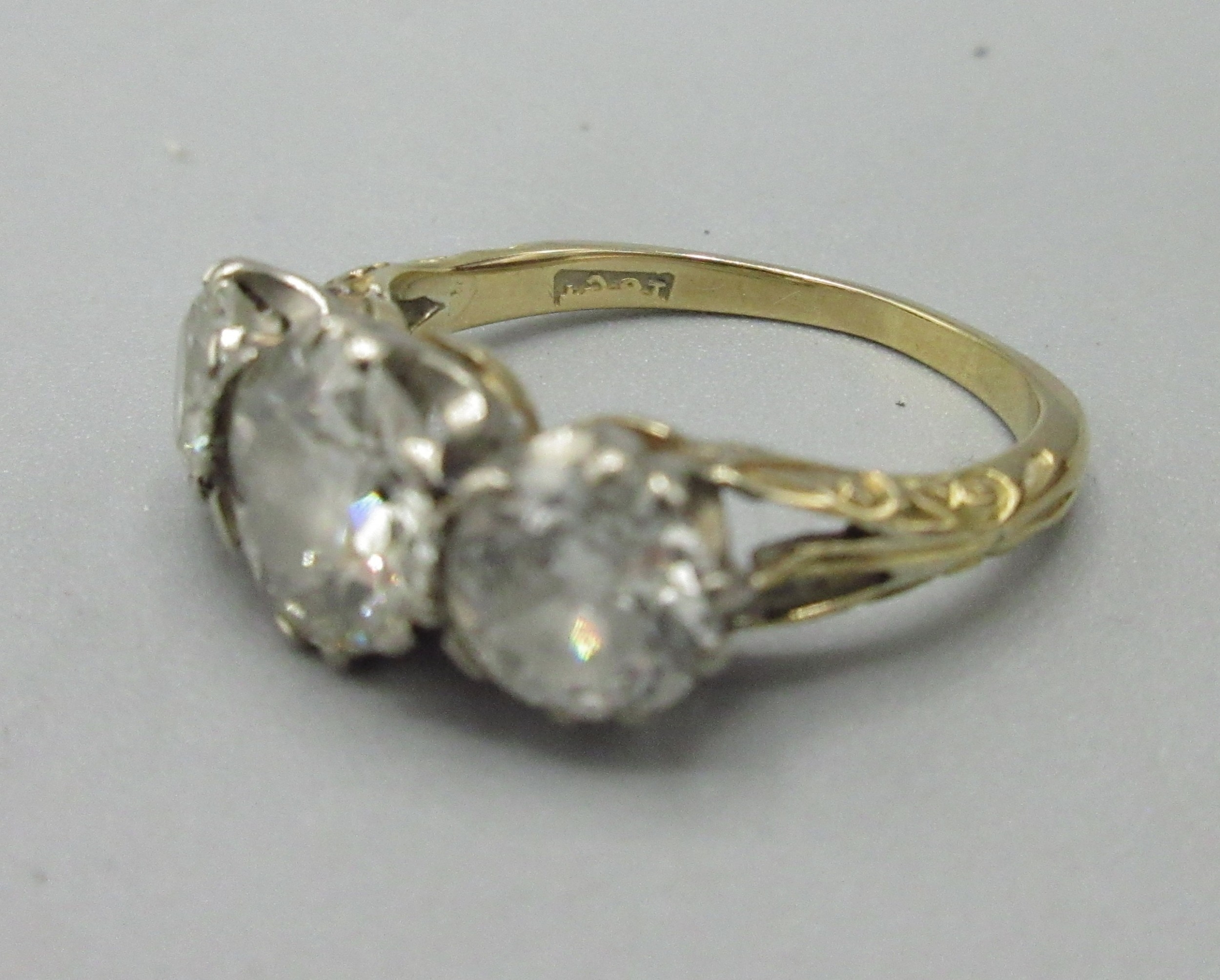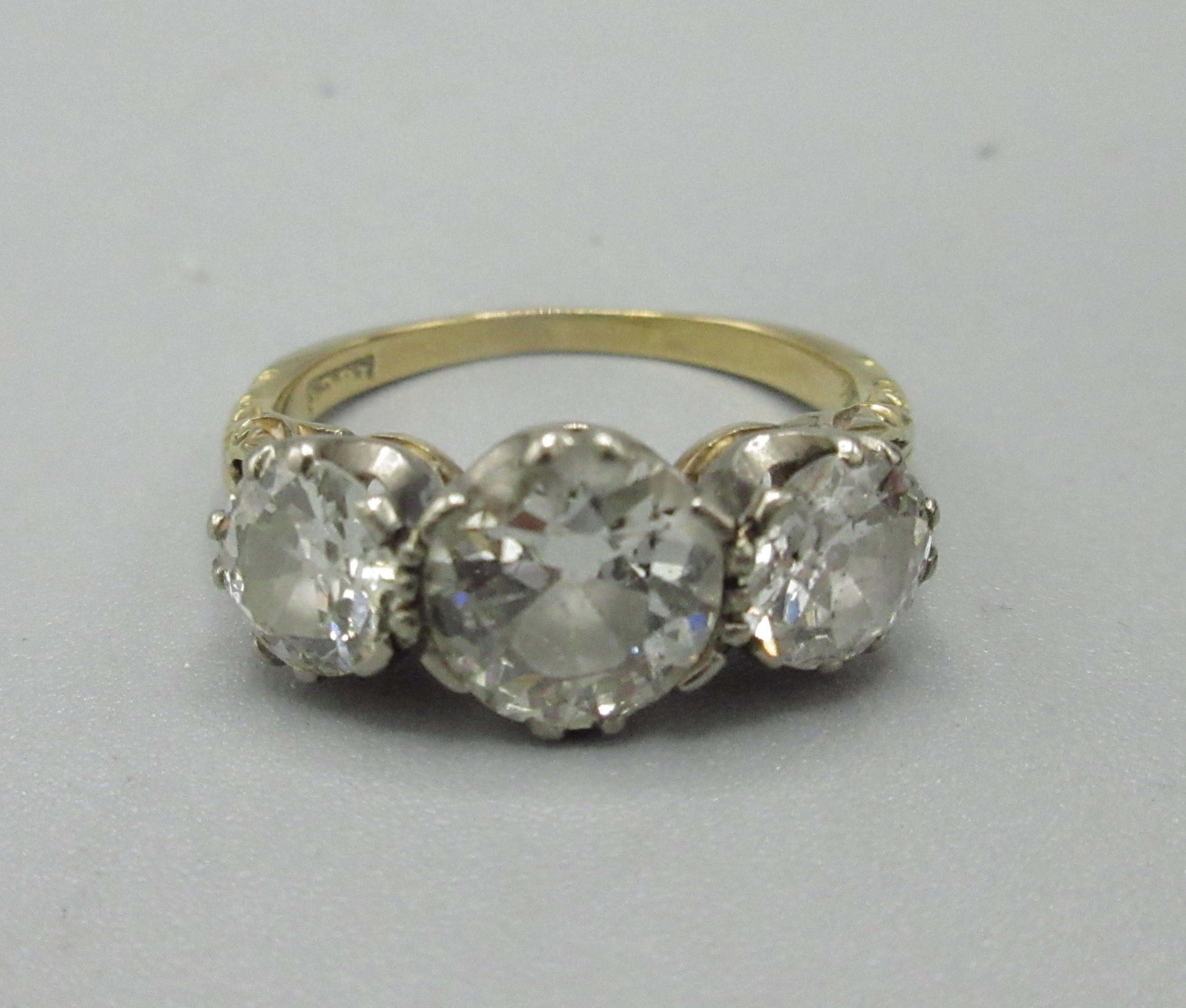 18ct yellow gold trilogy ring, three round brilliant cut diamonds in claw setting, central diamond approximately 2 carat flanked by approximately 1 carat diamonds, stamped 18ct, size P1/2, 4.7g