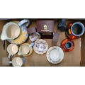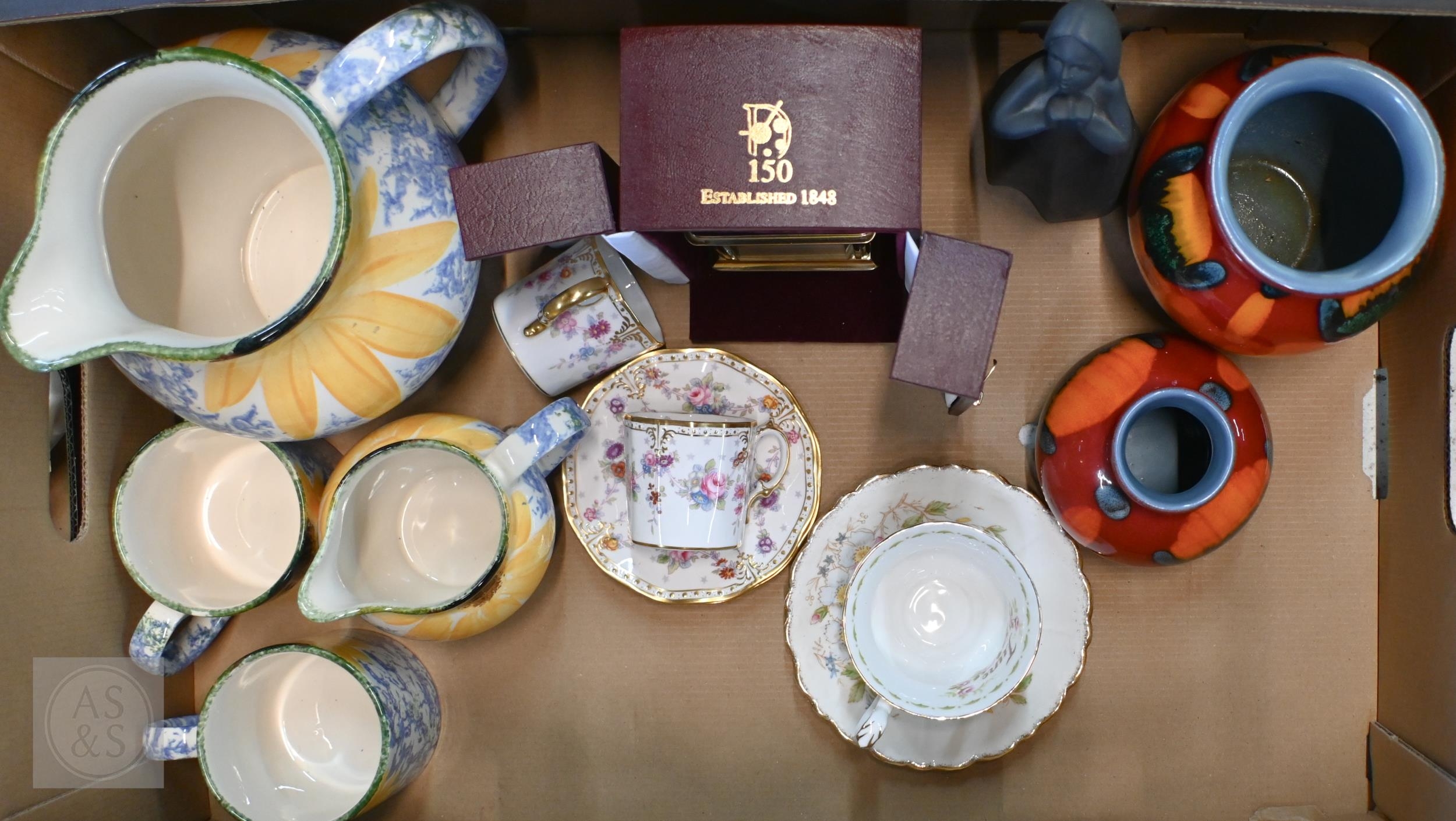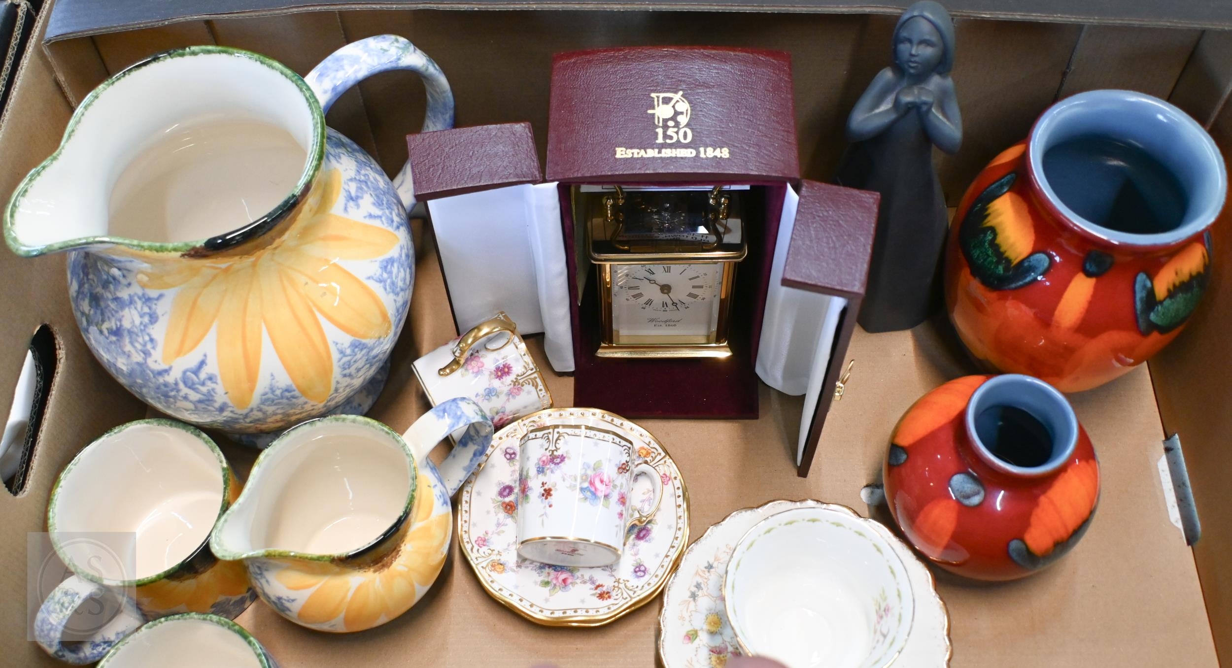 A boxed Woodford carriage clock (as new), to/w two Poole Pottery Gemstone 'Volcano' vases by Anita Harris, two Poole 'Vincent' jugs and matching mug (painted with sunflowers), a pair of Royal Crown Derby coffee cups and saucers, a Royal Doulton figure etc (box)