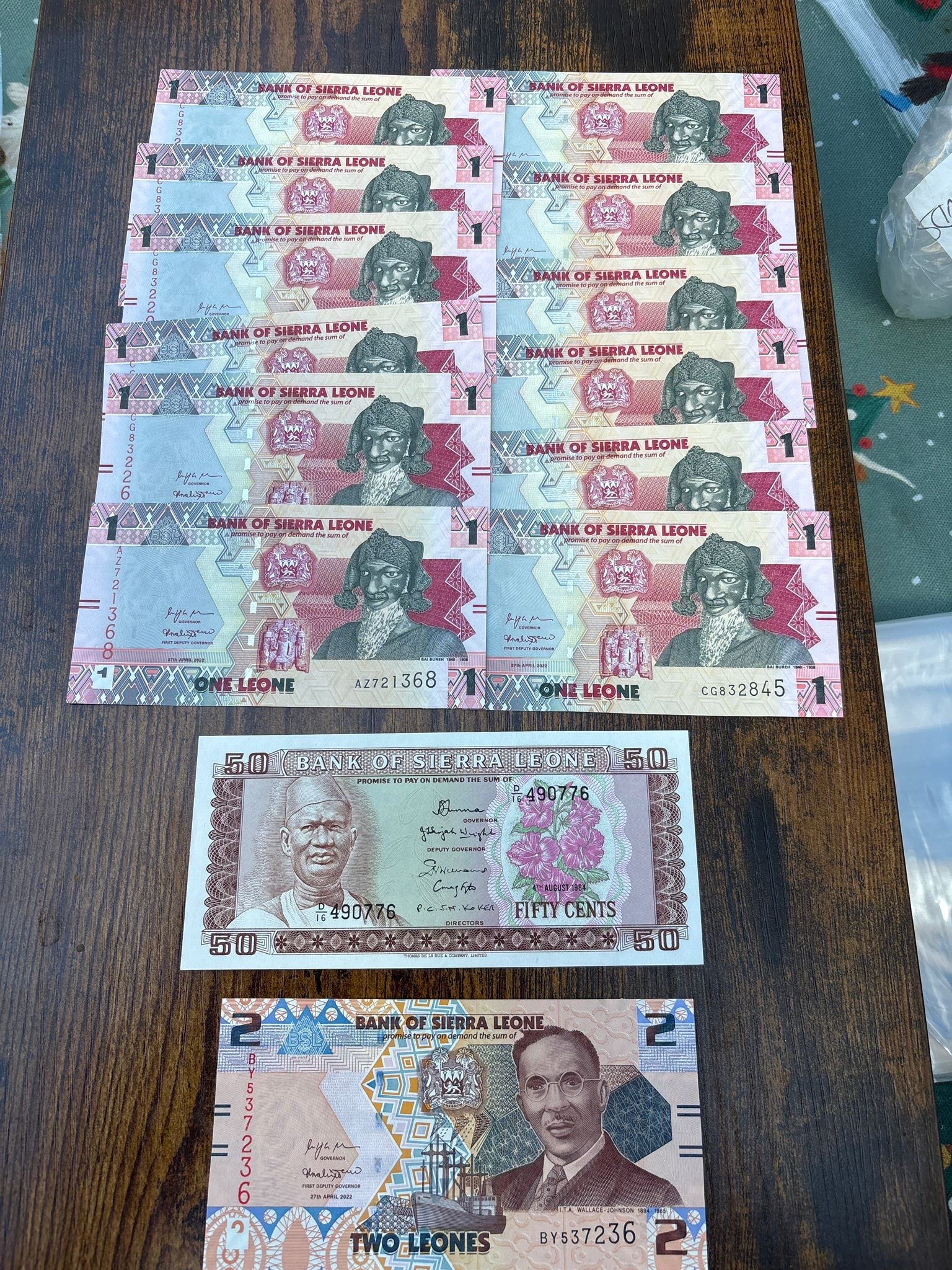 Sierra Leone Banknote Collection – 14 Notes (1 Leone, 2 Leones & 50 Cents) Group of fourteen Bank of Sierra Leone banknotes including twelve 1 Leone notes, one 2 Leones note and one earlier 50 Cents issue. A mixed-date collection showing both modern and older designs. Generally circulated condition with light handling wear. A varied and affordable African banknote lot ideal for collectors or starter collections. Sold as seen.