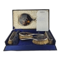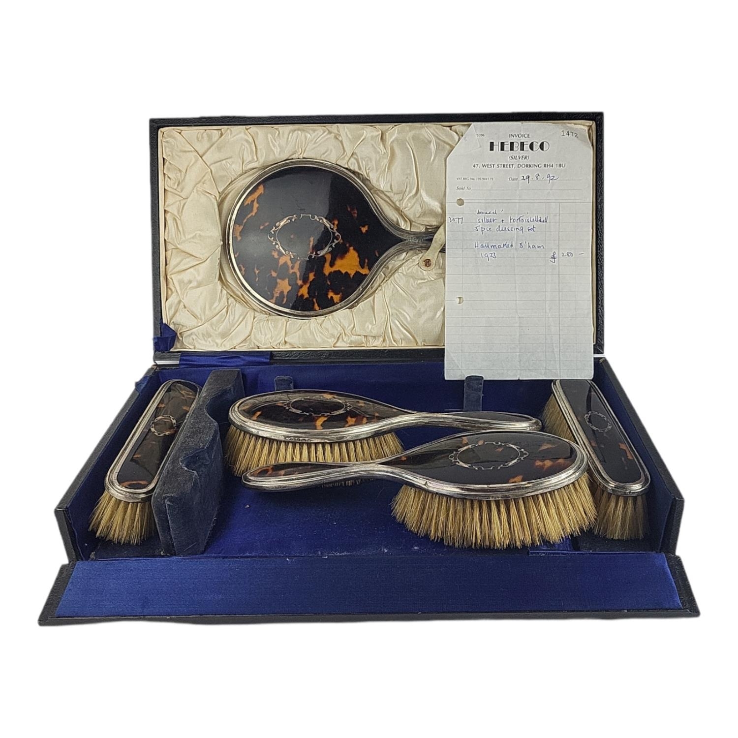 Comprising a hand mirror, two hair brushes and two clothes brushes, set with tortoiseshell panels inlaid with silver, hallmarked Birmingham, 1923, in a fitted velvet lined box.