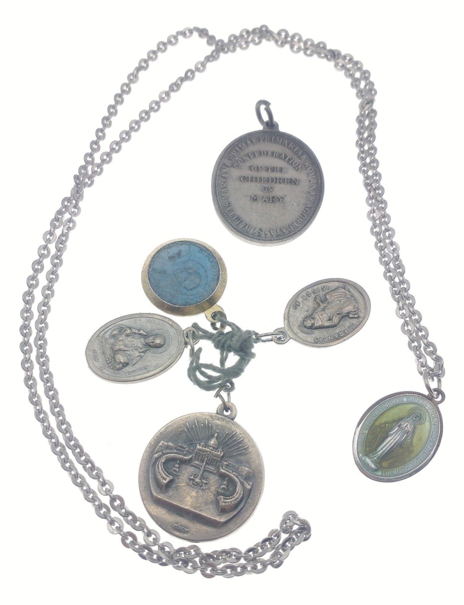 CONFEDERATION OF THE CHILDREN OF MARY oval-shaped vintage pendant in white metal dimensions 3cm x 3cm approx with a MARY PRAY FOR US WITHOUT SIN Italian stamped pendant in white metal with a enamel style finish in two colours of green with a long white metal chain length 68cm approx with lastly a Vatican Pope John Paul commemorative medallion attached to a PRAY FOR US medallion etc