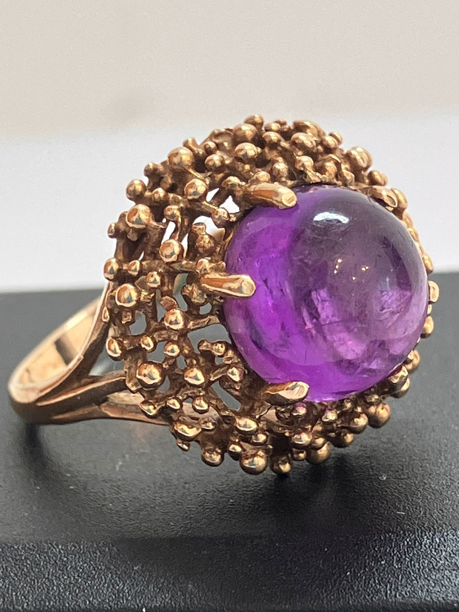 Stunning 9 CARAT GOLD, PURPLE MOONSTONE CABOCHON RING. Beautiful ‘Beehive’ mount. Full UK hallmark 5.09 grams. Size M 1/2 - N. Please see pictures.