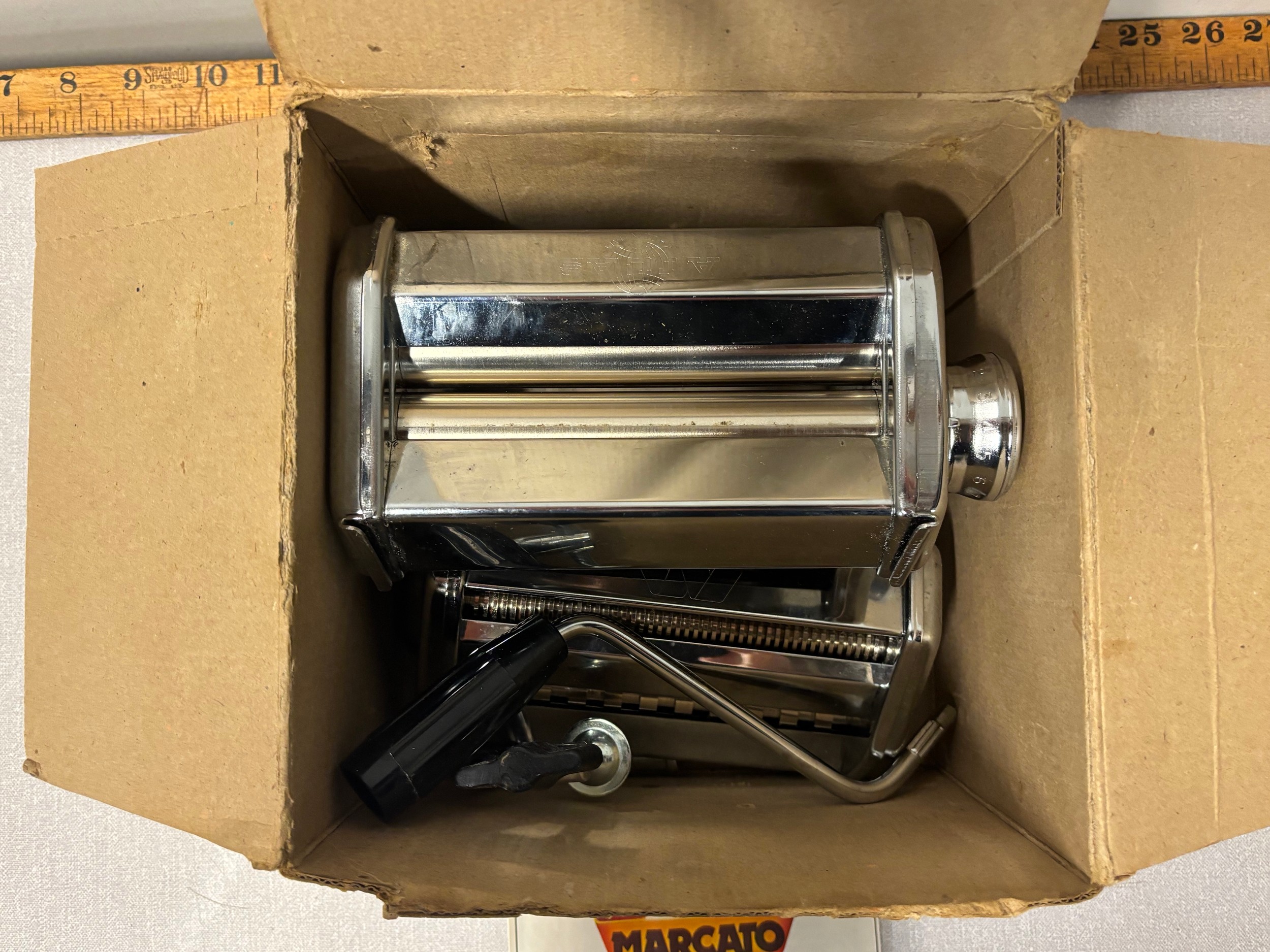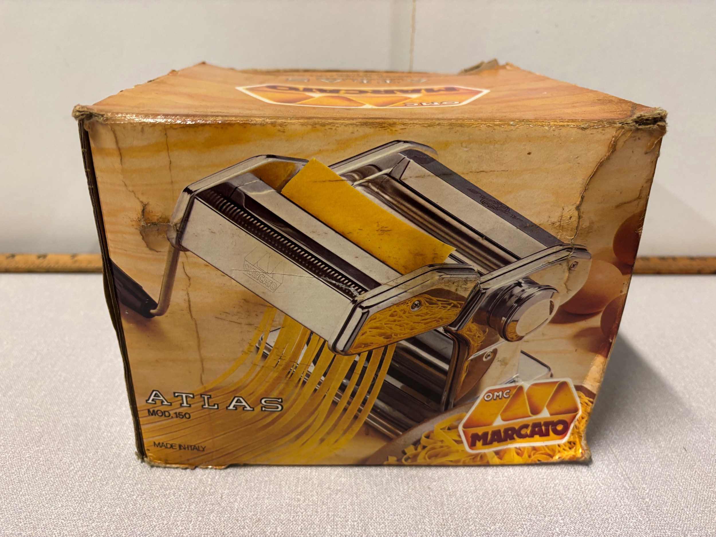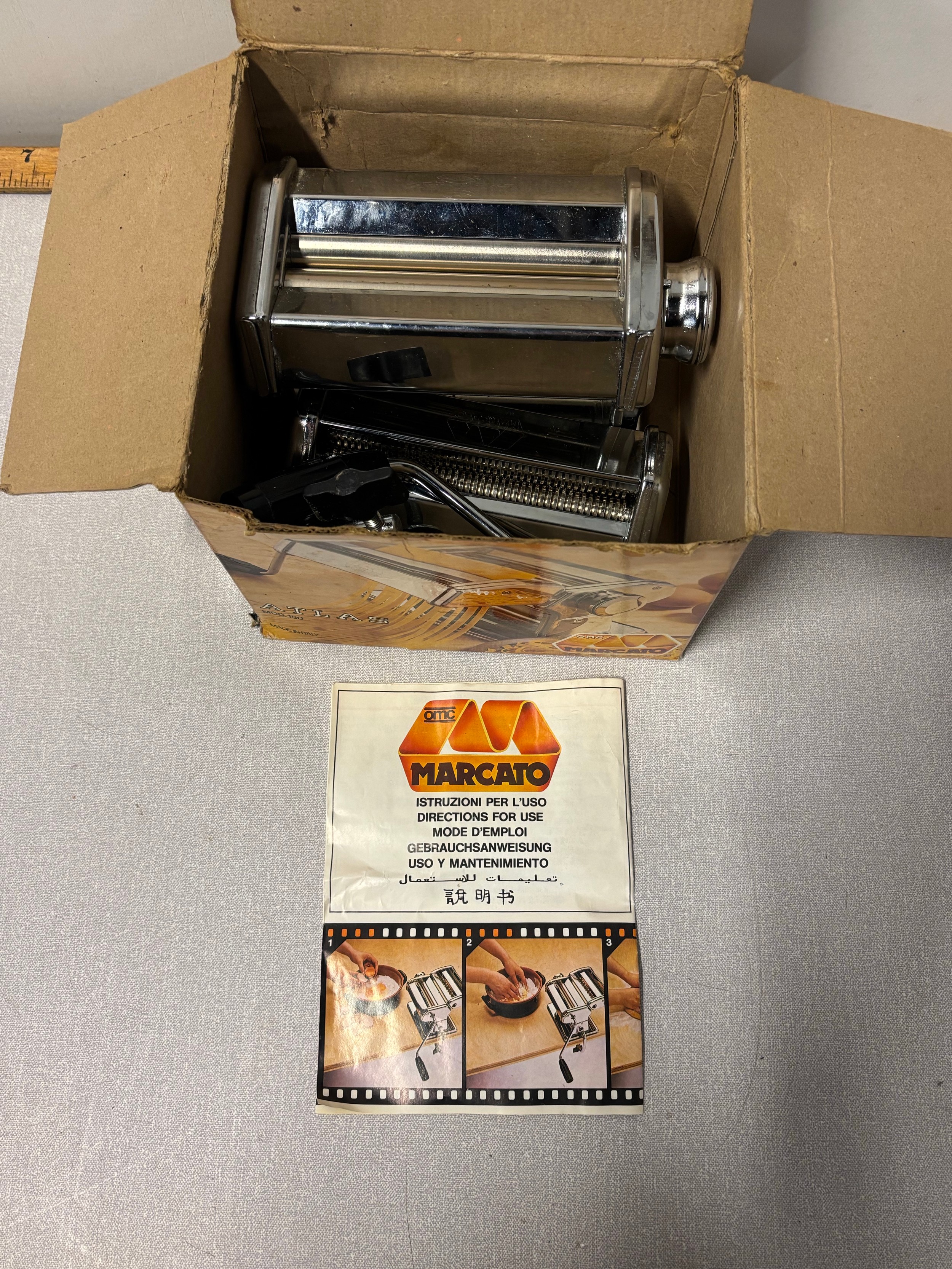 Vintage Italian Mercato atlas 150 pasta making machine in original box with instructions.