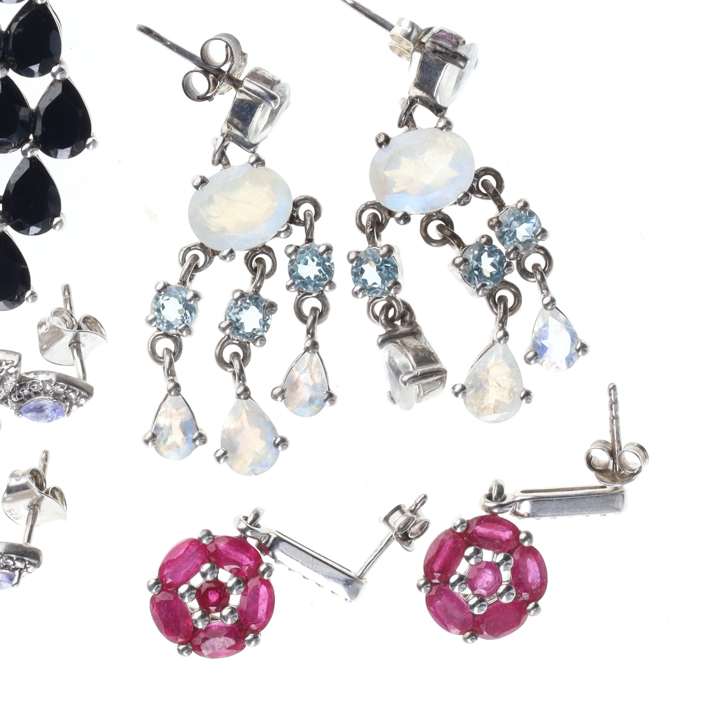 Sterling Silver Gemstone Earring Collection incl. Moonstone, Tanzanite, Ruby. Each pair is stamped sterling silver. This collection is in excellent condition. Weighs in total 30g.