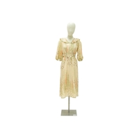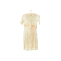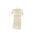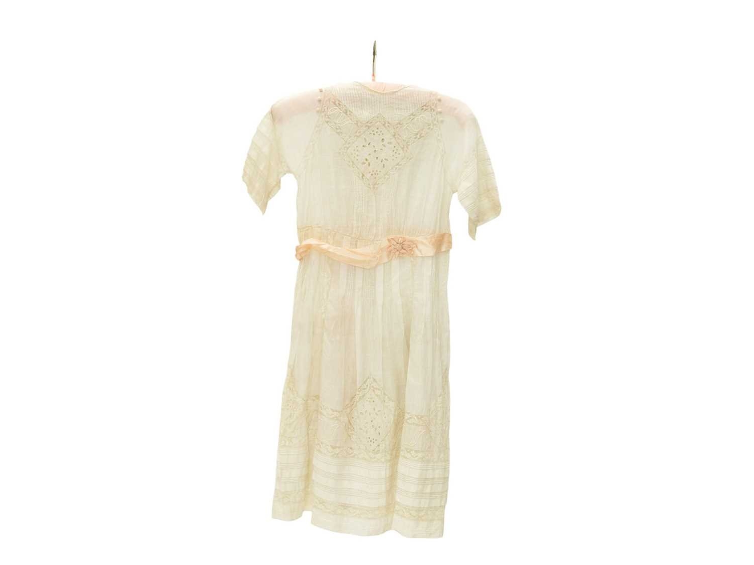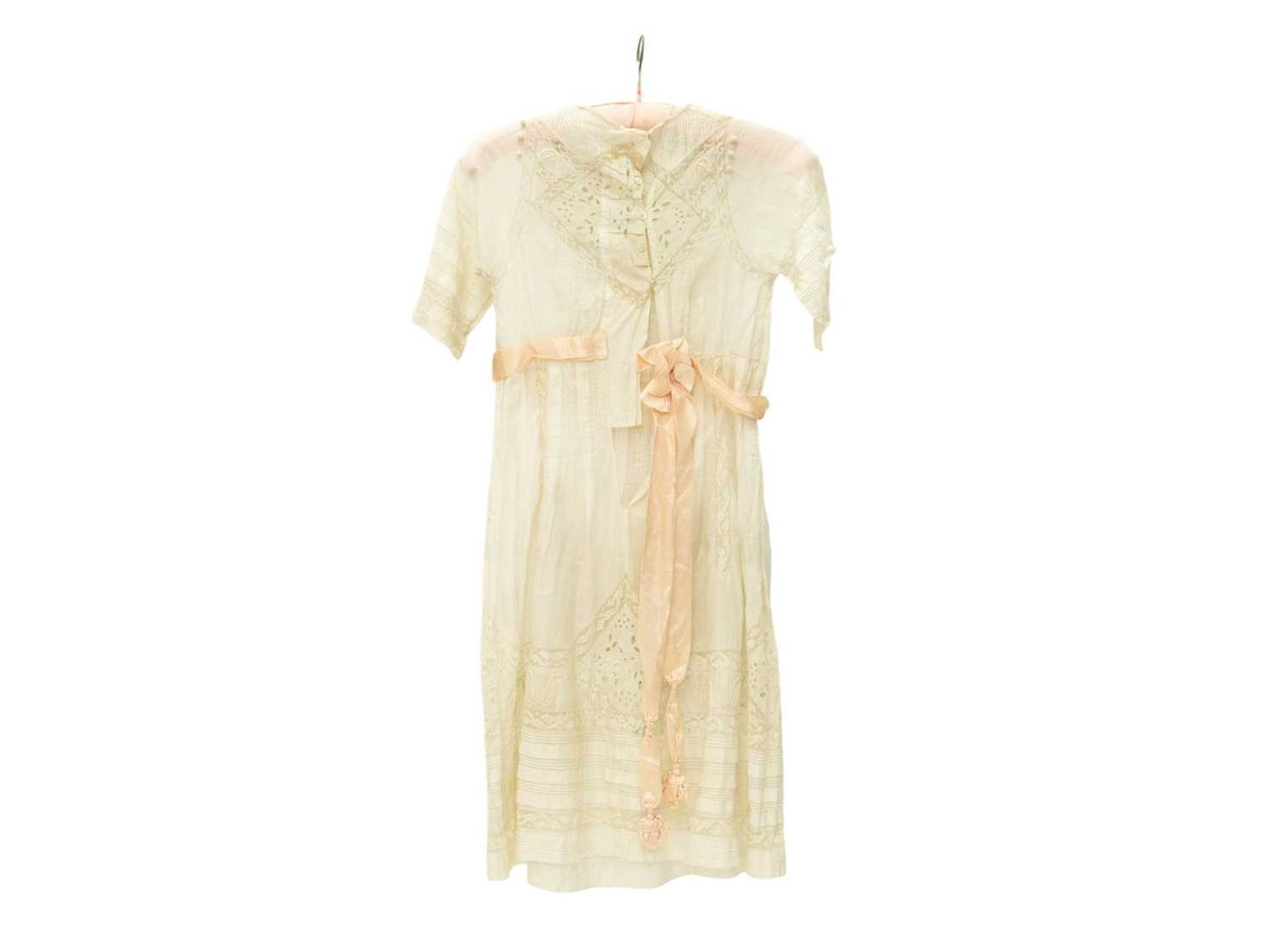 A girl's dress, circa 1900. White muslin with whitework embroidery and lace panels, mother of pearl button fastening to the back of the neck. With pale pink silk belt. Overall length 95.5cm.