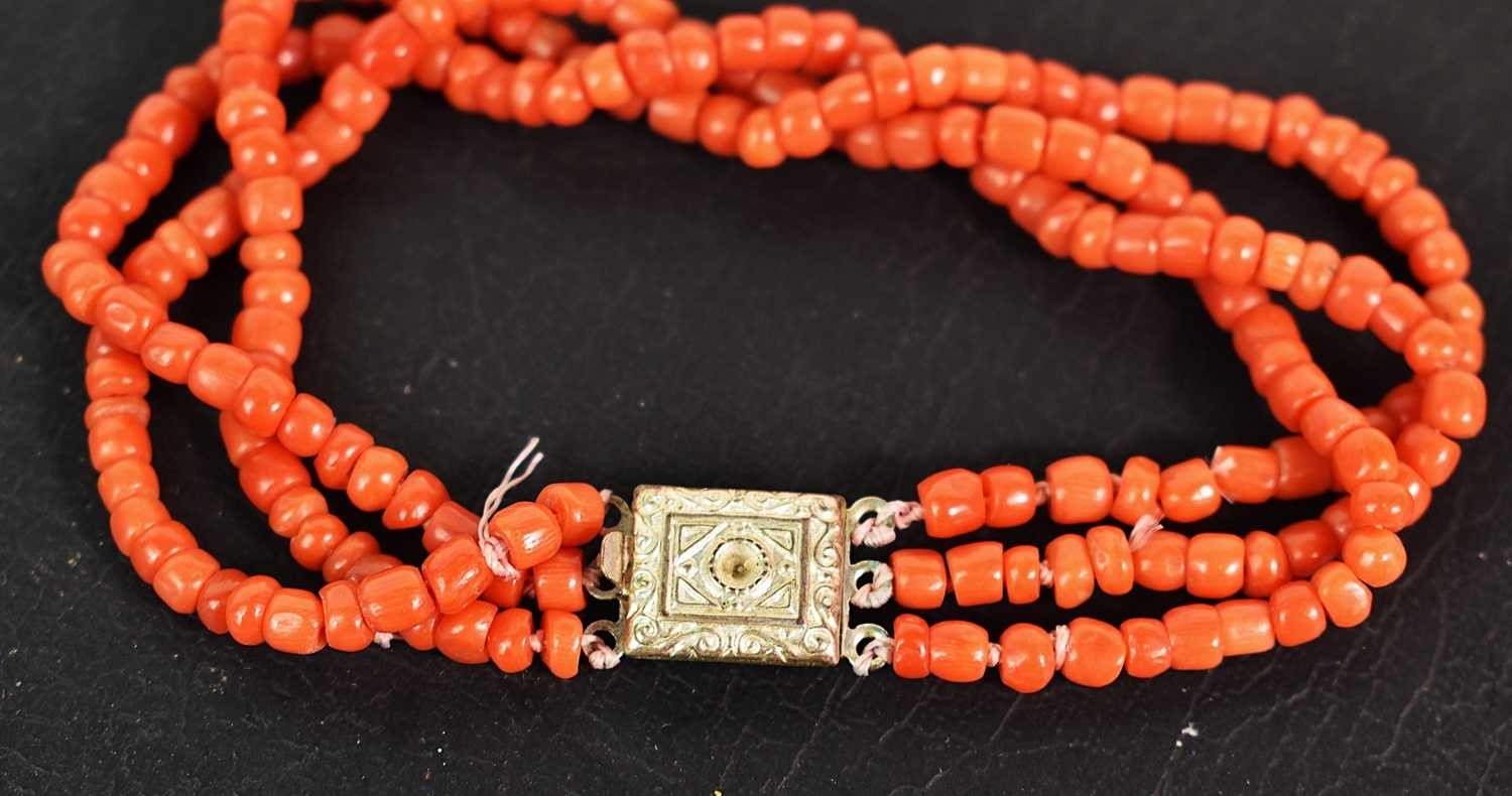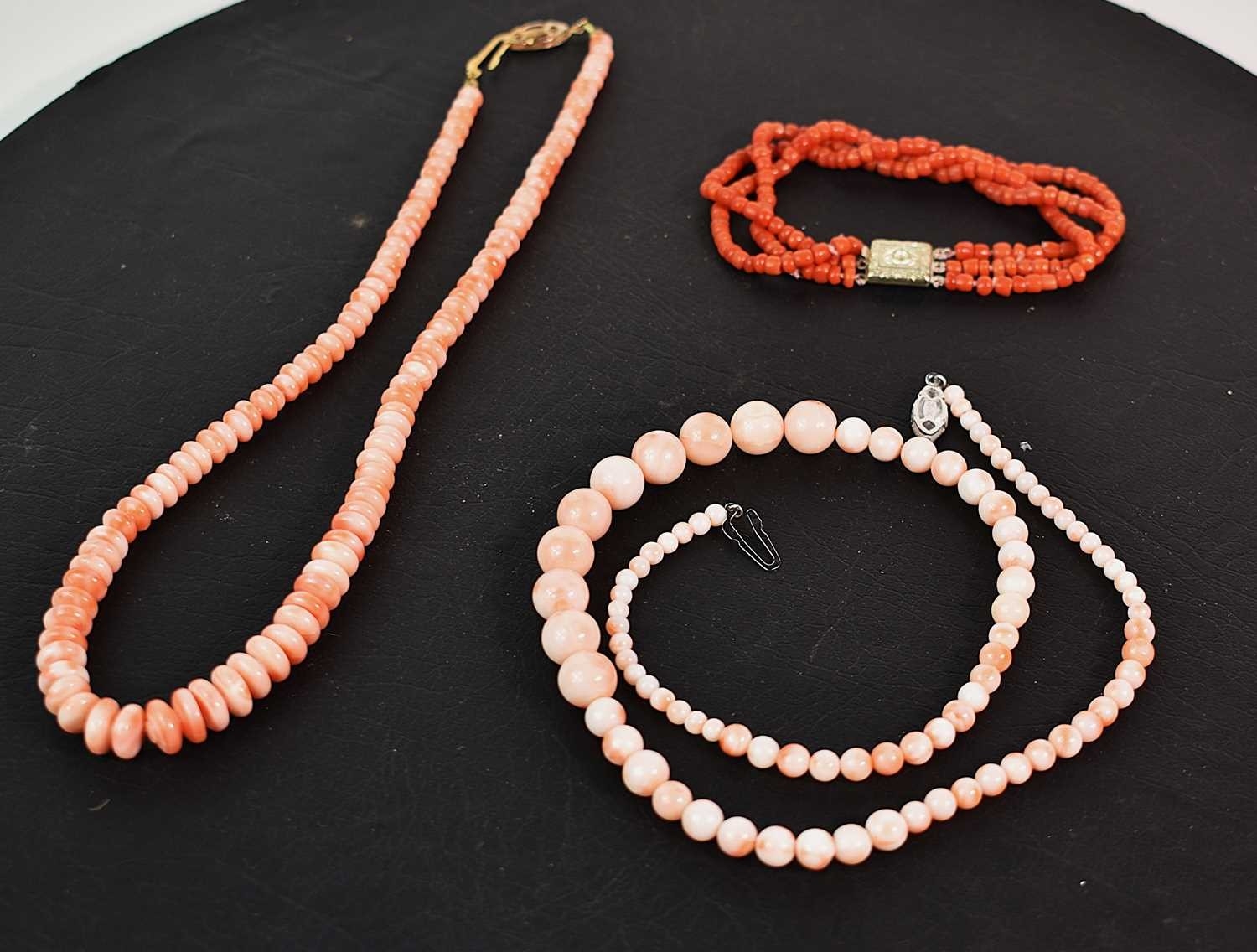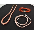 A group of coral vintage necklaces, to include a dark pink coral bead necklace and others.