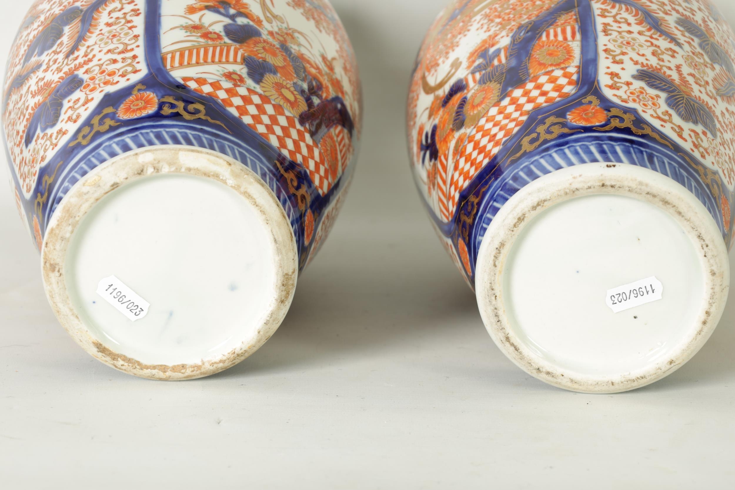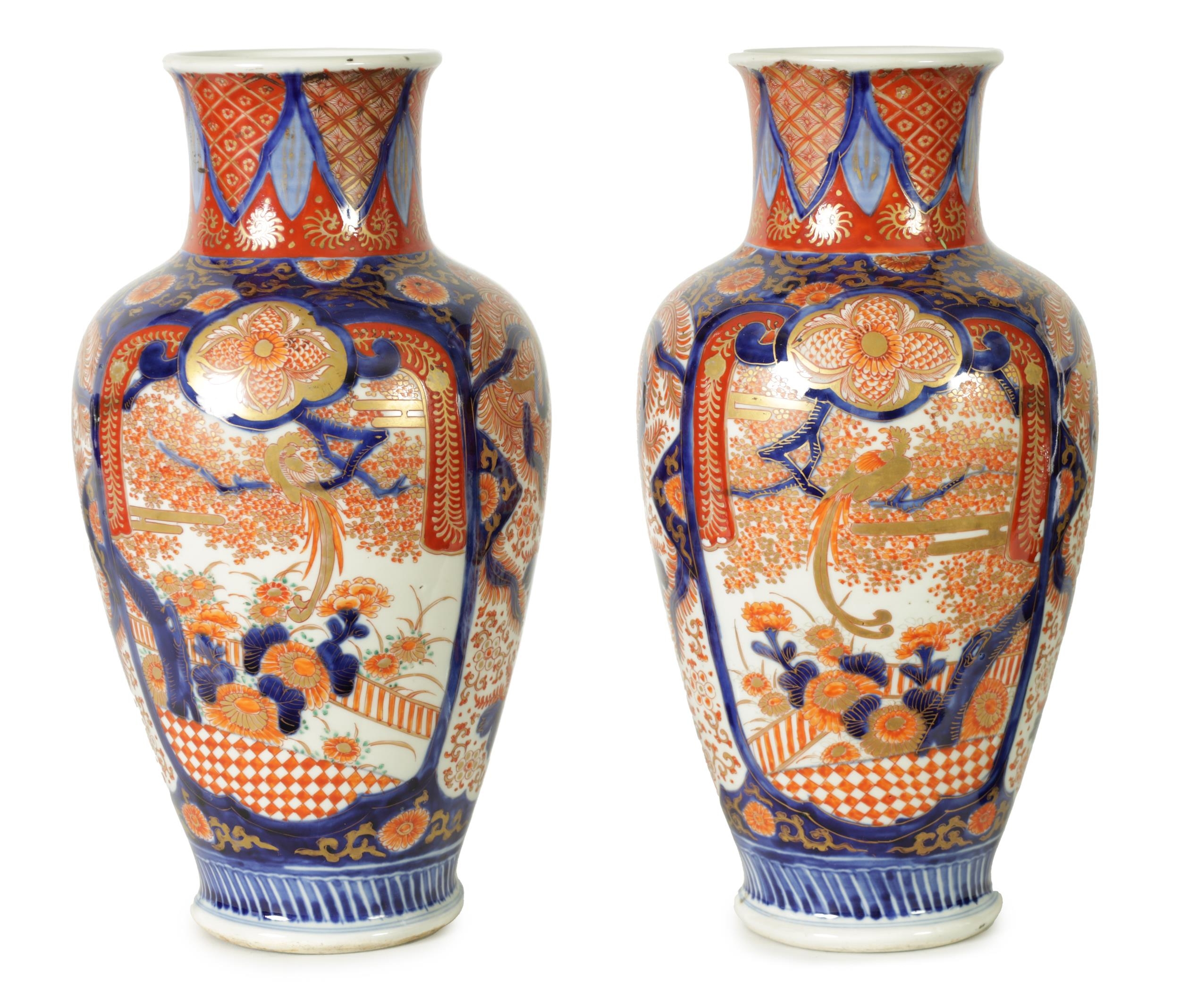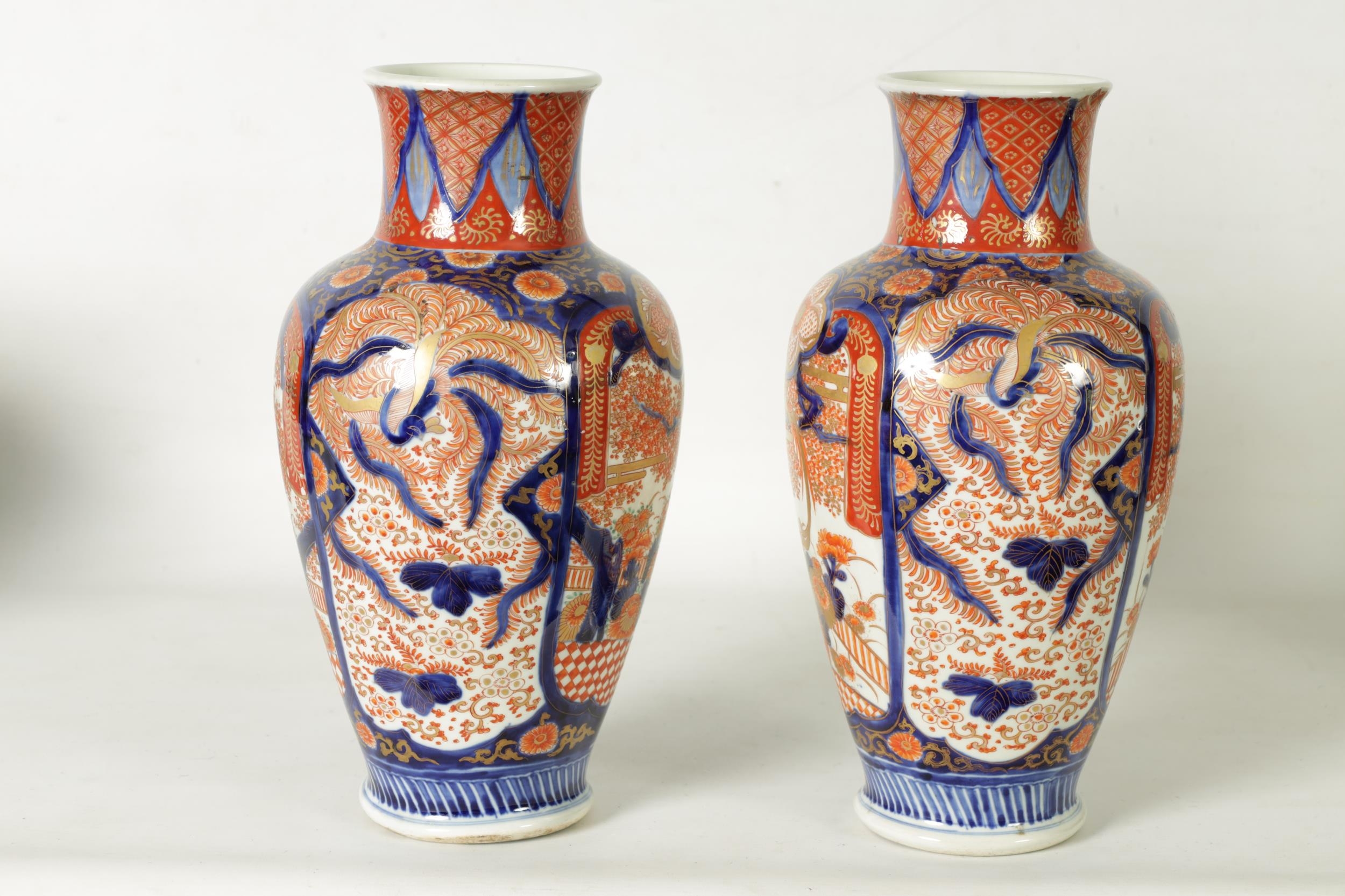 A GOOD LARGE PAIR OF 19TH CENTURY IMARI TAPERING SHOULDERED VASES decorated in the traditional palette with gilt highlights depicting garden scenes with birds divided by shaped scrolling leaf work panels and flowerhead rims beneath matching necks. (36cm high)