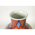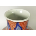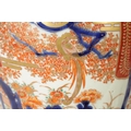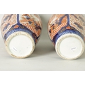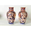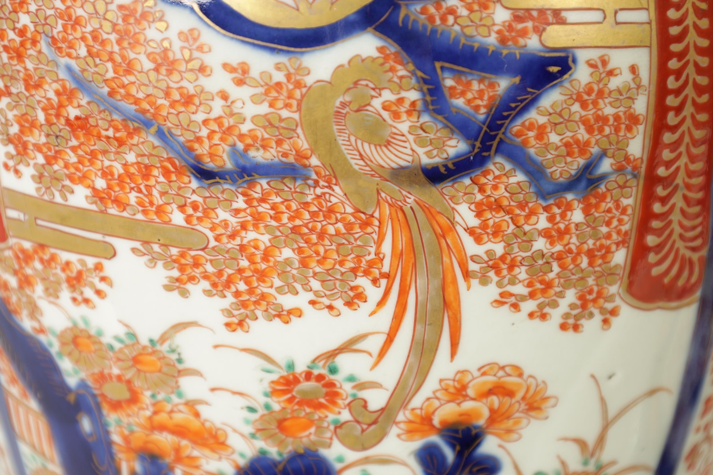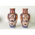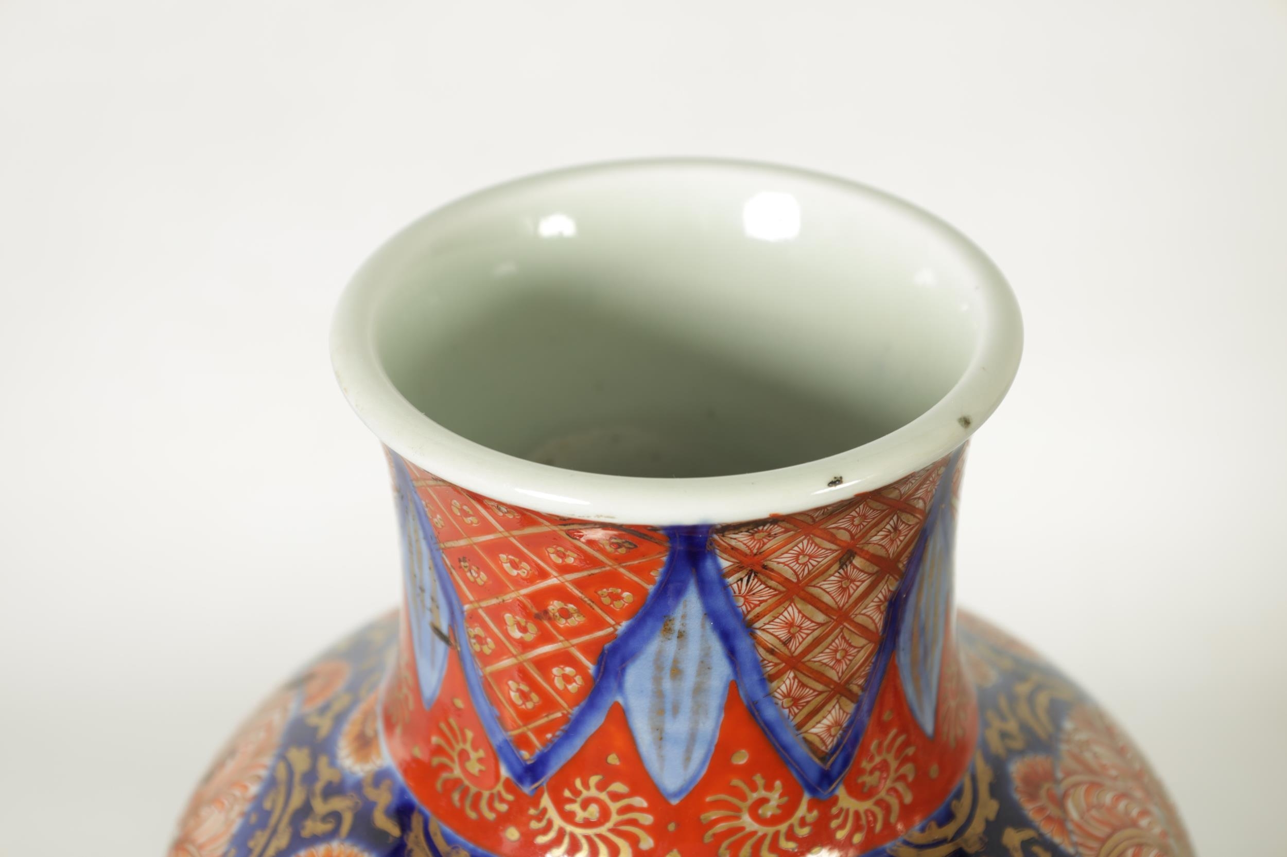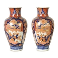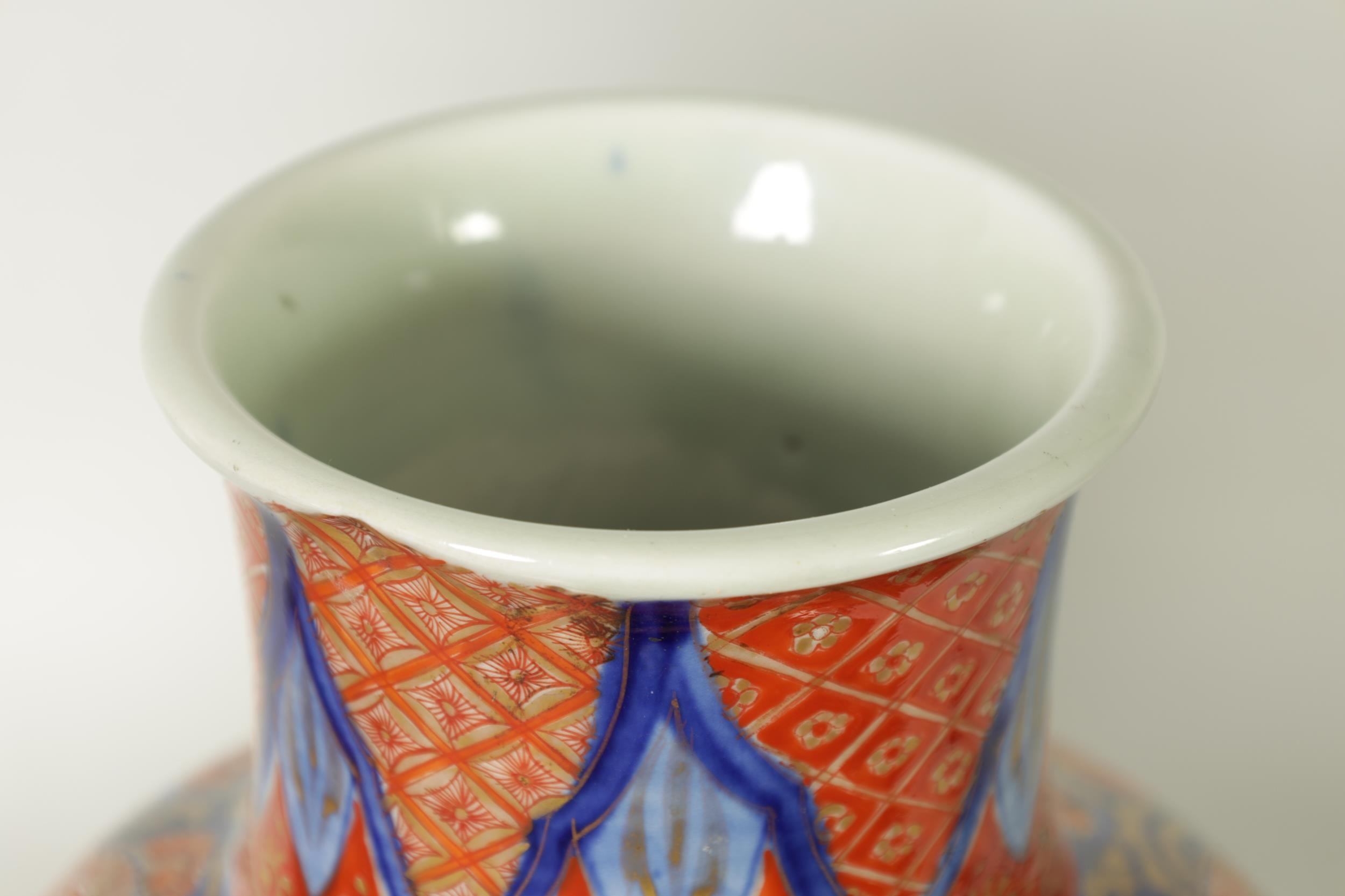 A GOOD LARGE PAIR OF 19TH CENTURY IMARI TAPERING SHOULDERED VASES decorated in the traditional palette with gilt highlights depicting garden scenes with birds divided by shaped scrolling leaf work panels and flowerhead rims beneath matching necks. (36cm high)