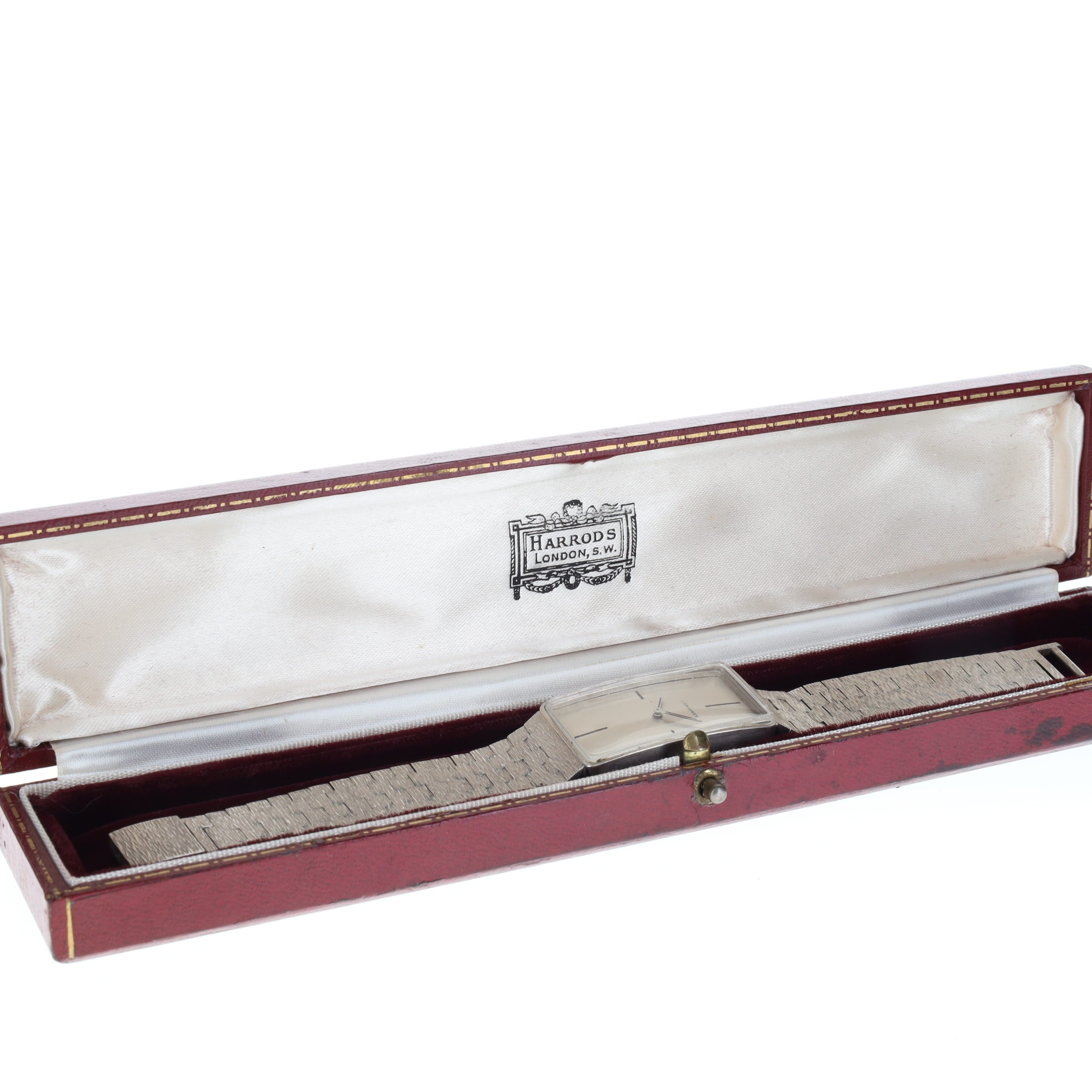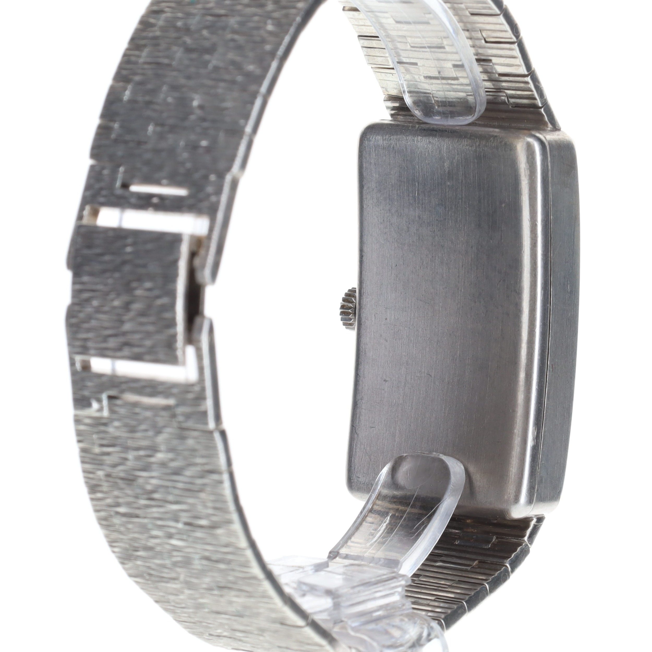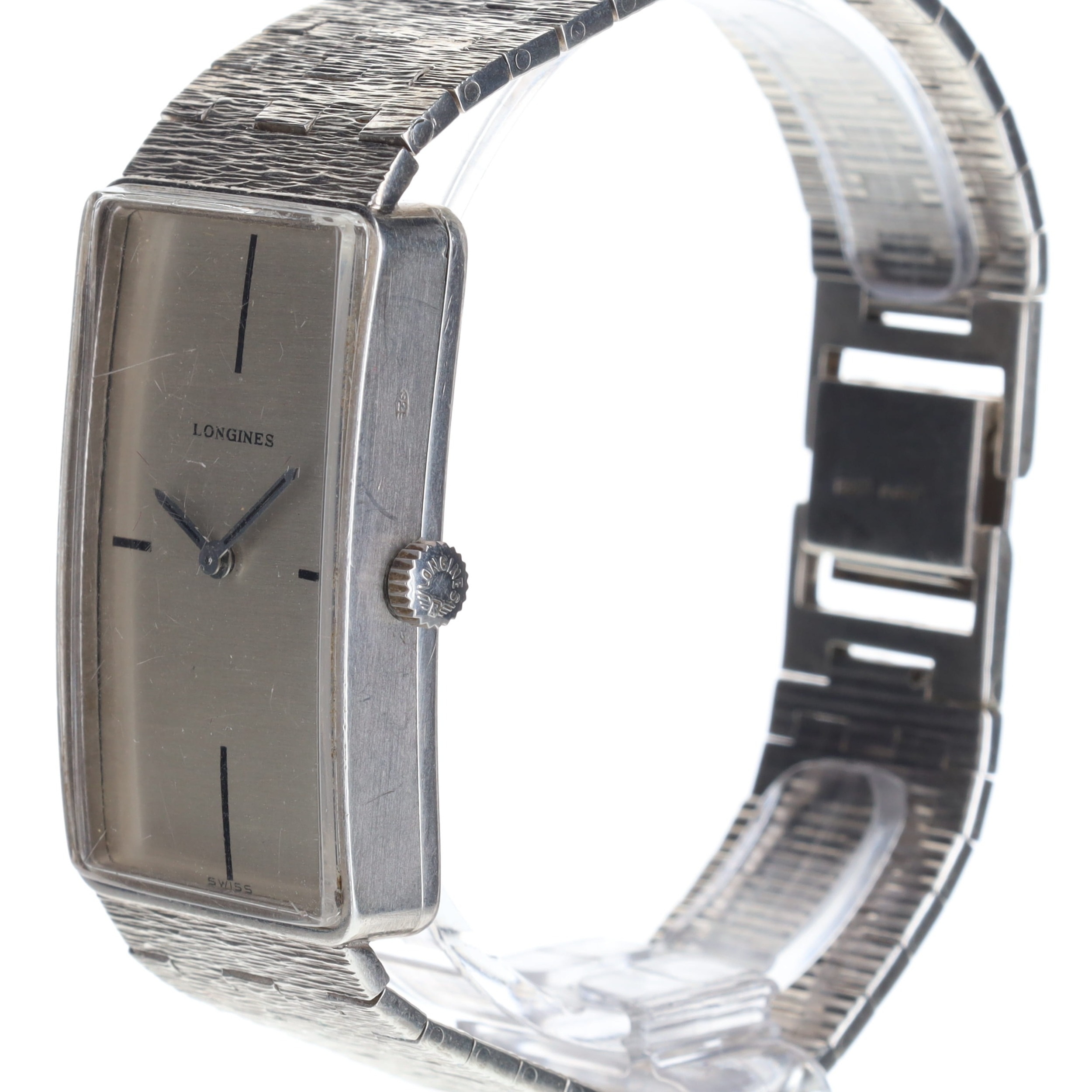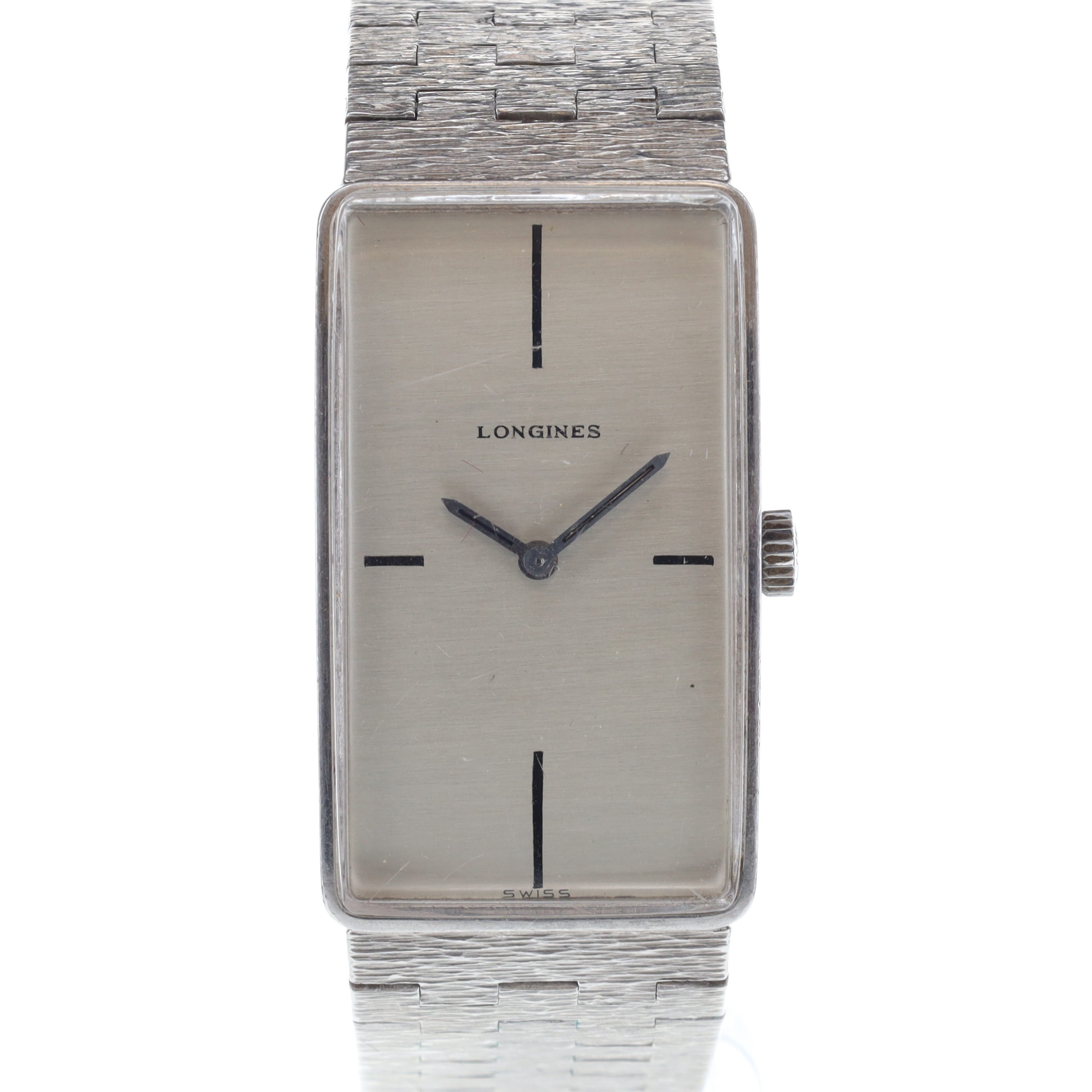 Longines - 925 Silver Rectangle 1970s Watch. Longines Cal. 5602 Hand-Wind movement. The case is made of Hallmarked 925 Silver. Integrated 925 Silver bracelet. Acrylic crystal (few scratches). Silvered dial minimal design, stick hour markers. Dial signed 'Longines'. The watch is working, winds & runs. Includes Harrods box and Longines plastic sleeve, but does not include papers.