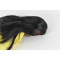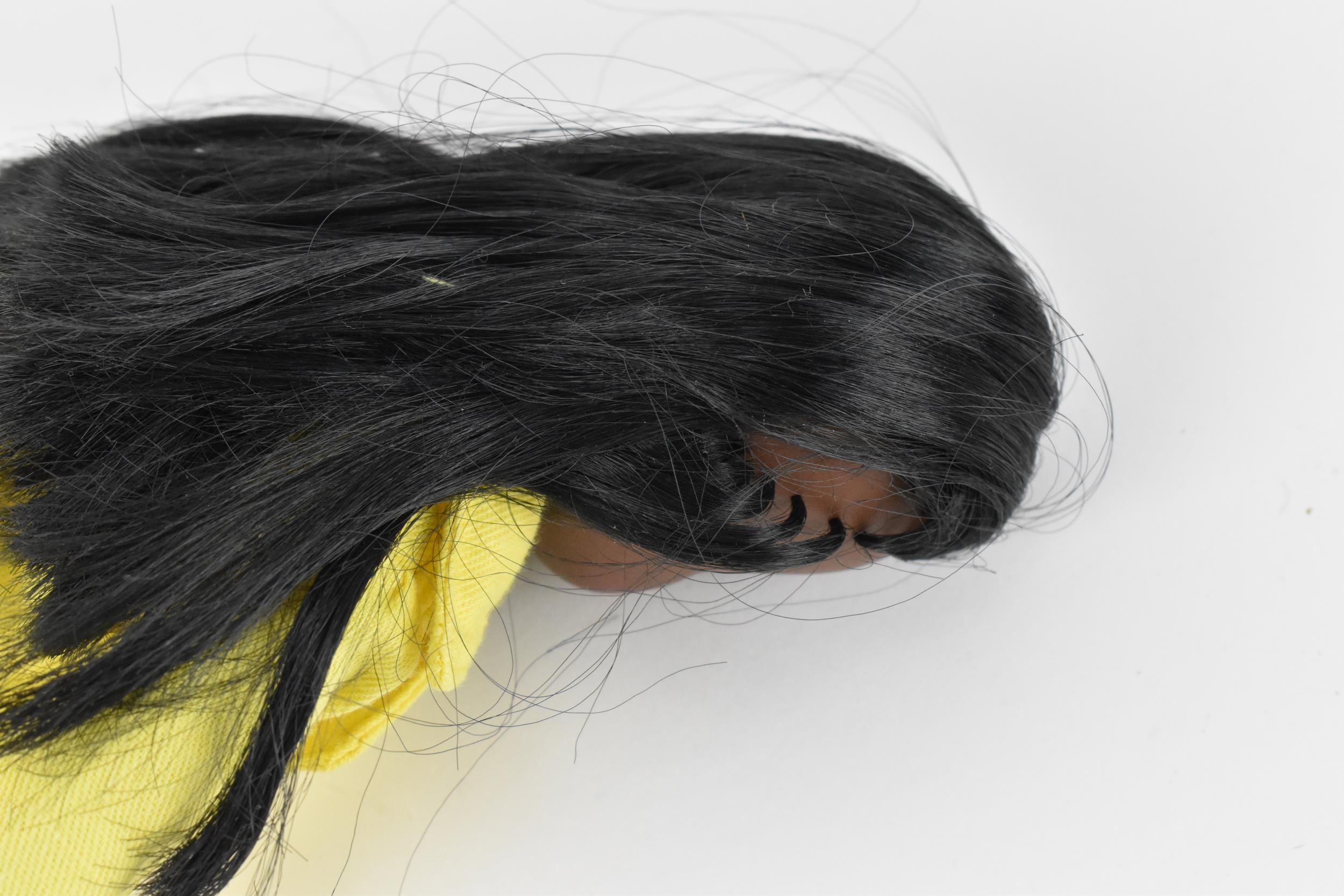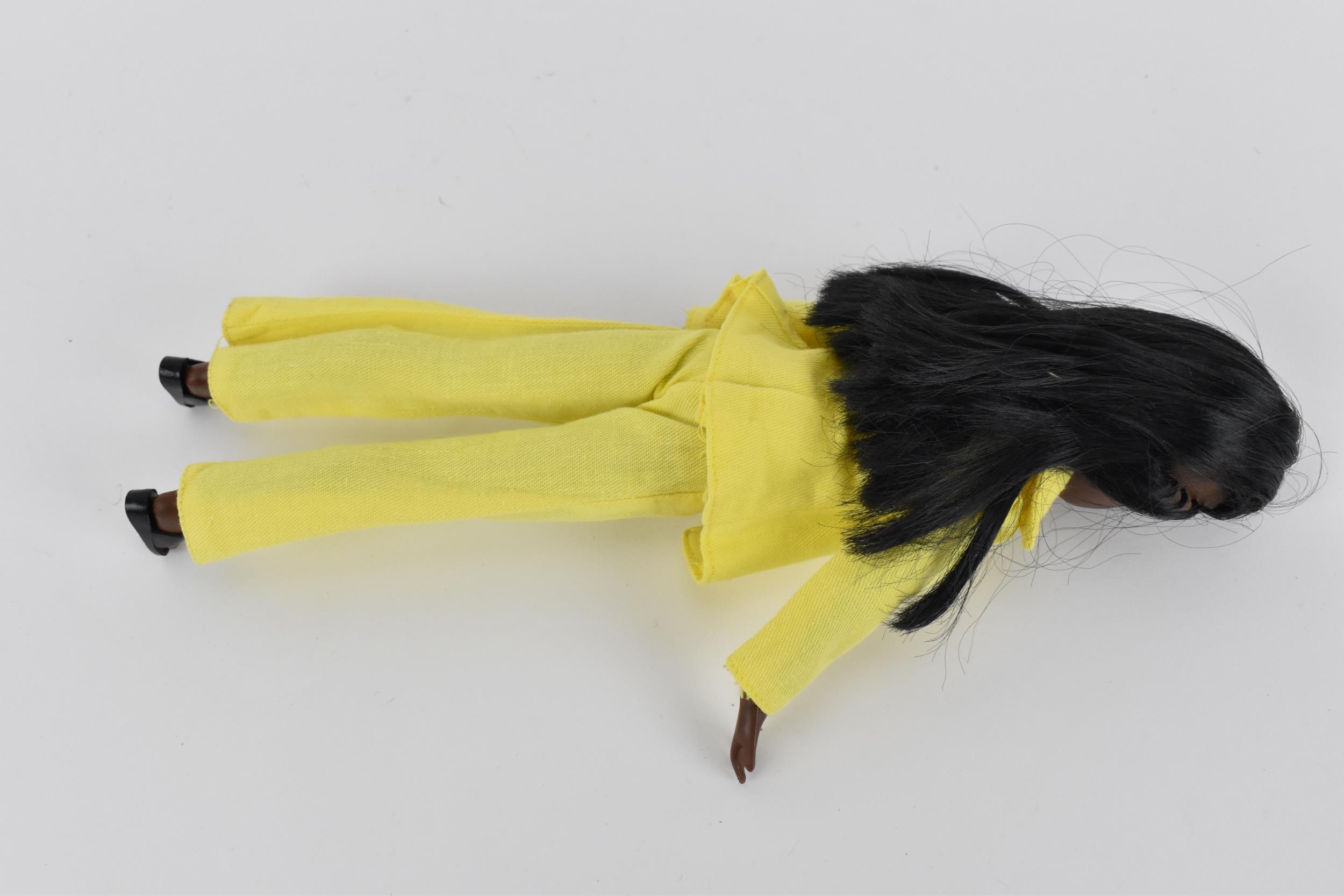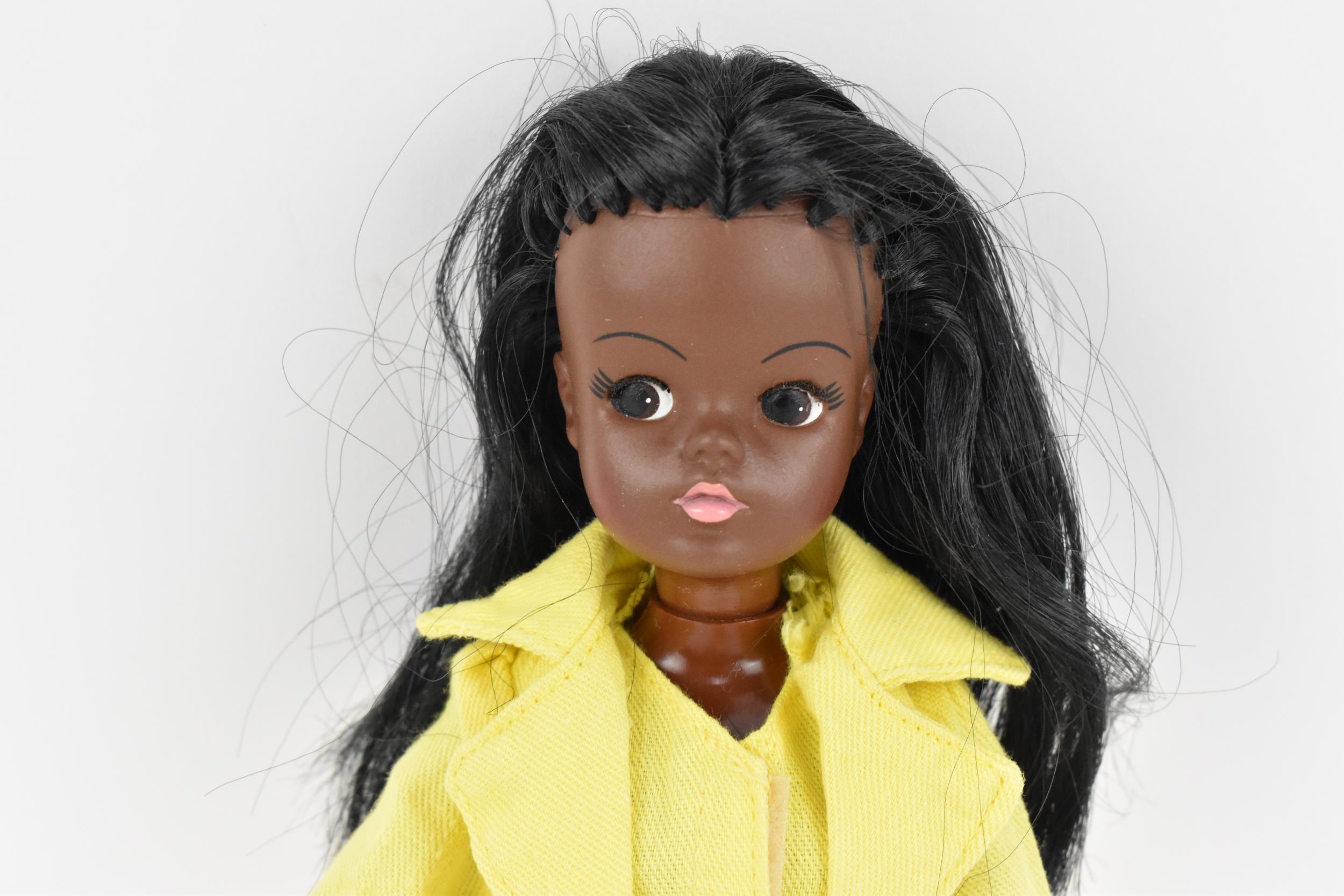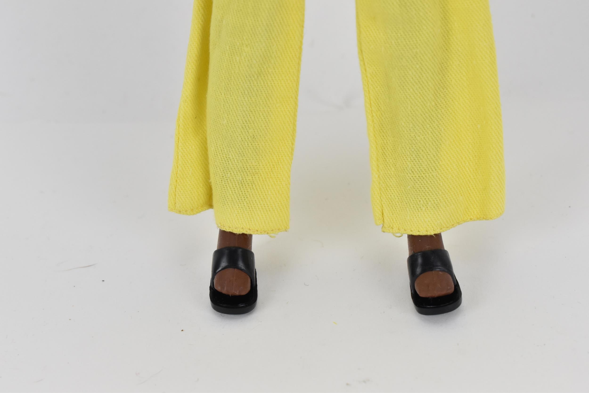 A vintage Sindy's friend Gayle doll in a yellow pant suit, with additional black mules, with painted eyebrows, eyes and pink lips