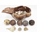 Large hollowed root bowl, 55cm long, a collection of shells including a lightning whelkshell and five feathered covered balls