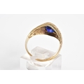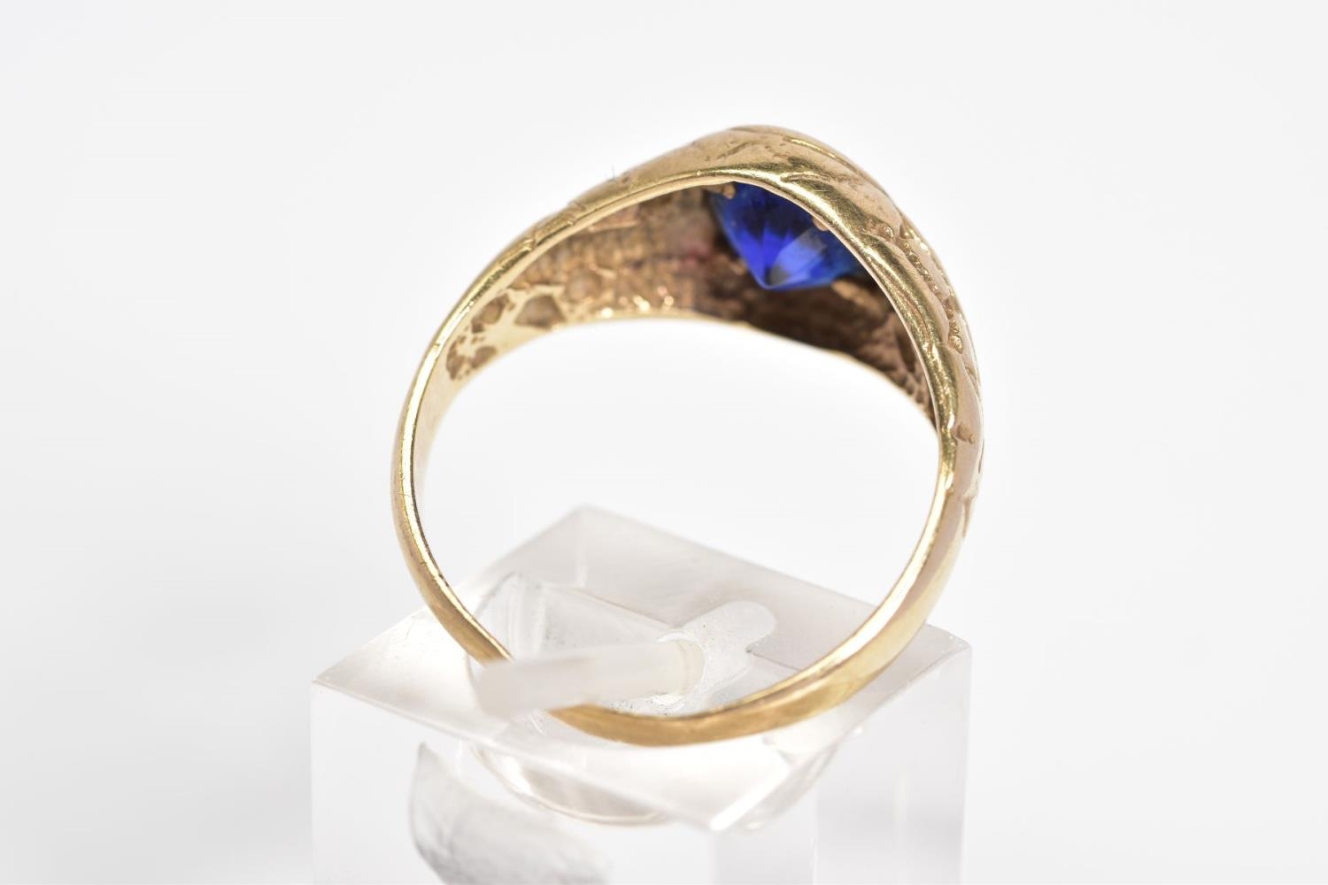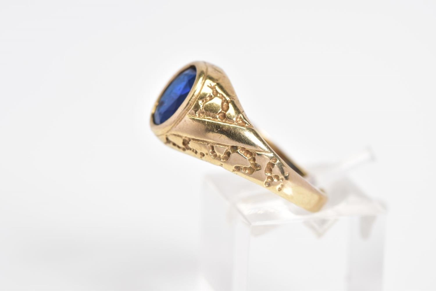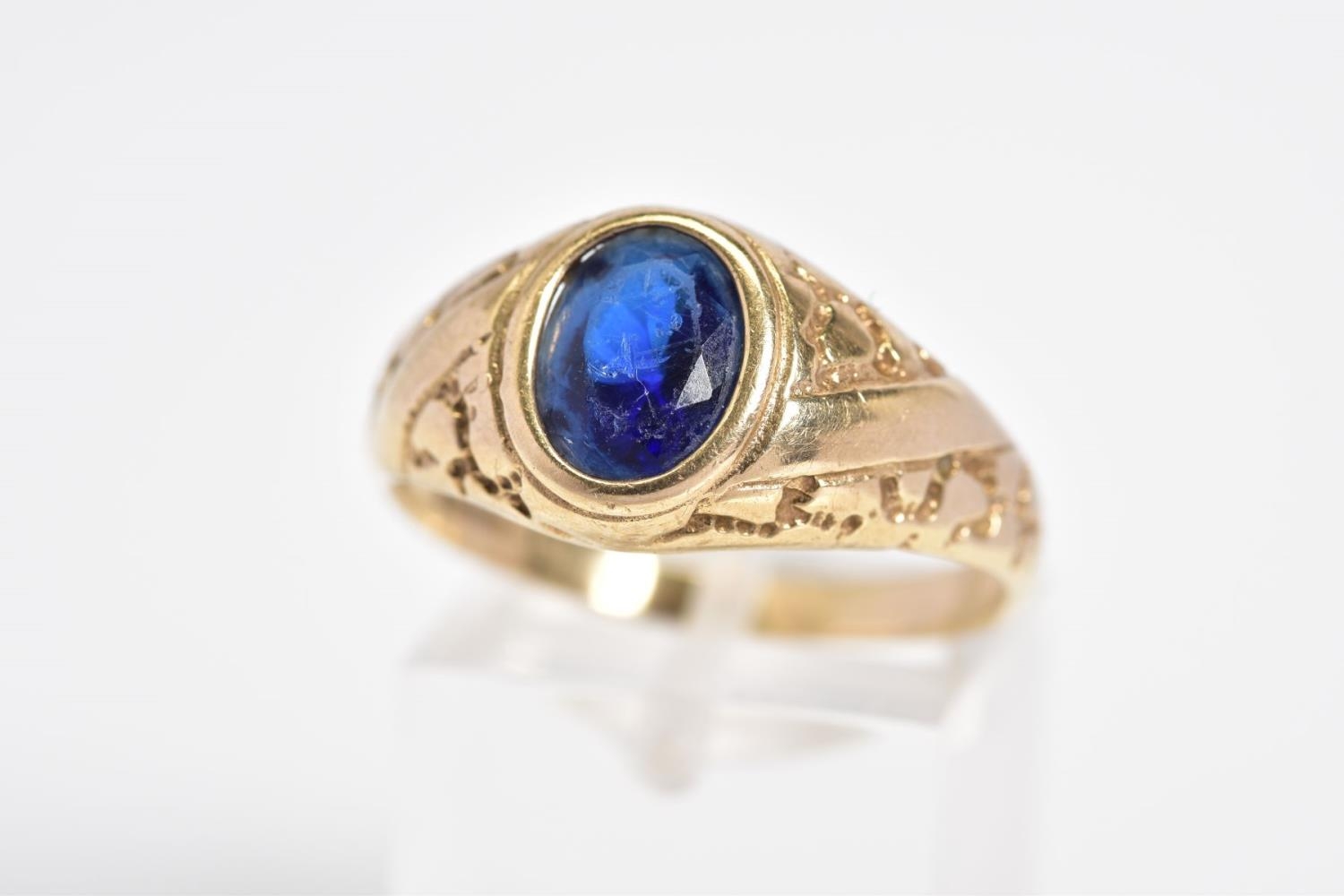 A 9CT GOLD GENTLEMENS SIGNET RING, designed with a central oval cut blue stone assessed as paste within a collet mount to the engraved detail shoulders and plain polished band, with a 9ct hallmark for Birmingham, ring size S, approximate weight 3.7 grams