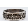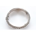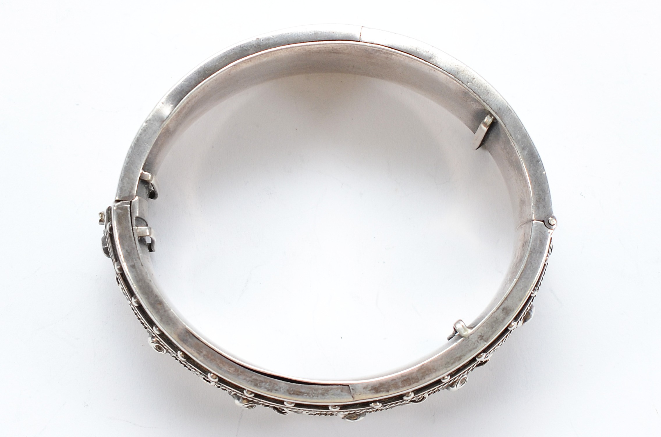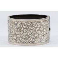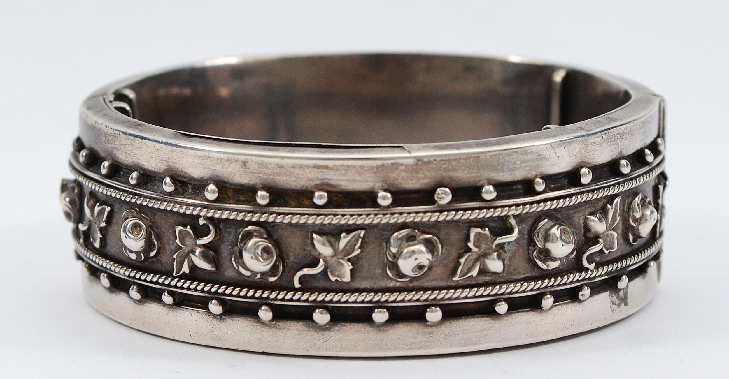 A silver hinged bangle, floral detail to the front, engraved with initials and the date September 7 1876, 40g