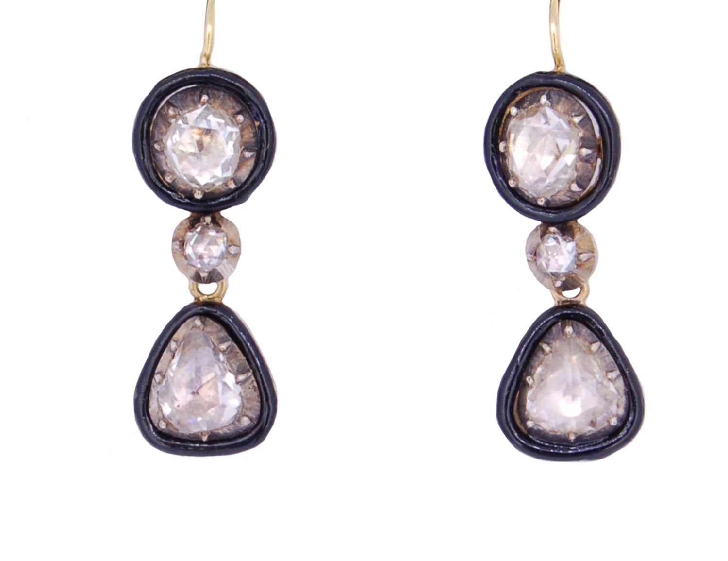 ANTIQUE PAIR OF ENAMEL AND DIAMOND DROP EARINGS, each set with a larger rose cut diamond, suspending a smaller diamond and a larger rose cut diamond. The 2 larger rose cut diamonds on each earring surrounded by black enamel. L. 3.5 cm. 9.4 grams.