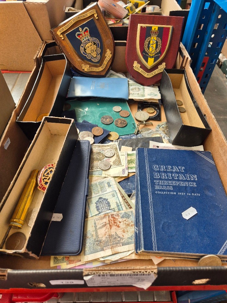 A box of UK and World coins & banknotes, heraldics, etc.