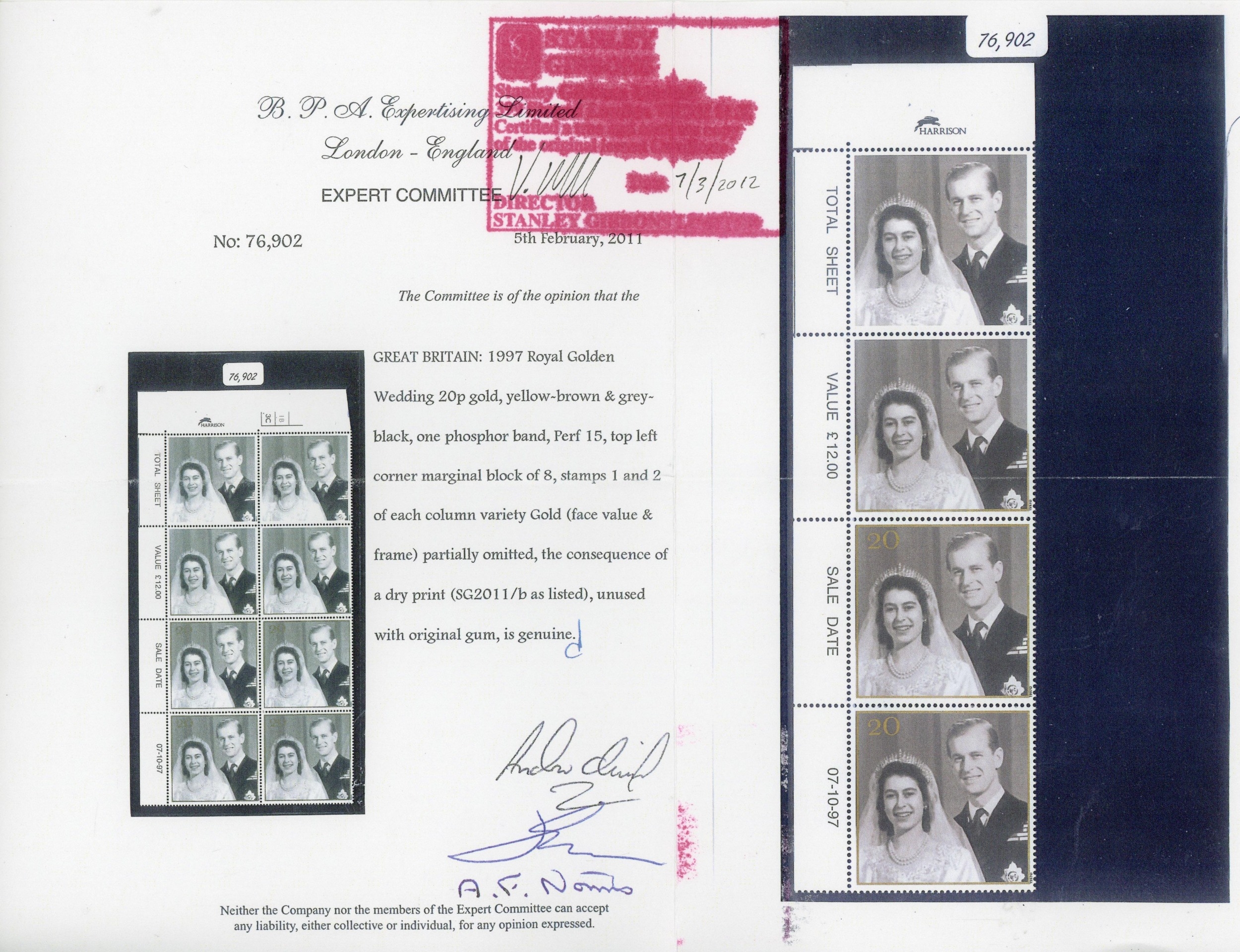 GB SG 2011b 1997 20p Golden Wedding gold omitted in strip of 4 mint