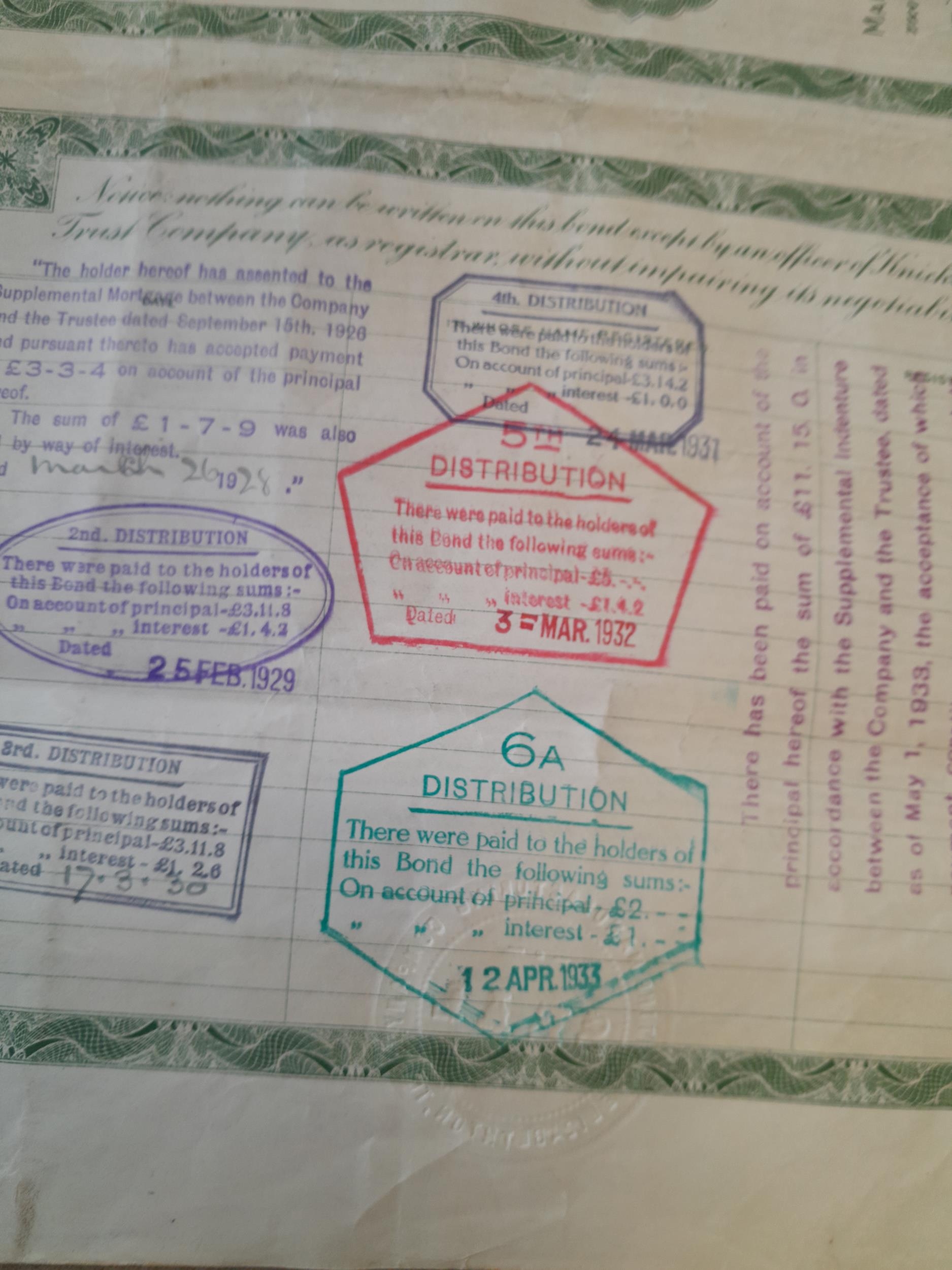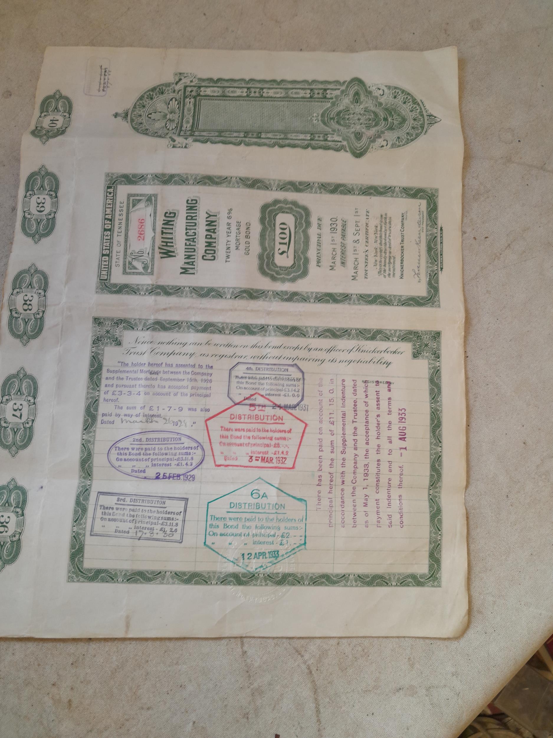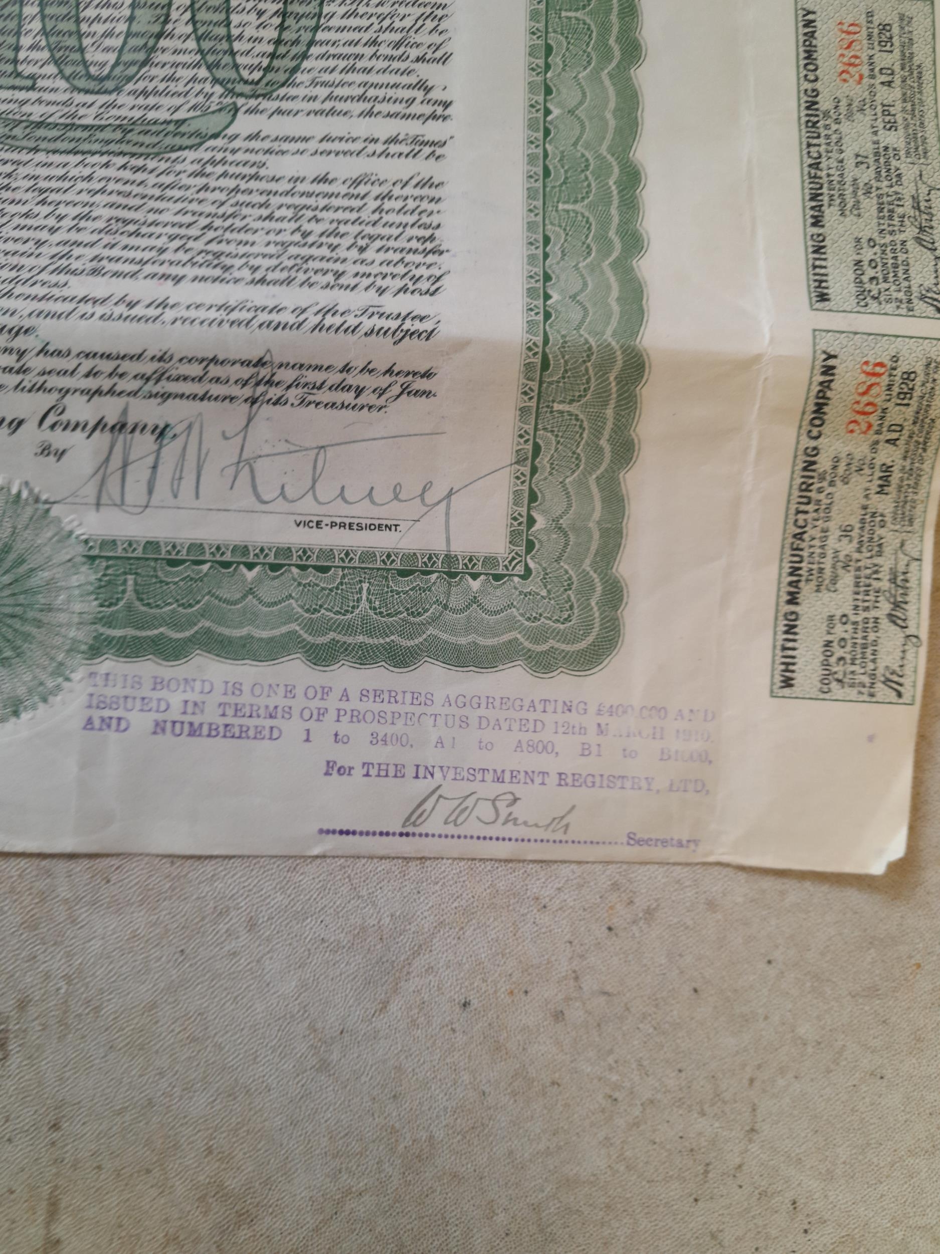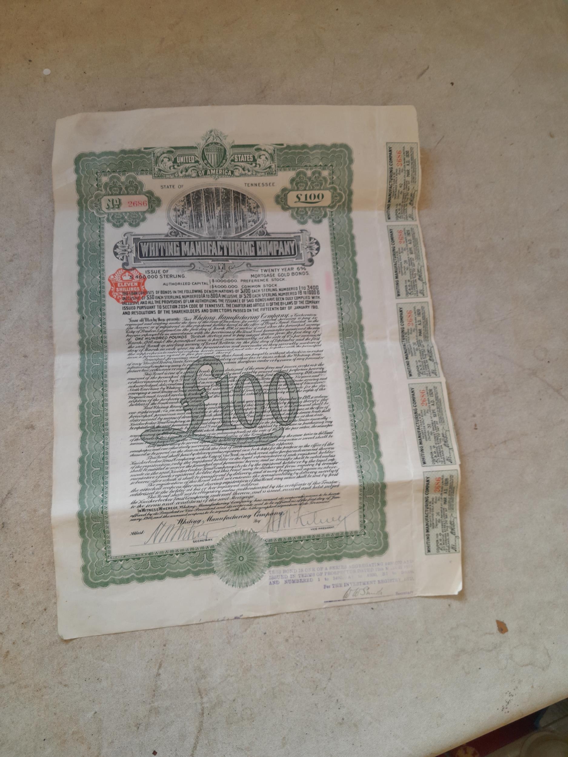 Vintage Payment Bond Whiting Manufacturing Company £100 from the 1920s