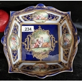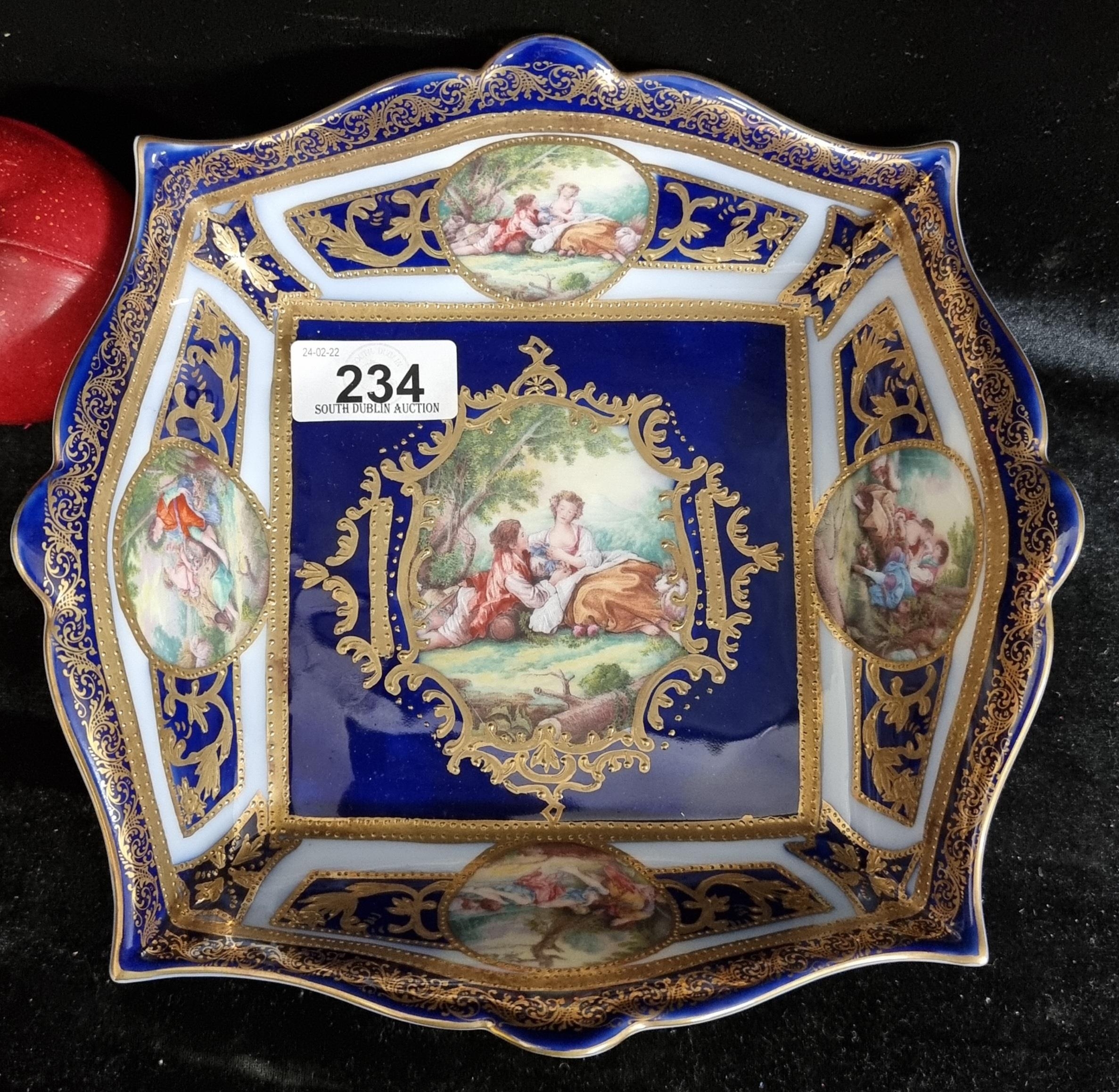 An ornate porcelain dish with cobalt blue glaze, gilt detail and courting scenes. Stamped with ''Sèvres'' porcelain mark to base.