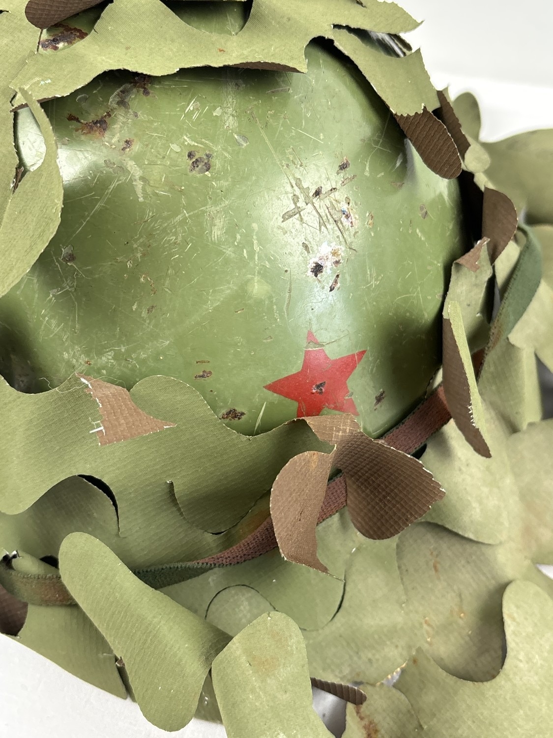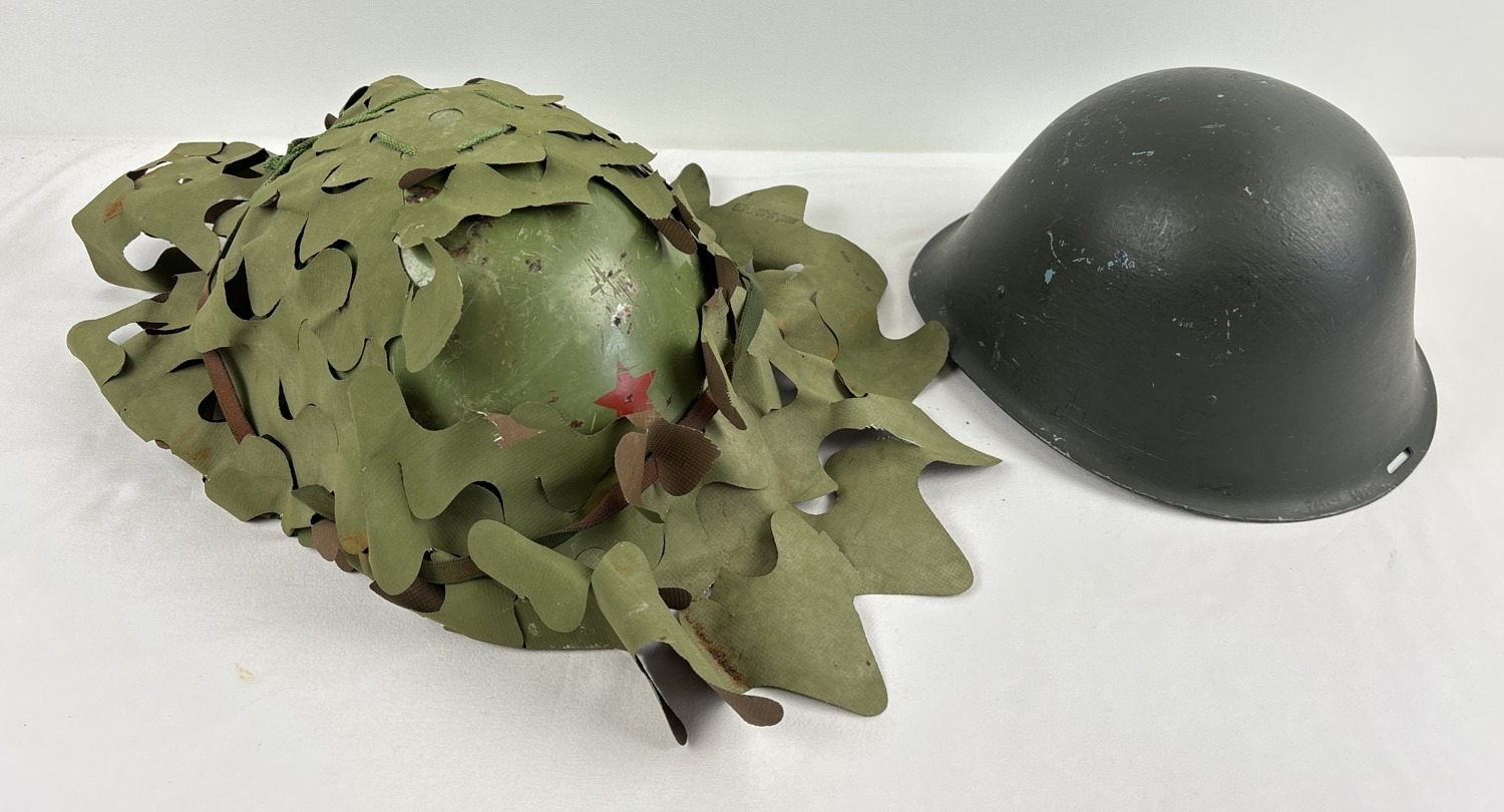 Yugoslavian NE44 steel helmet of the Cold War era, recovered from Kosovo. Complete with liner, chinstrap and scrim cover, dated 1983. Red star on front crown. Various names inscribed including Zlatko, Kasim.