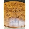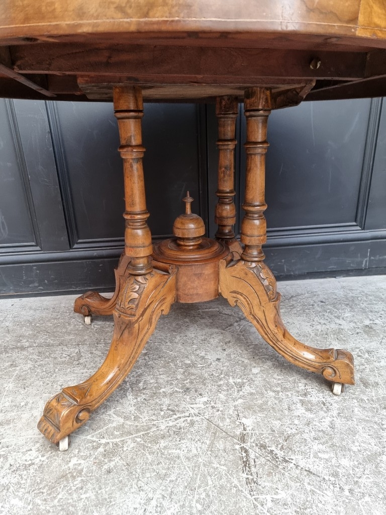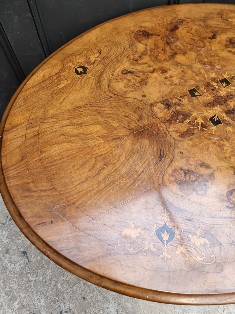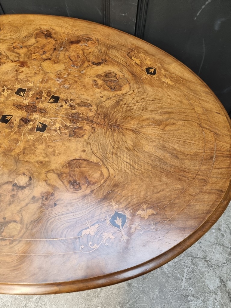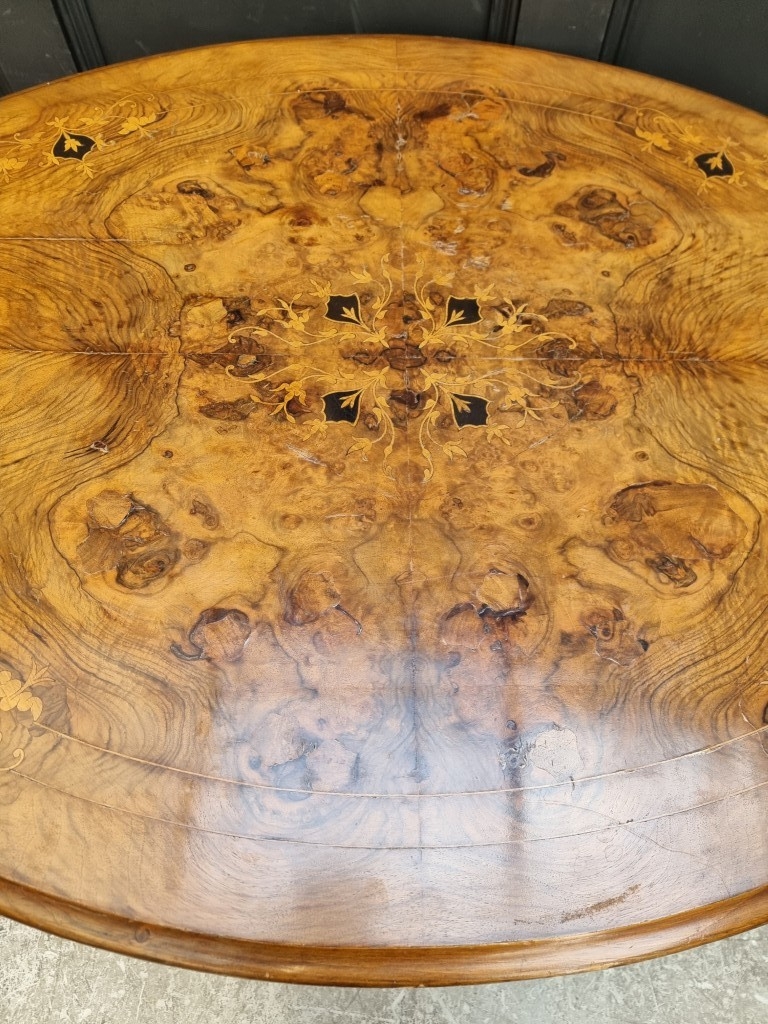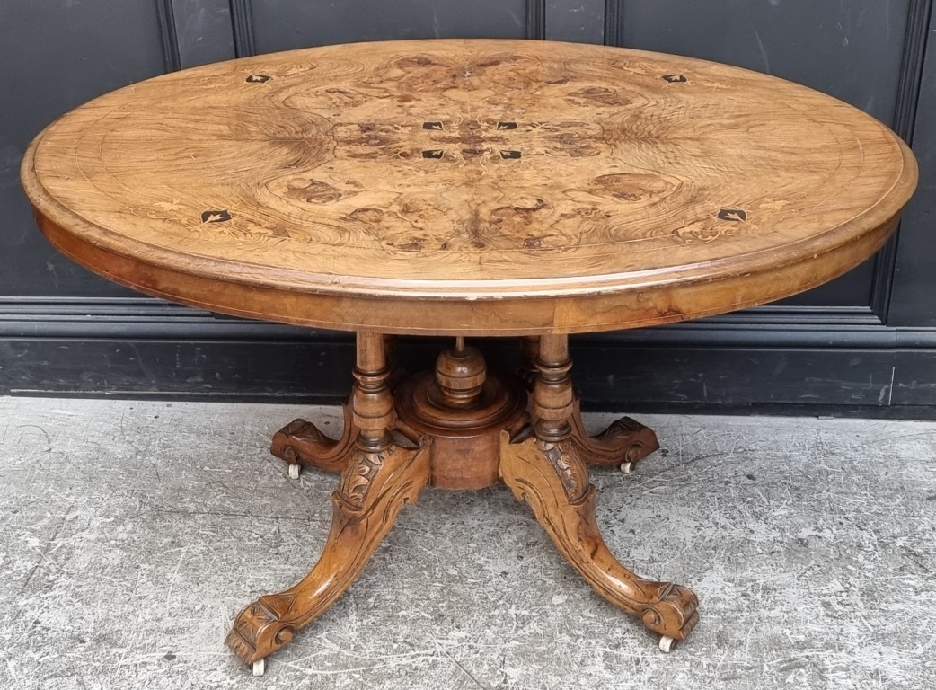 A Victorian figured walnut and inlaid oval tilt-top loo table, 118cm wide.