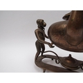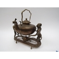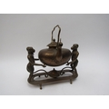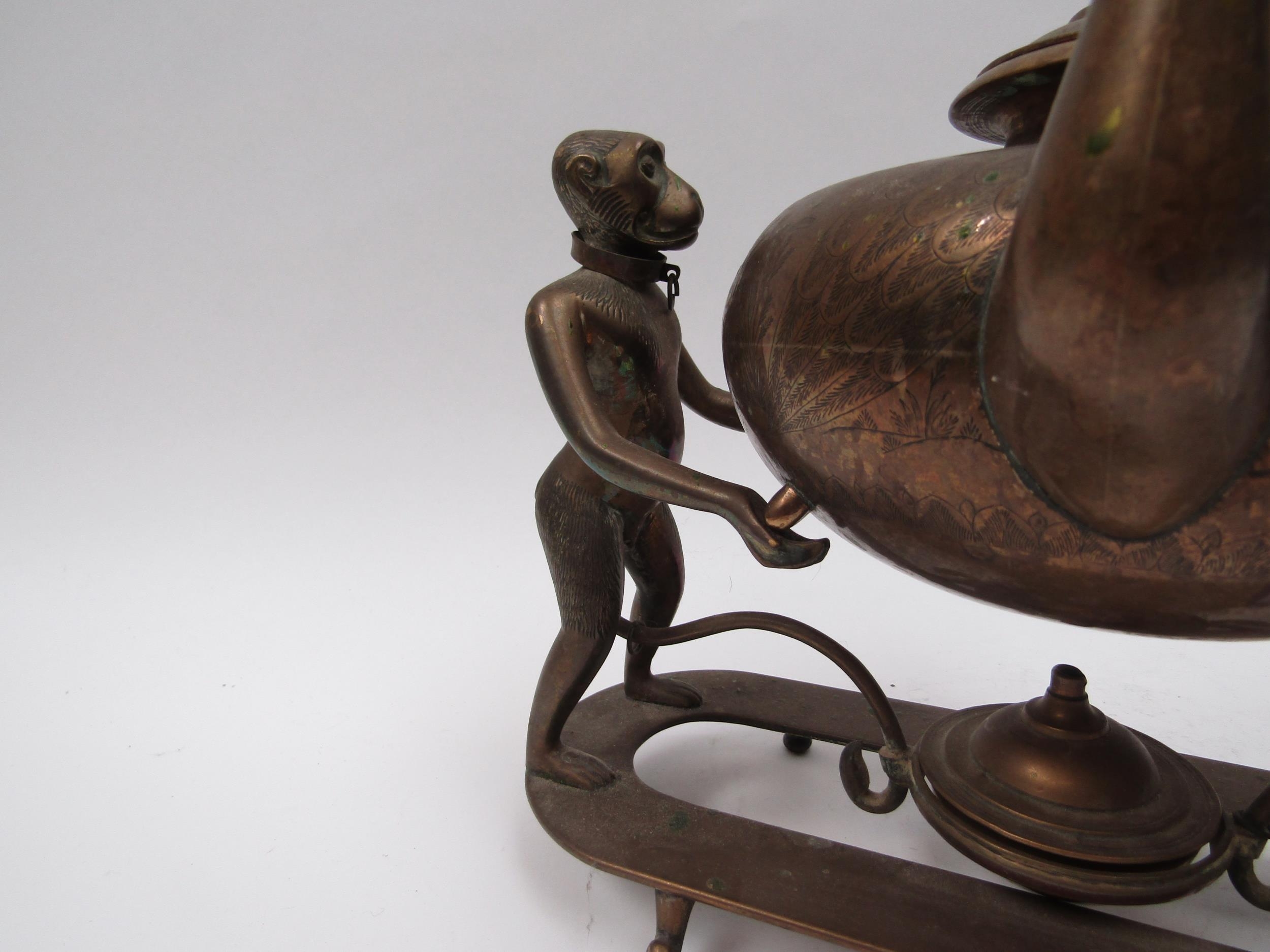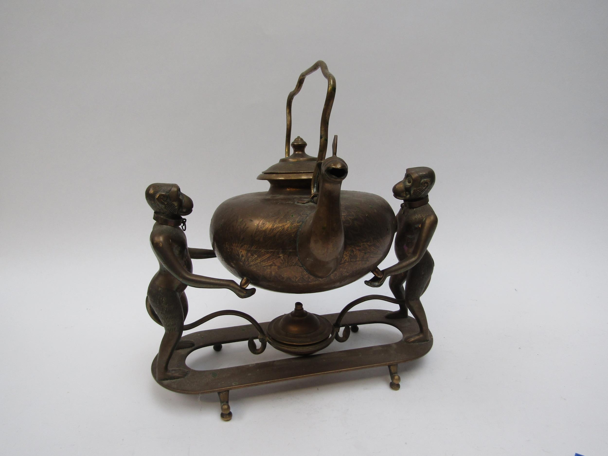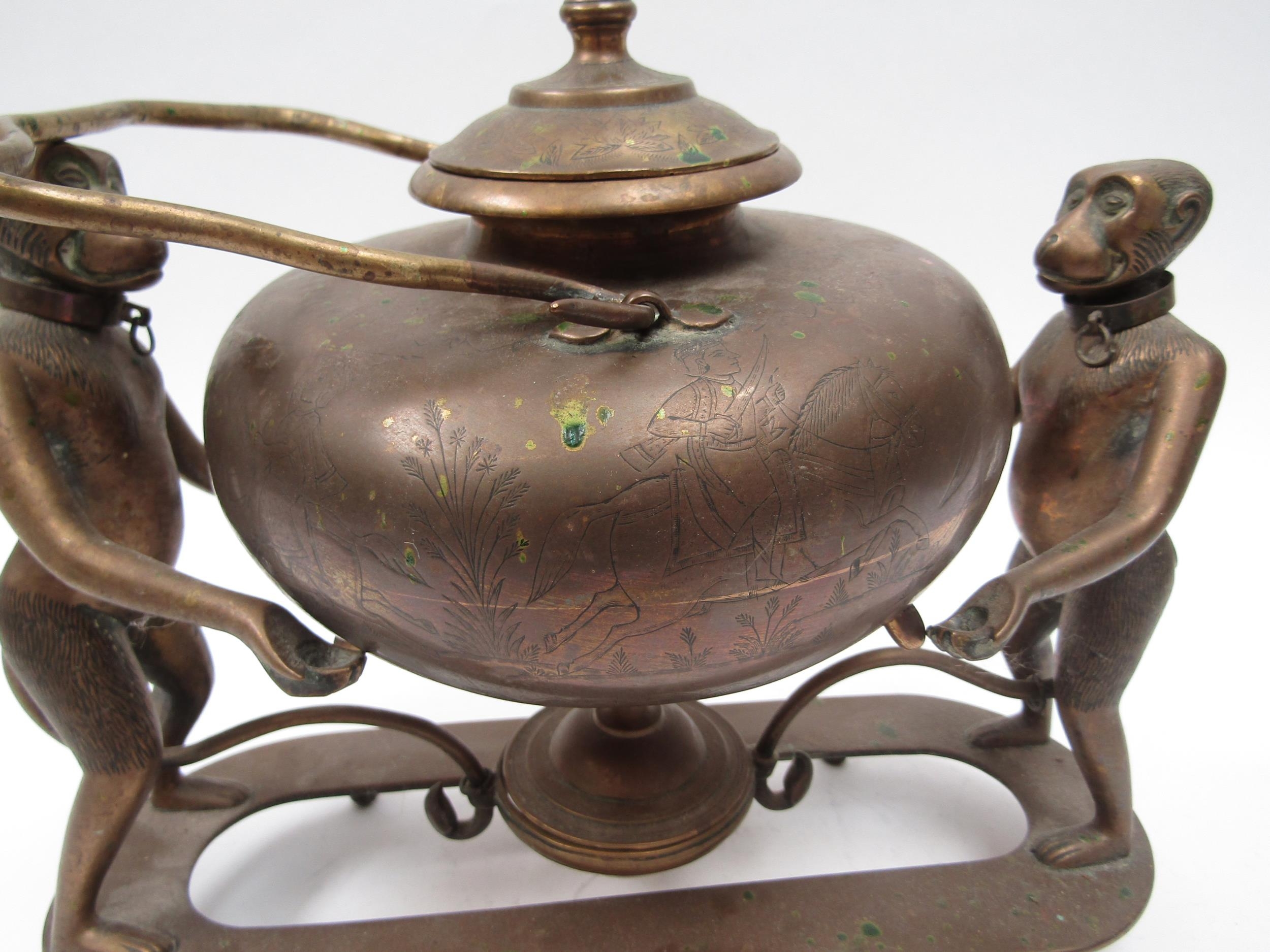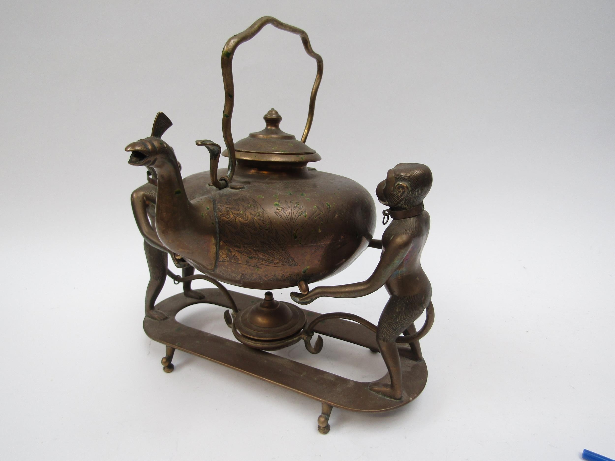 An Edwardian brass Indian Colonial spirit kettle with standing monkey support, engraved decoration, dents to kettle, 23cm x 27cm