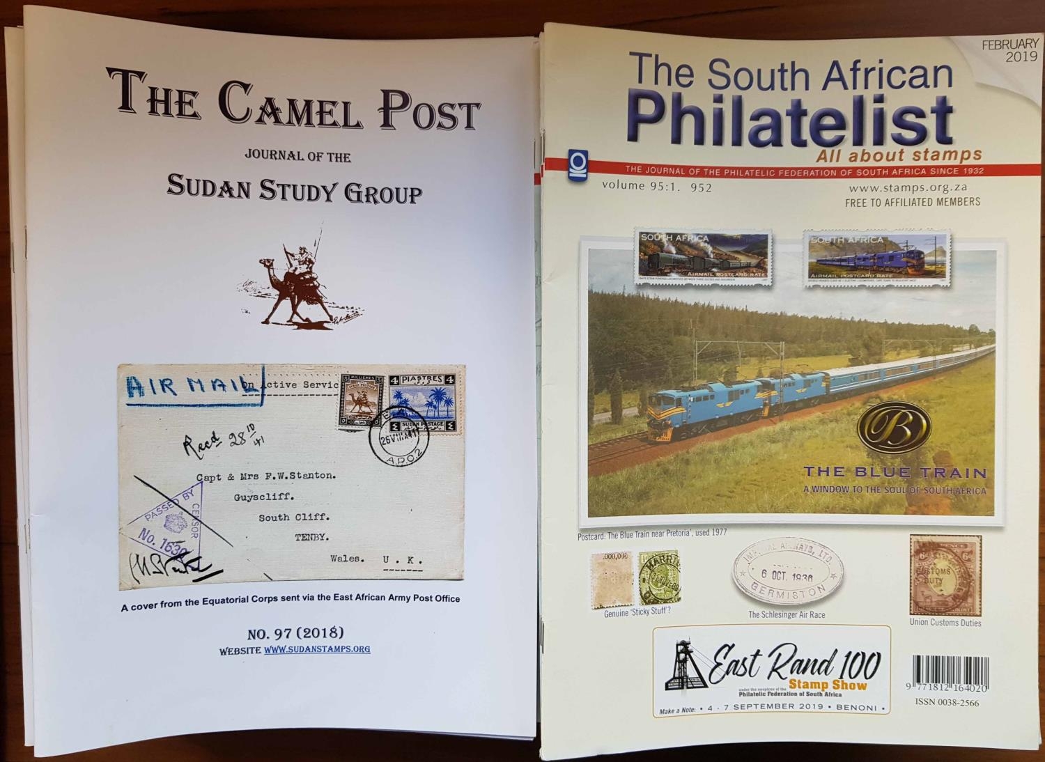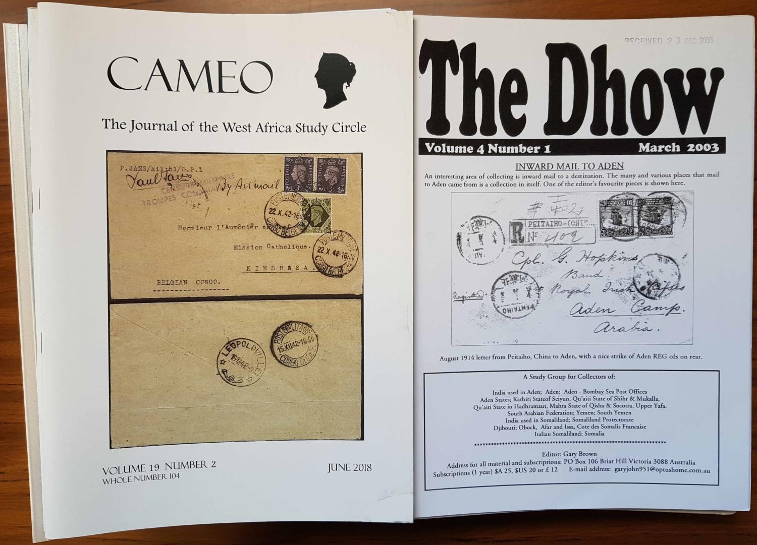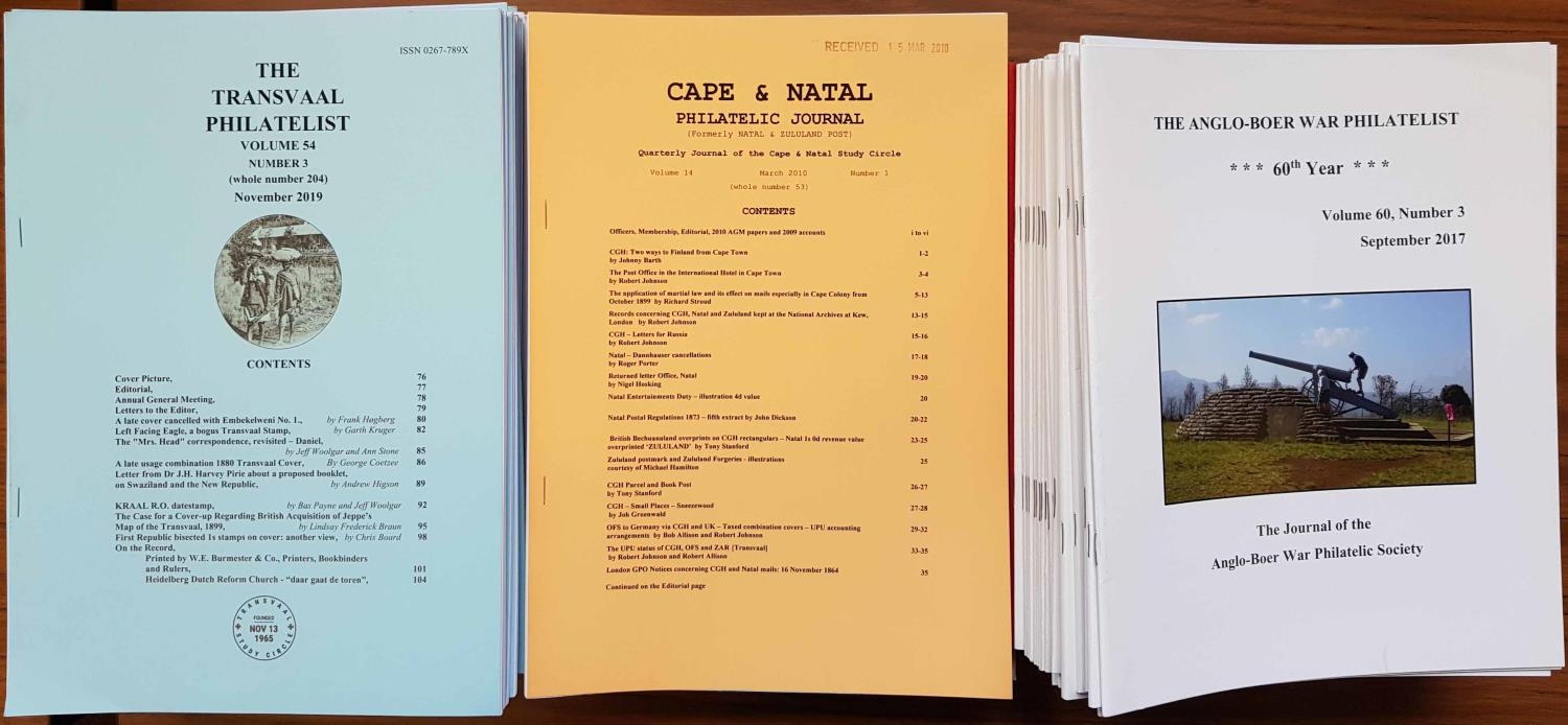 AFRICA & MIDDLE EAST: Two large boxes containing recent short runs of several journals & magazines, namely Cape & Natal Philatelic Journal 2006-10 (18), The Anglo-Boer War Philatelist 2006-17 (45), Cameo: The Journal of the West Africa Study Circle 2016-18 (20), The Transvaal Philatelist 2007-19 (36), The South African Philatelist 2009-20 (54), The Camel Post 2003-17 (39 + Newsletters), The Dhow 2003-8 (21). A huge resource of recent literature. Cross Reference: NATAL, SUDAN, SOUTH AFRICA, MILITARY - BOER WAR