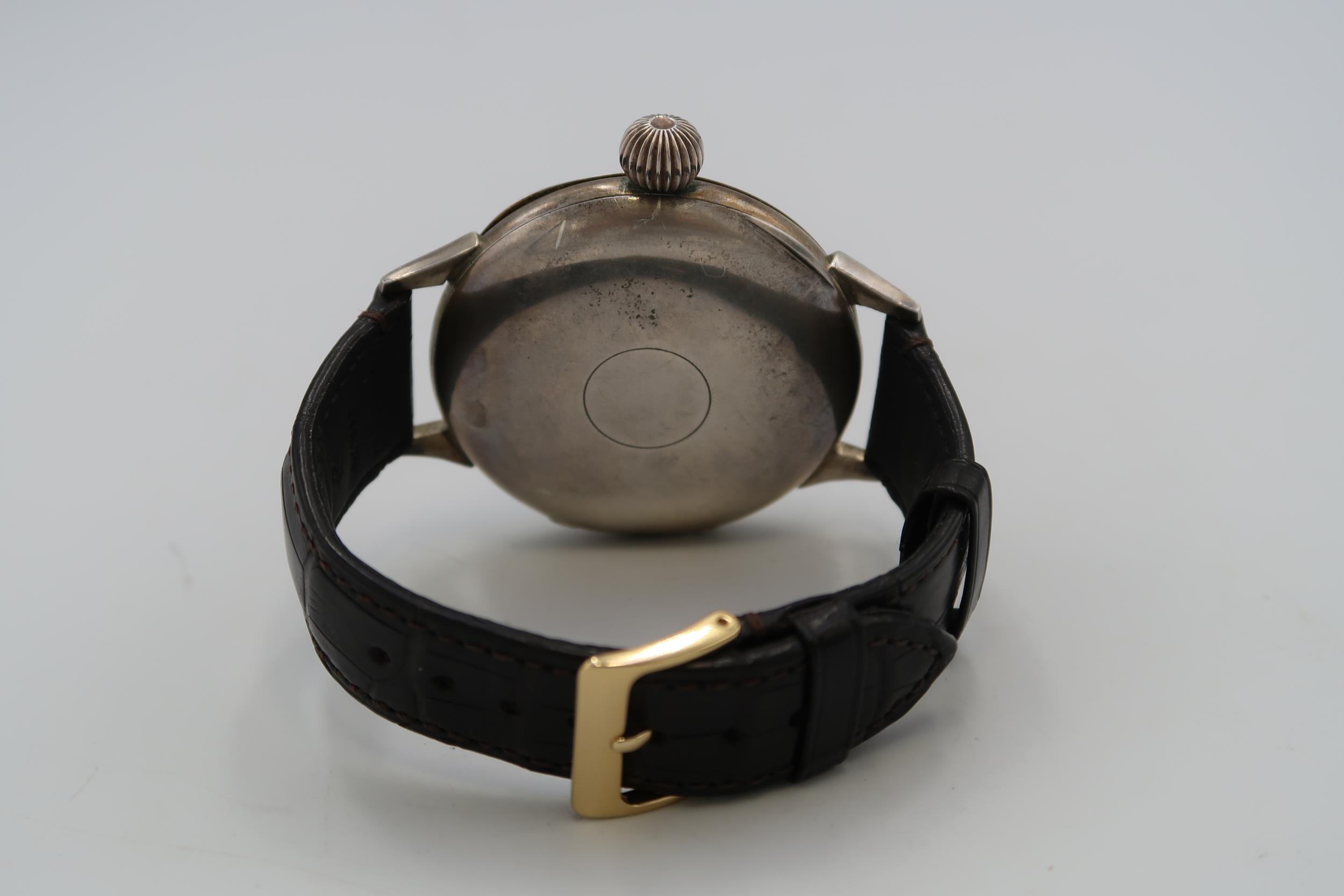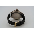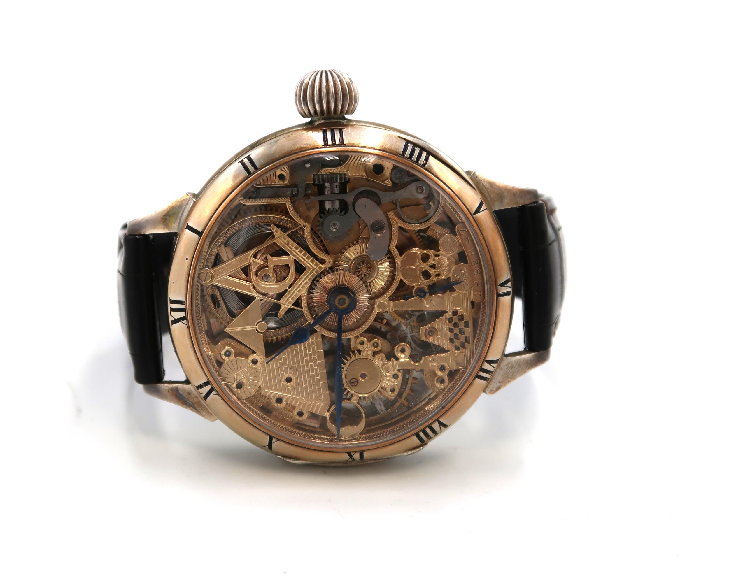 An Omega pocket watch converted from a pocket watch with an open movement, in working order, with a leather strap.