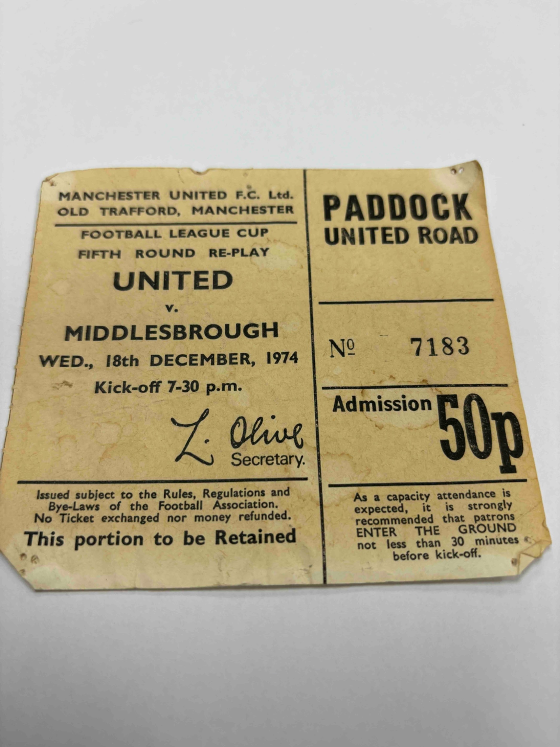 Ticket Manchester United Home v Middlesbrough, 1974/75 Football League Cup. Small Pin holes, slight fading bottom edge.