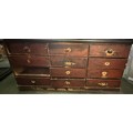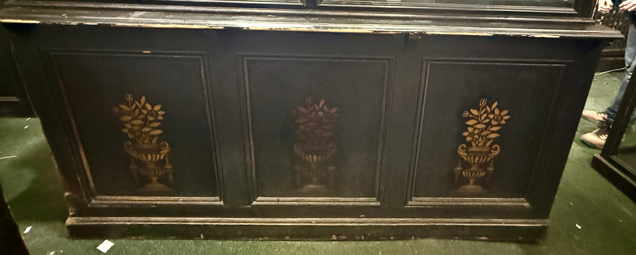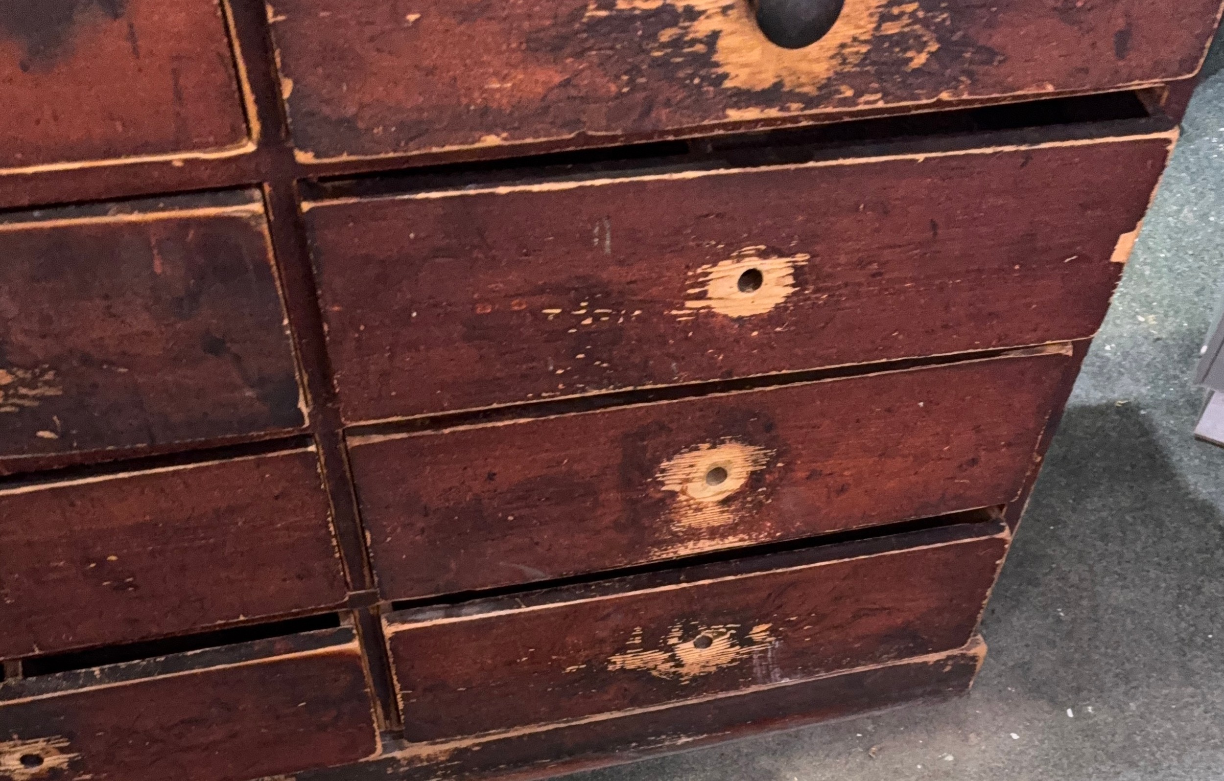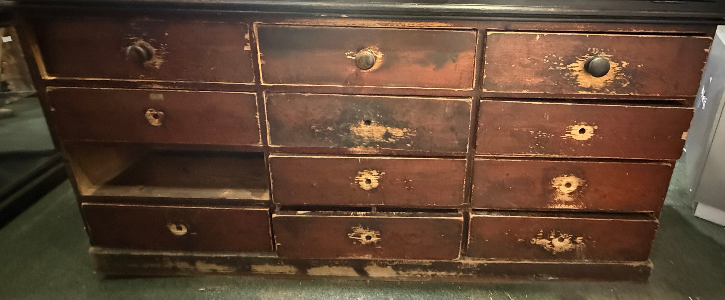 A 19thC shop counter with drawers to rear and original paint work to front. 196cm w x 54cm d x 94cm h.