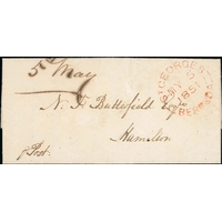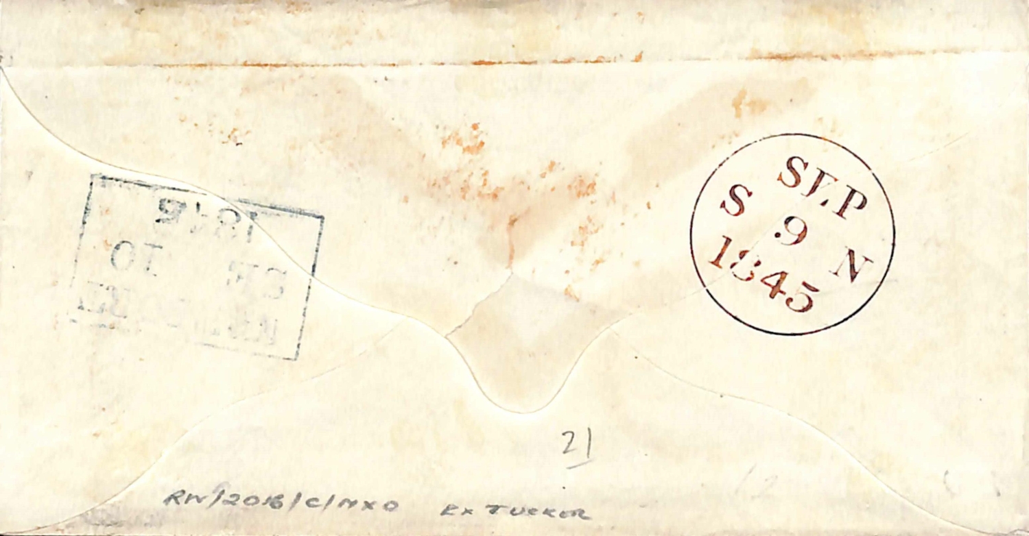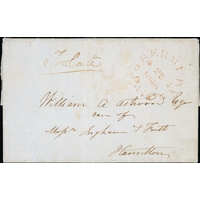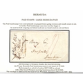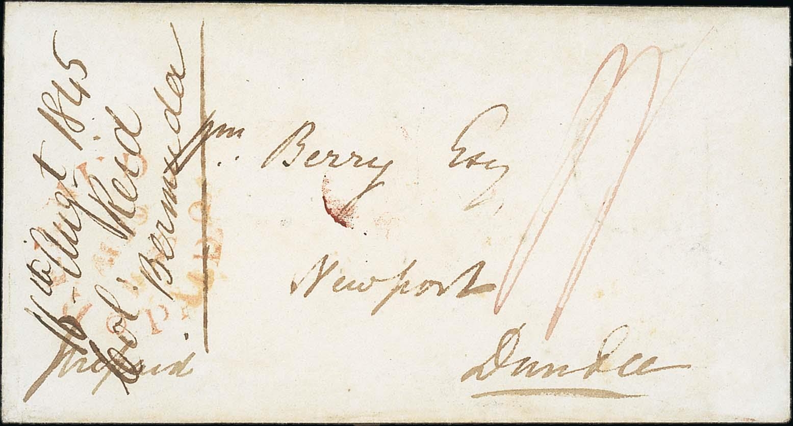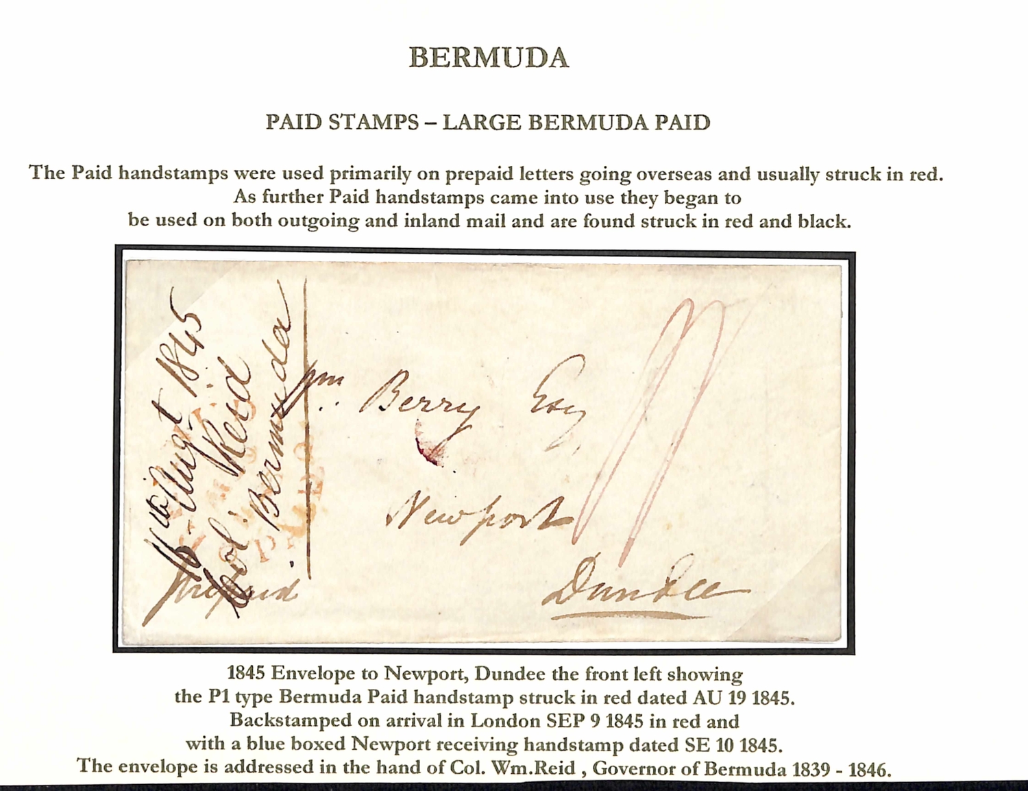 1845 (Aug 20) Cover to Scotland, prepaid 1/-, red "BERMUDA / PAID" datestamp on the front, partly covered by the recipients endorsement showing the sender to be Col Wm. Reid, Governor of Bermuda. Very scarce, fewer than 20 examples recorded, ex Tucker Collection. Photo on Page 8.