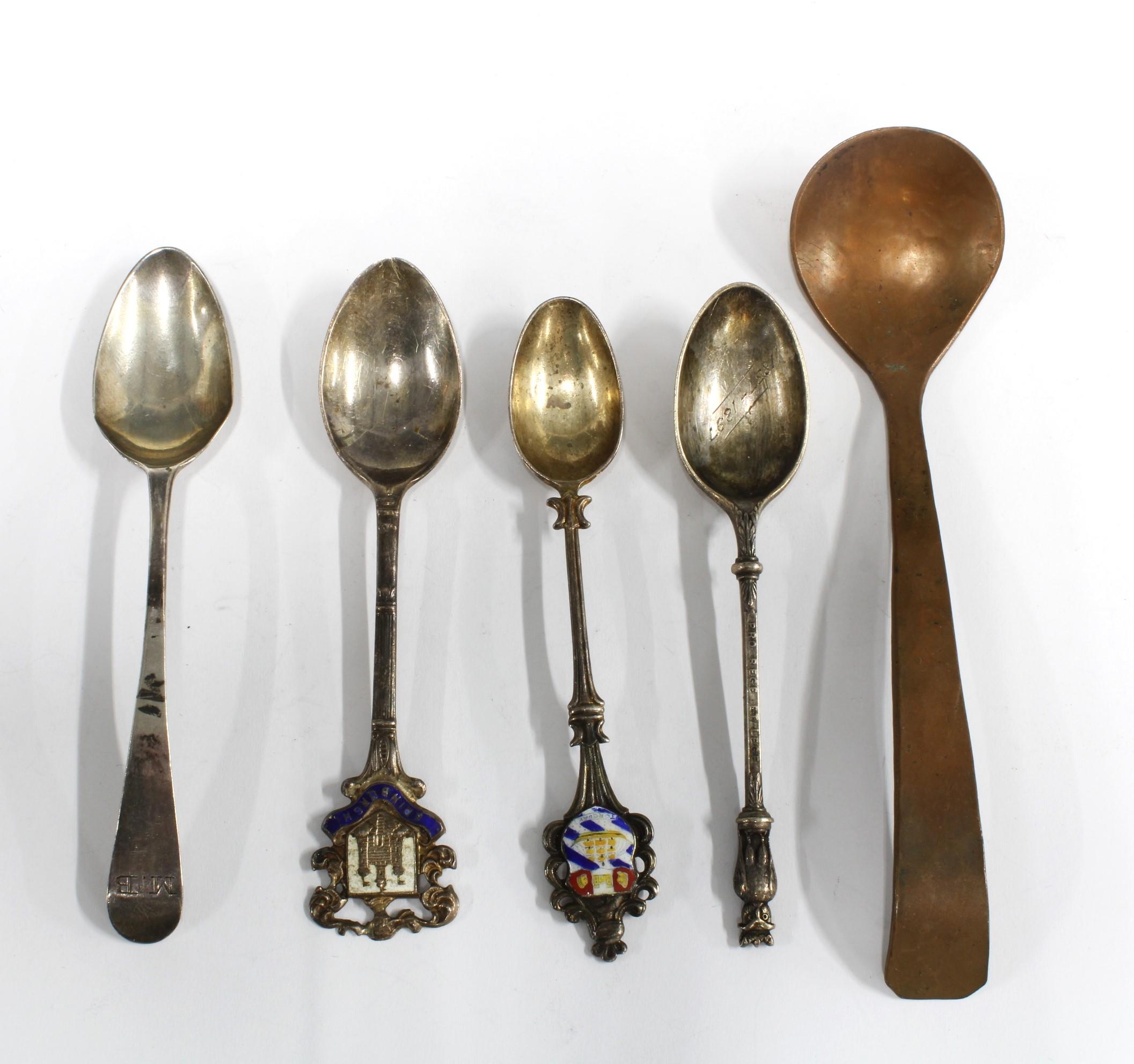 Georgian silver teaspoon, three other silver teaspoons and a copper spoon (5)