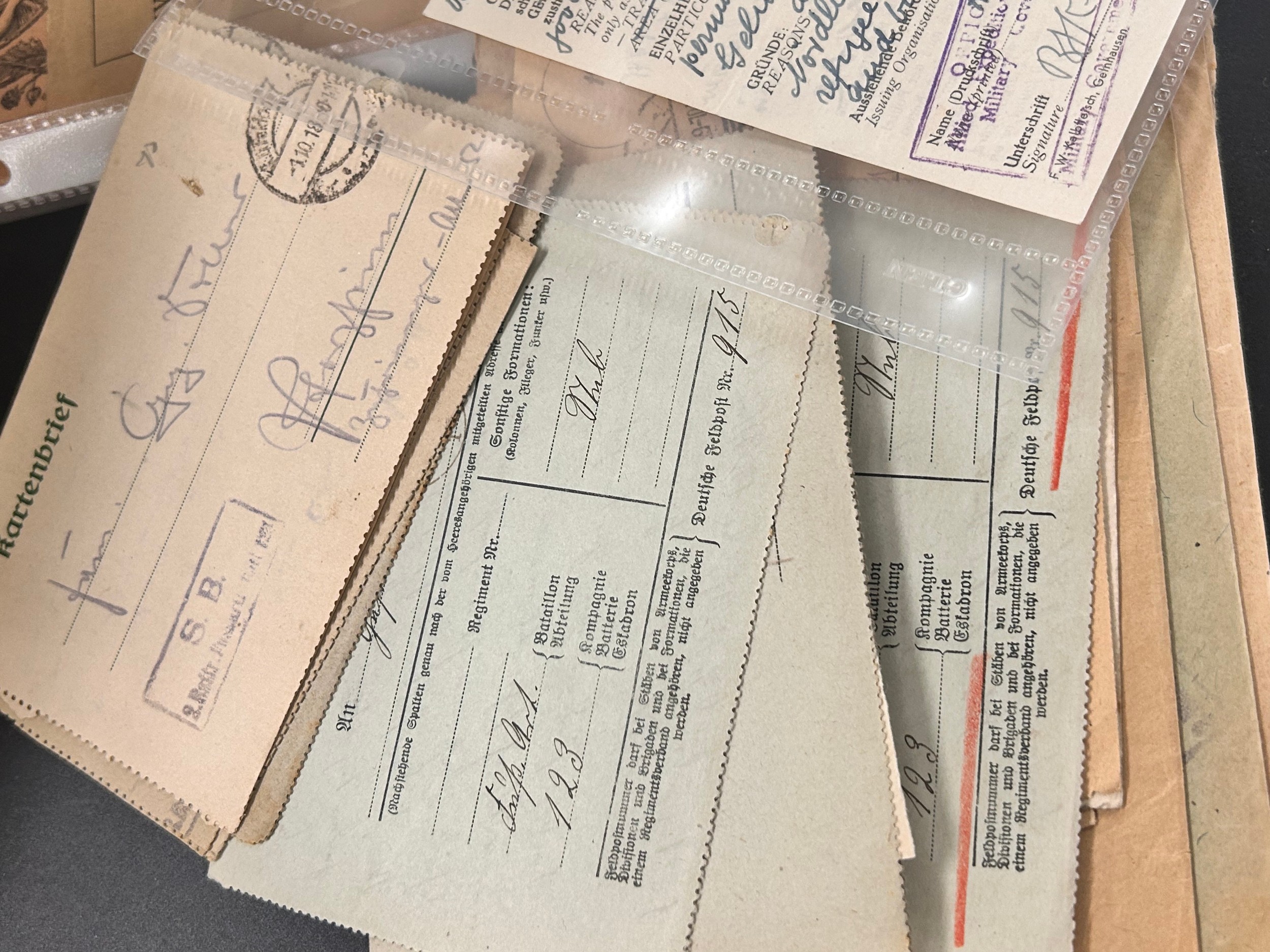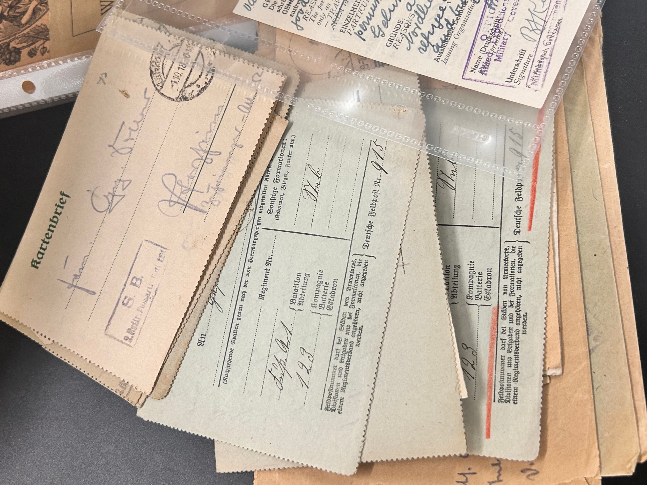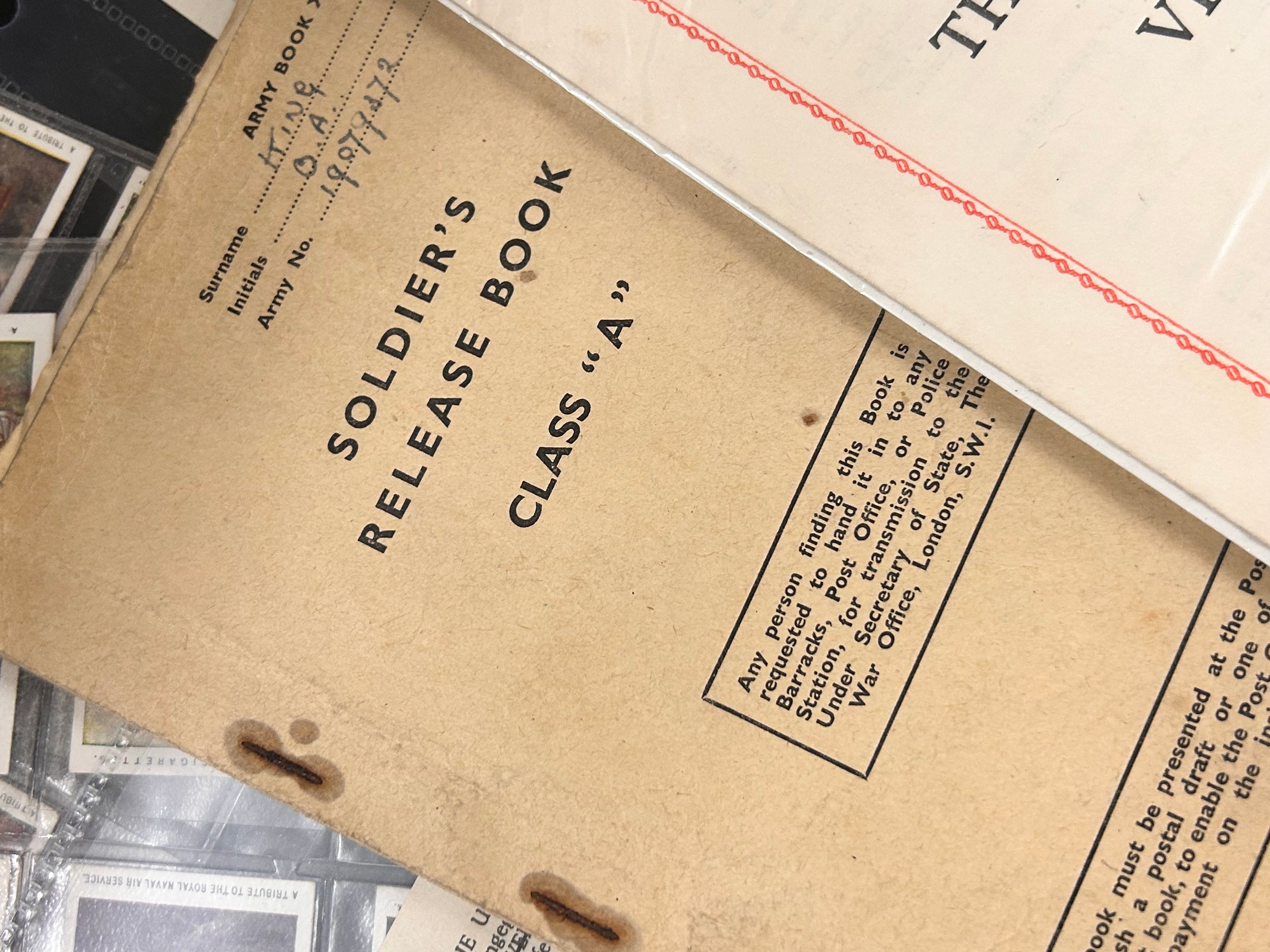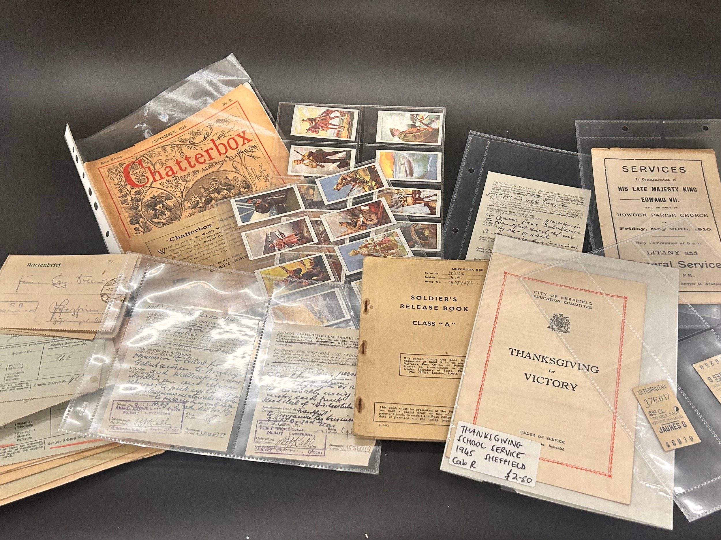 A collection of World War I and World War II ephemera, letters, service records, cigarette cards, etc.