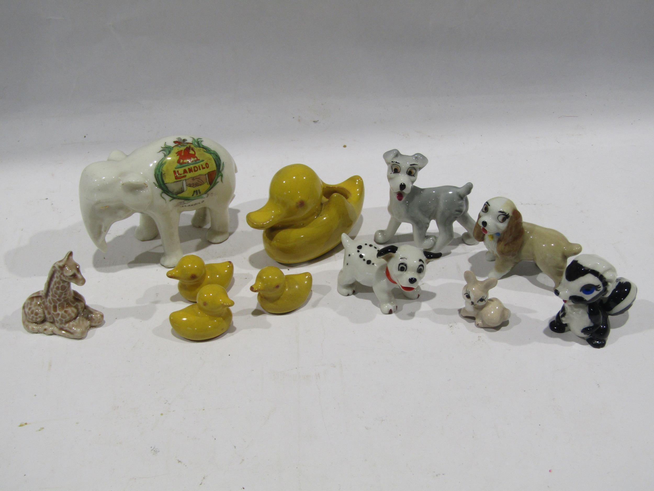 A selection of miscellaneous ceramic animal figures to include Wade Lady & The Tramp, crested china elephant bearing The Arms of Llandilo