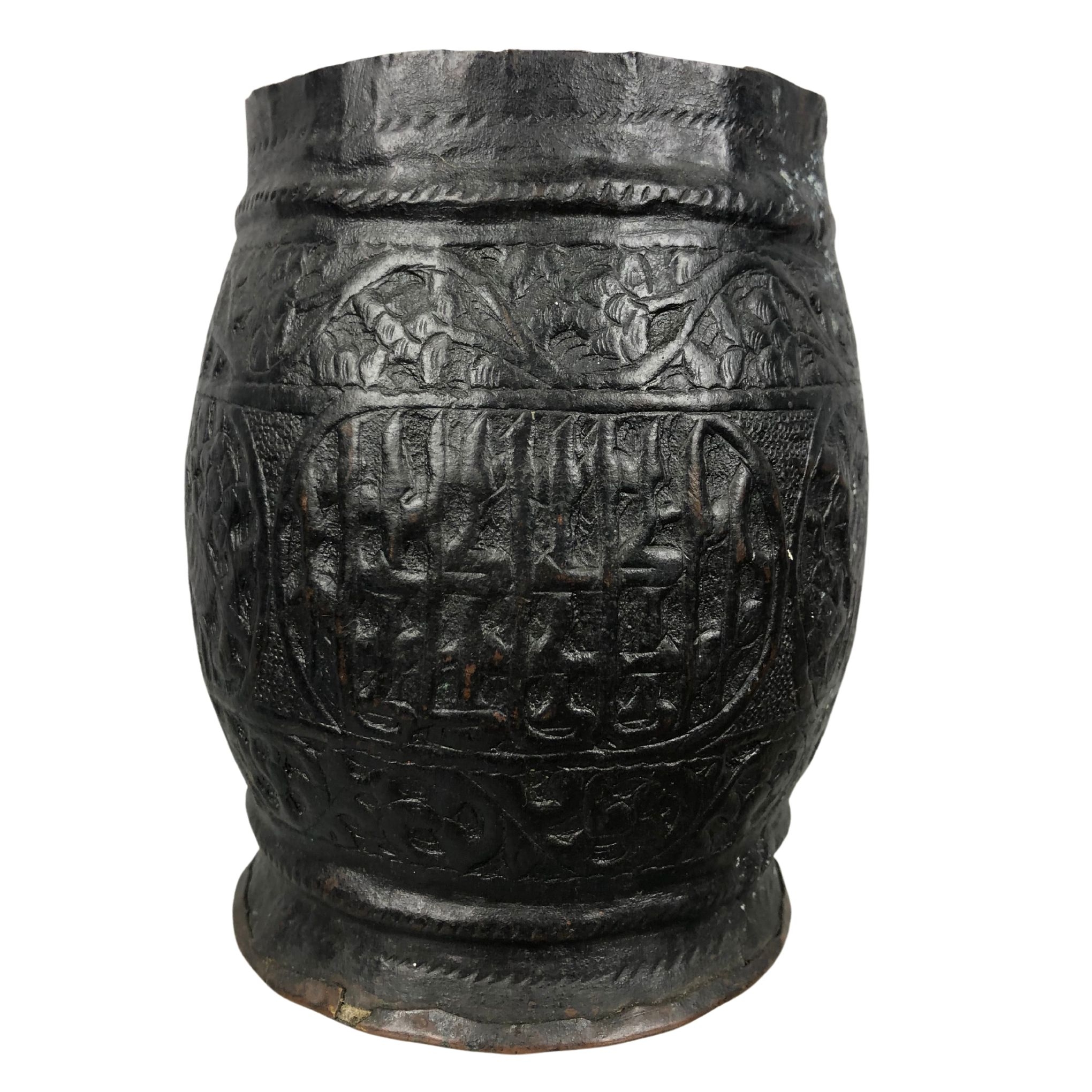 Persian Metal Cup Middle Eastern Possibly 18th Century, embossed with foliate designs and kufic script.