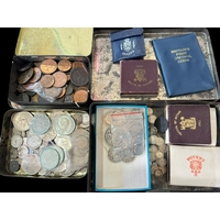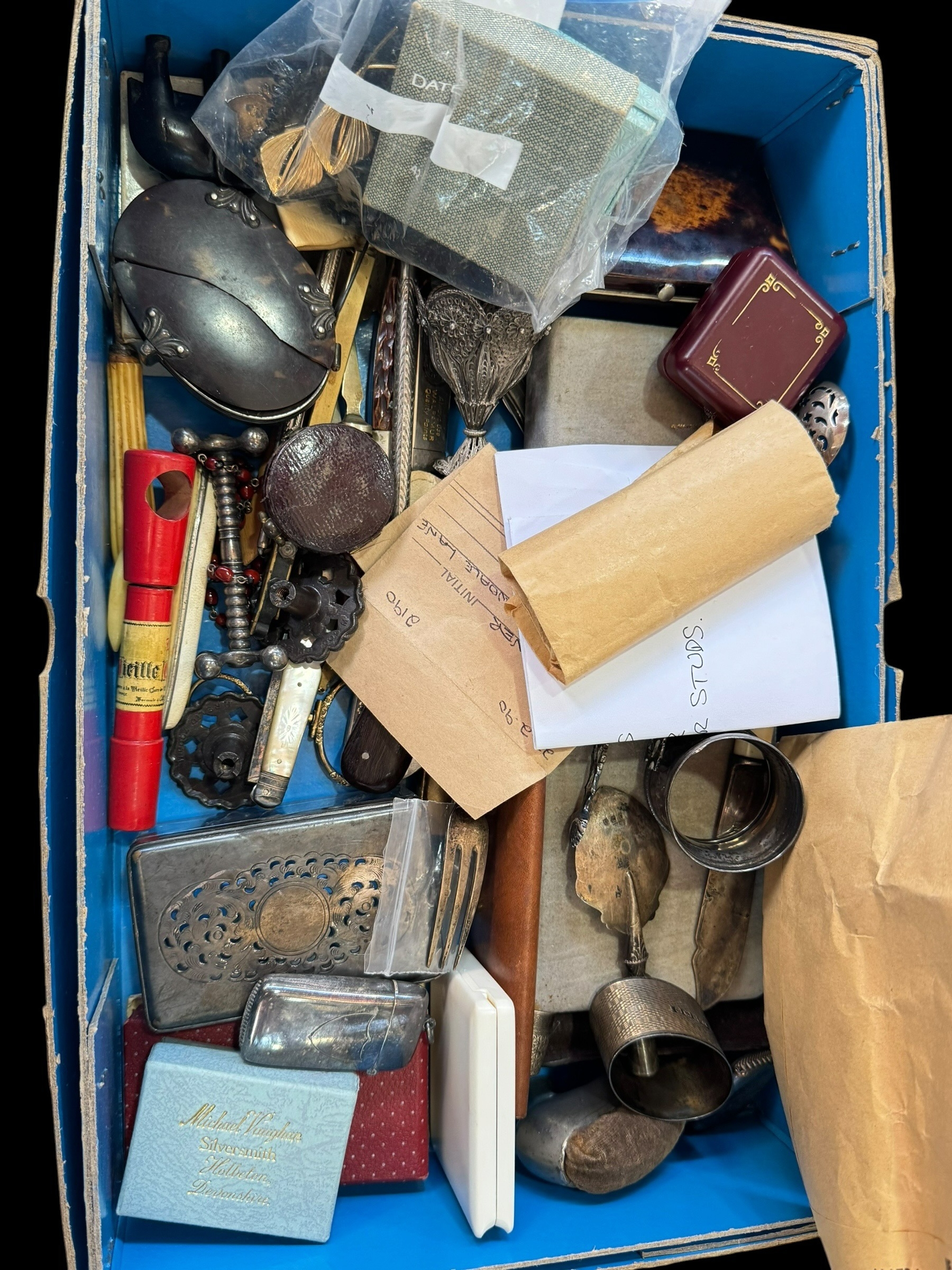 Box of collectables including silver napkin rings, folding knives, jewellery, etc.