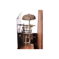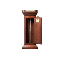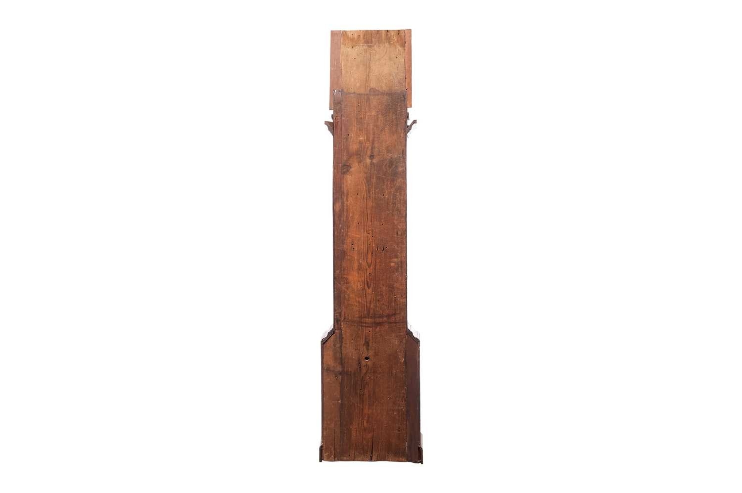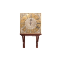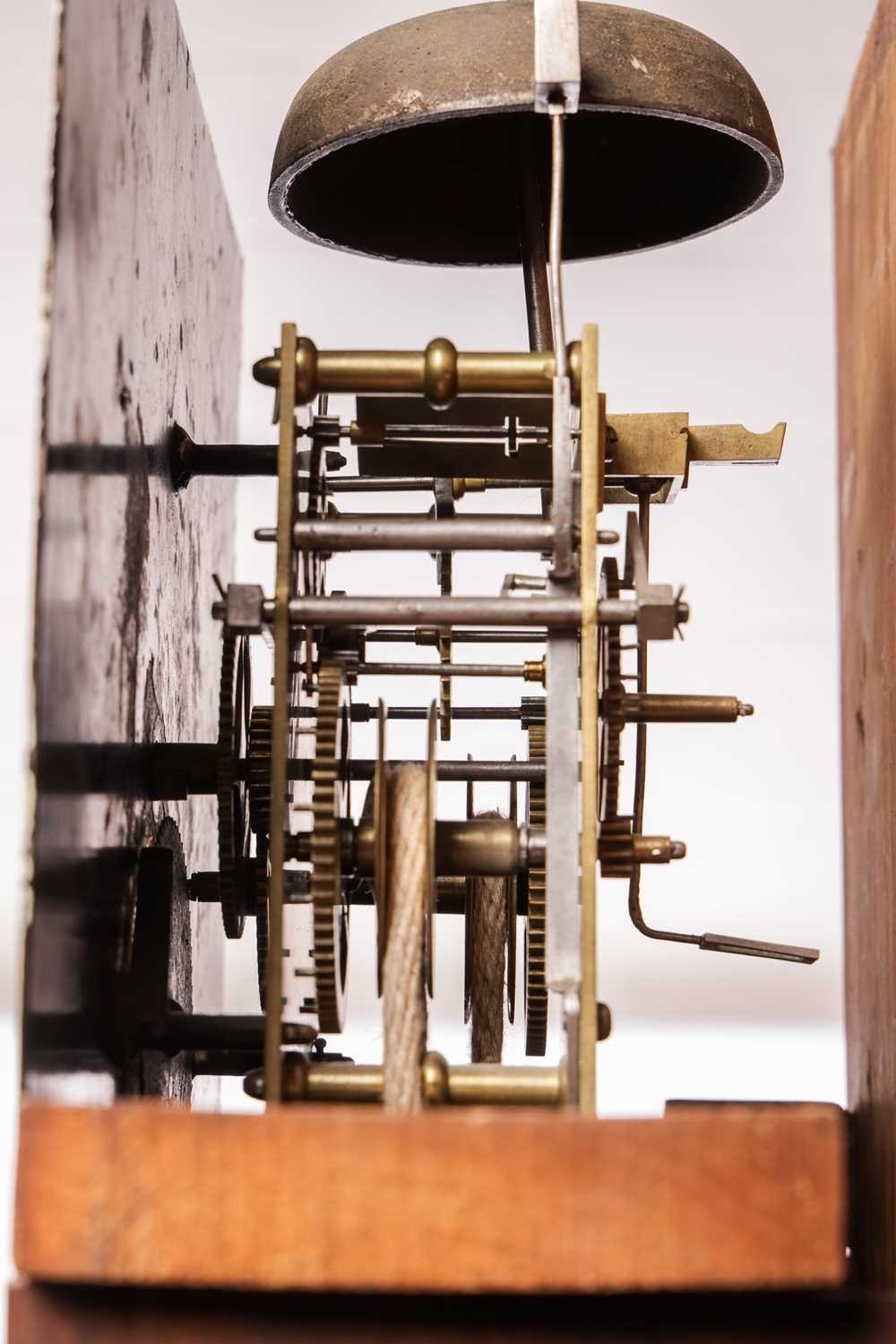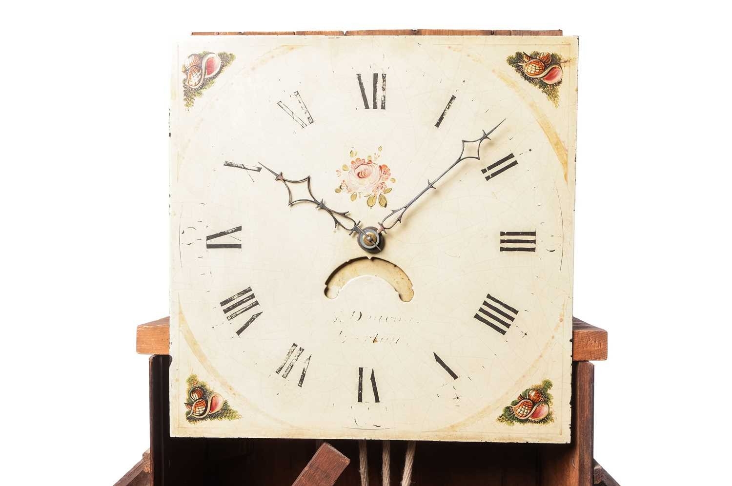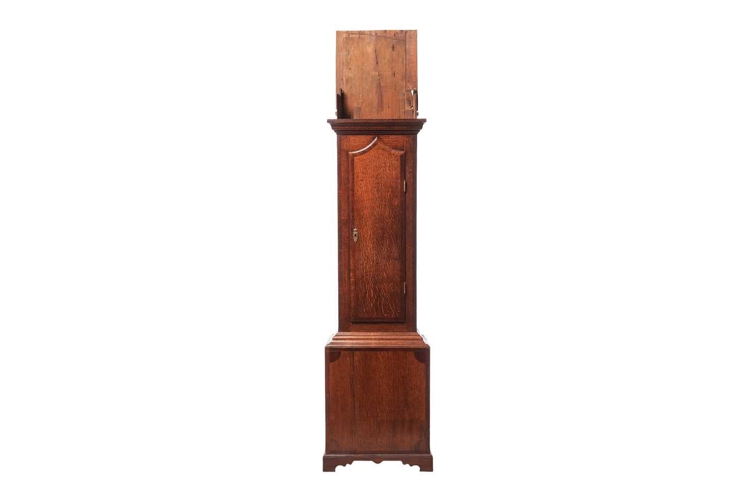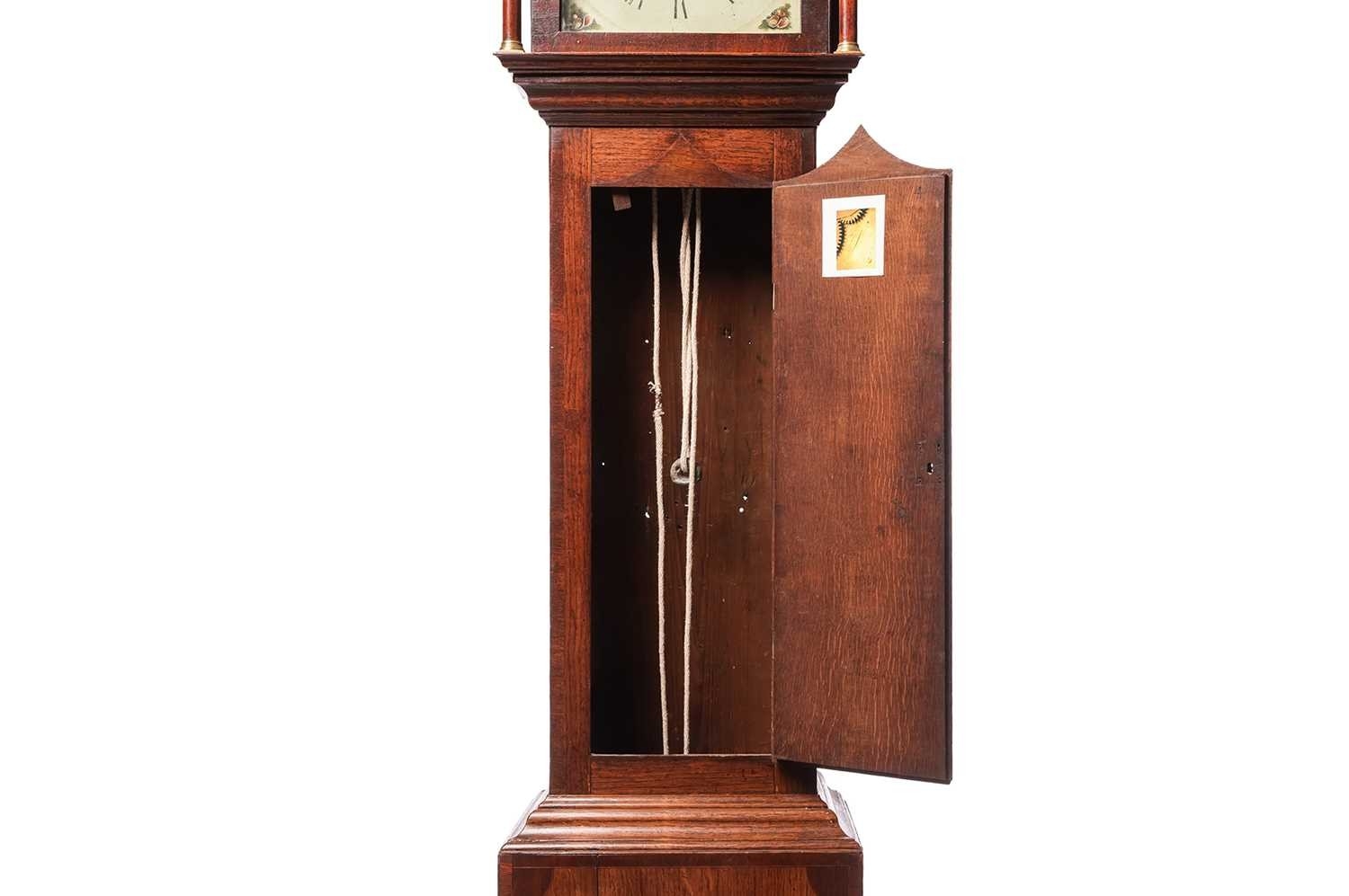 A late George III oak 30-hour longcase clock, possibly Deacon (John?) of Barton in the Beans, the hood with fret carved broken triangular pediment and brass finial over turned columns enclosing a painted 12" dial, indistinctly signed, with date aperture, rose painted centre and shell painted spandrels, the knopped four pillar movement with anchor escapement and countwheel striking on a bell, the trunk with triangular arched crossbanded door over a crossbanded plinth base and bracket feet, 208 cm high From the estate of the late William John Thornton (1937-2025), of Groby, Leicestershire. Known as 'John' to his friends and family, he became interested in steam engines from an early age, and then traction engines and aircraft, before building an extensive knowledge and collection of clocks, notably early Lantern clocks and longcases. He was a very keen member of the Antiquarian Horological Society, and gave several lectures to their members at Keble College, Oxford. John was also a member of the Furniture Society in Groby village, and the Groby allotment Society, being chairman of the latter for over 30 years. The seat board has been replaced.