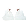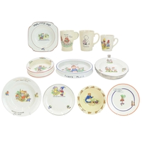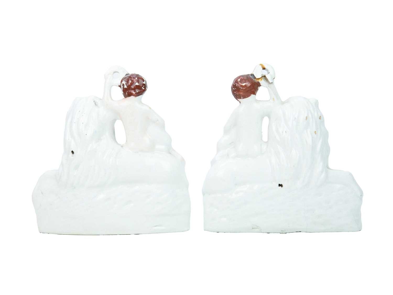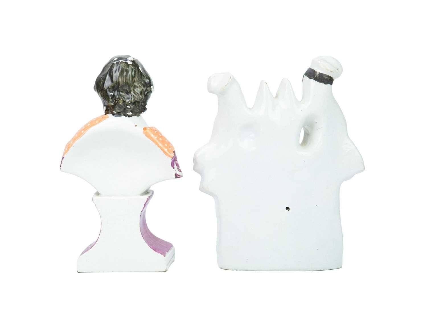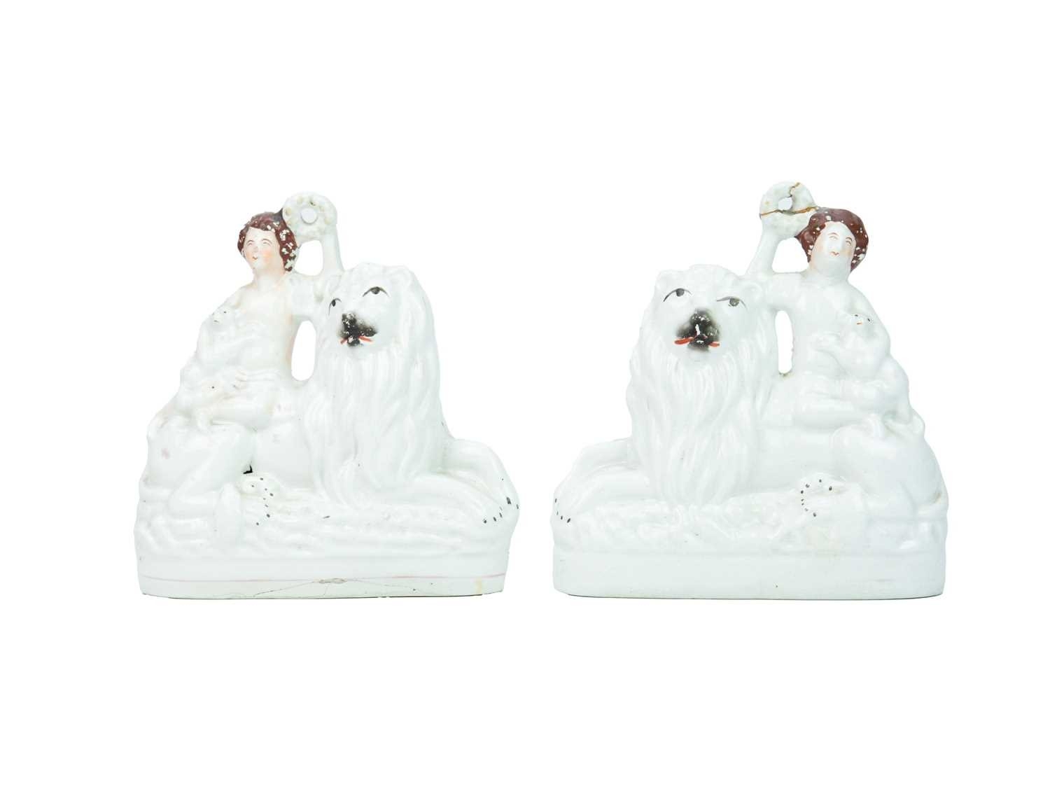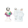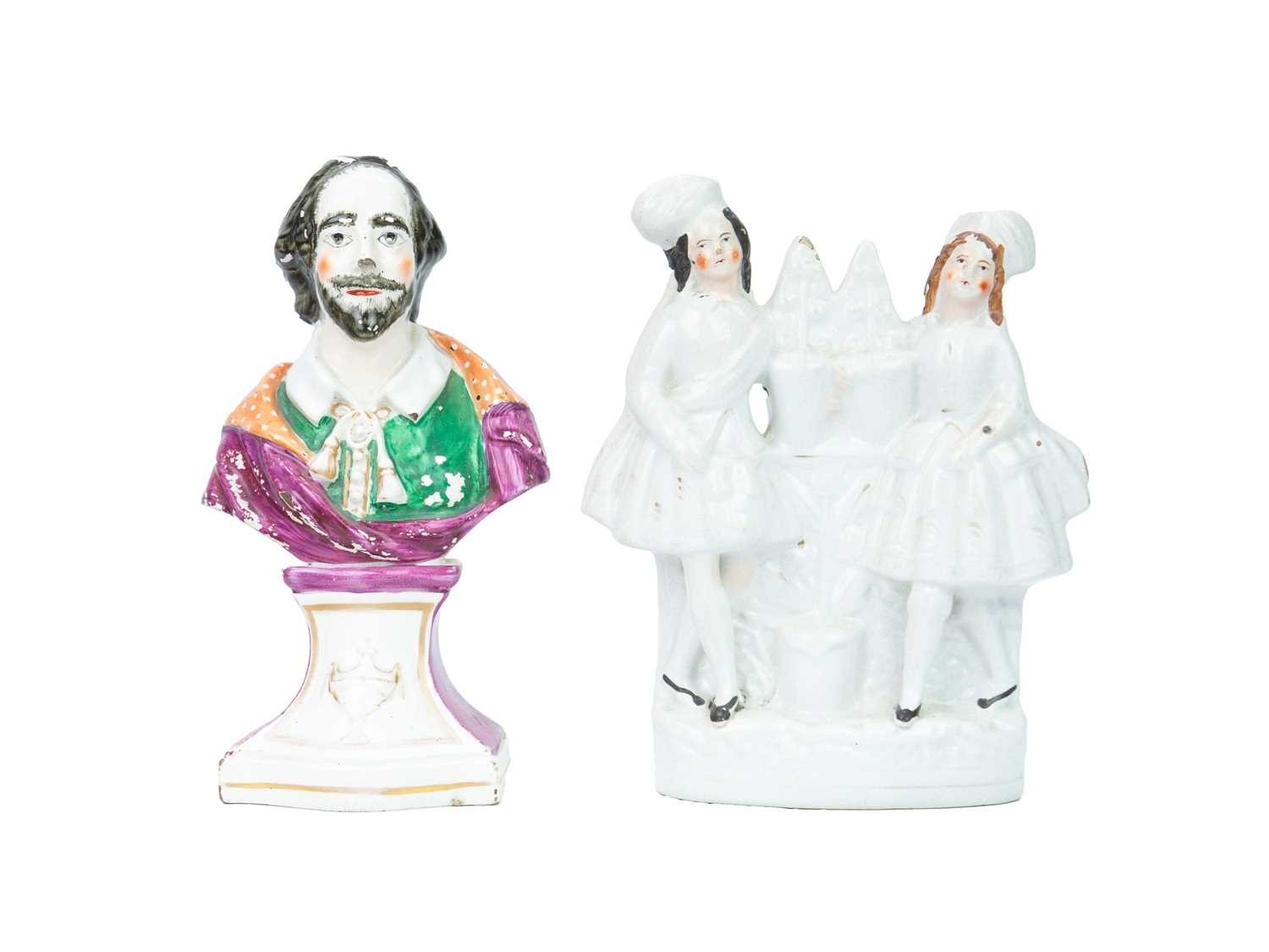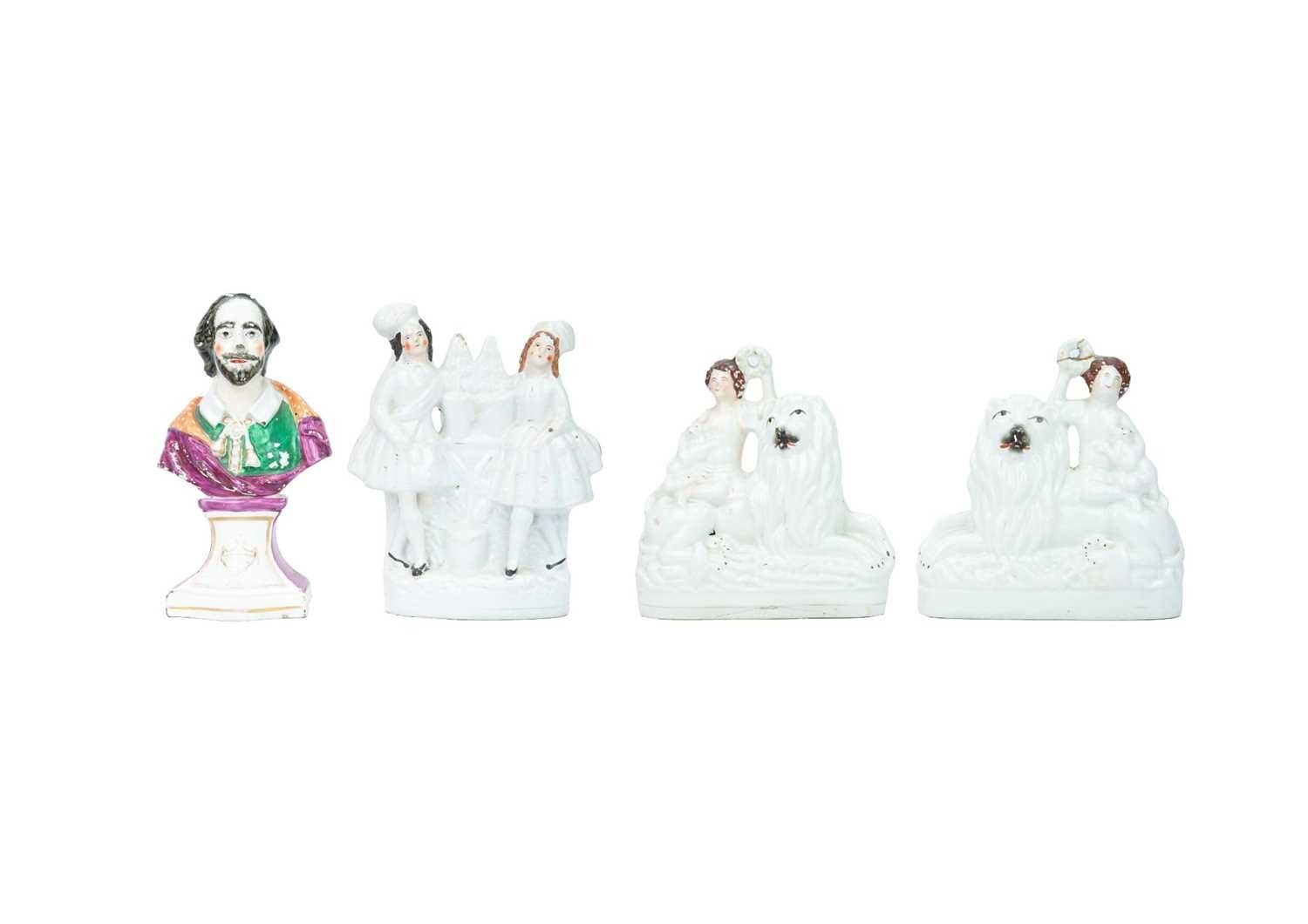 A pair of 19th century Staffordshire figure groups. Each modelled with a shepherdess holding a lamb, and seated atop a recumbent lion, height 19cm. Together with another figure group, height 22cm, and a portrait bust of William Shakespeare, height 26cm (4).