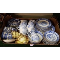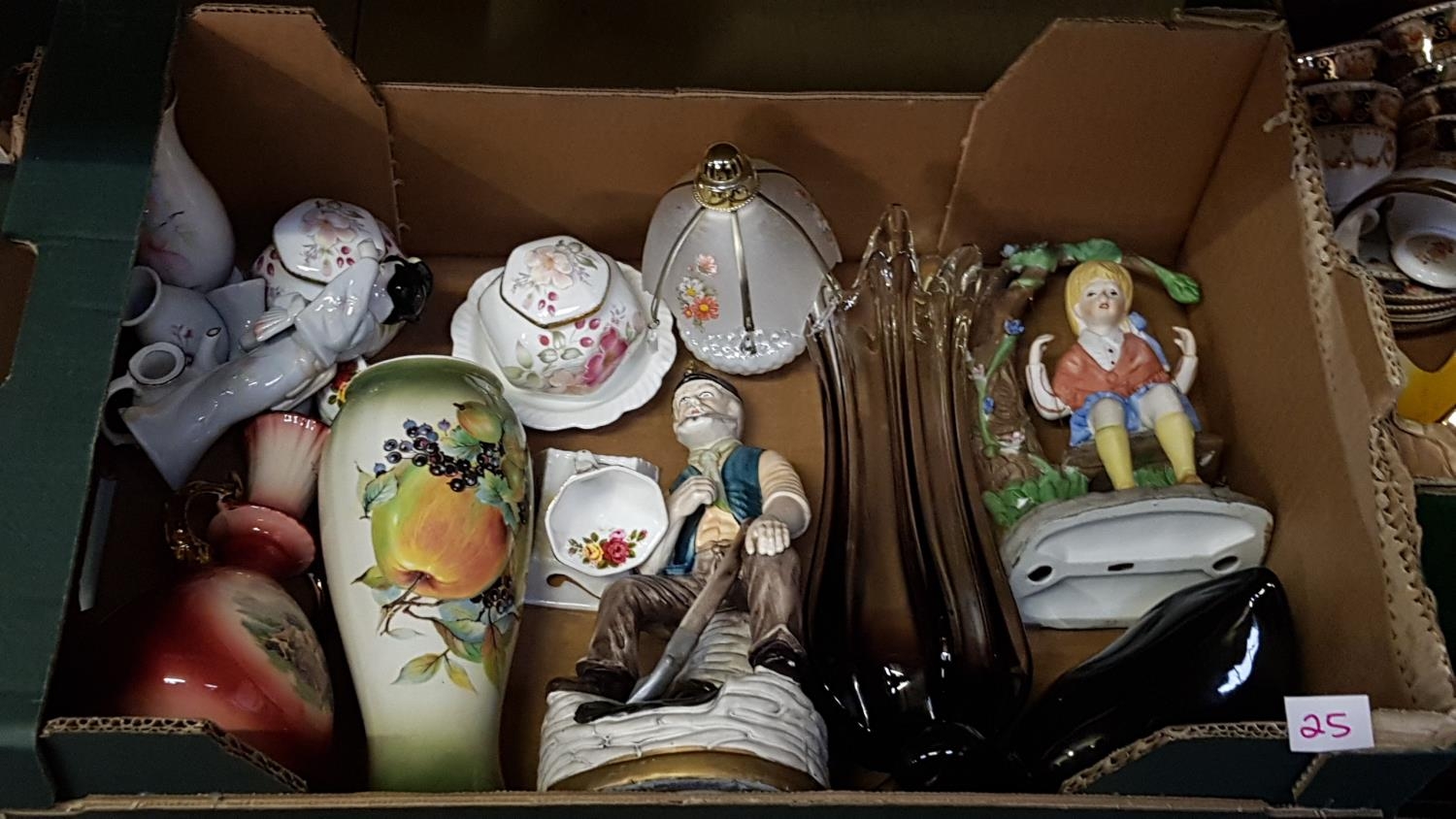 Box of Assorted China to Include Vintage Figures, Staffordshire, KLM, Cottage Rose, Glass Vase etc.