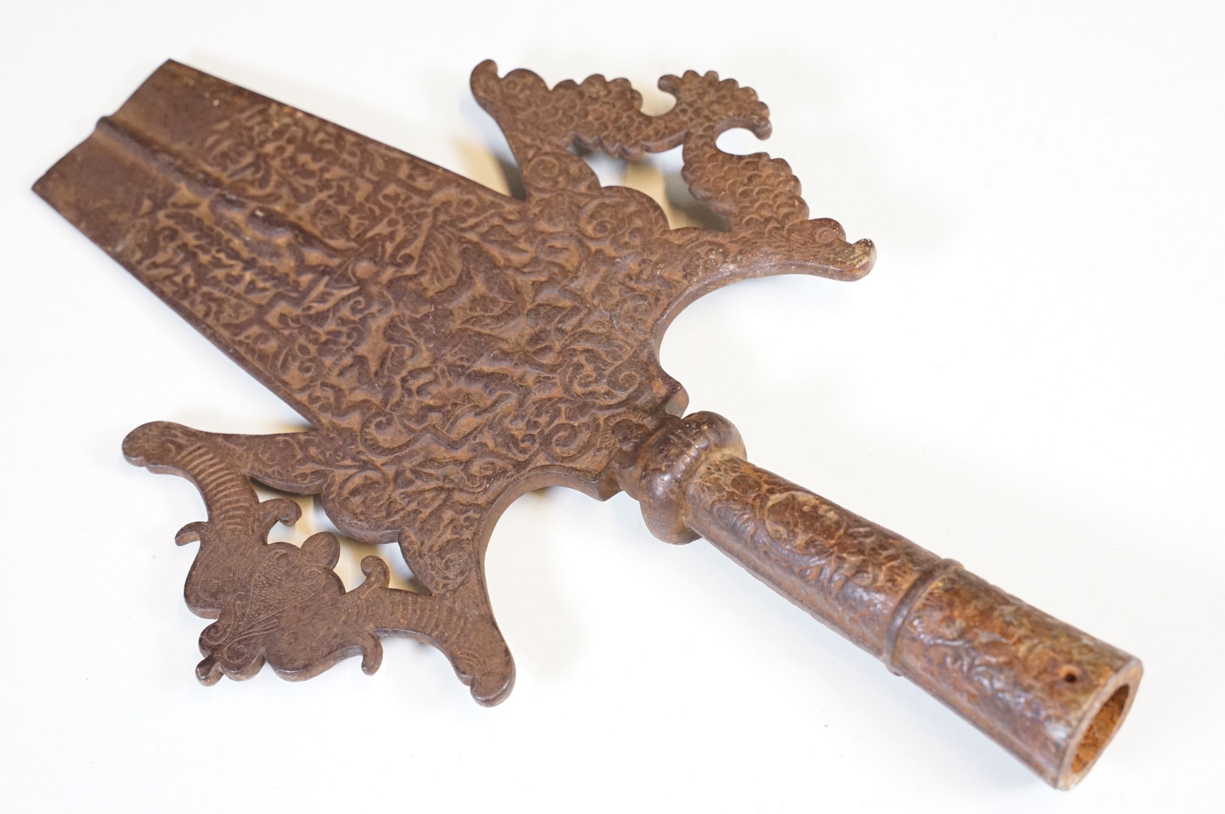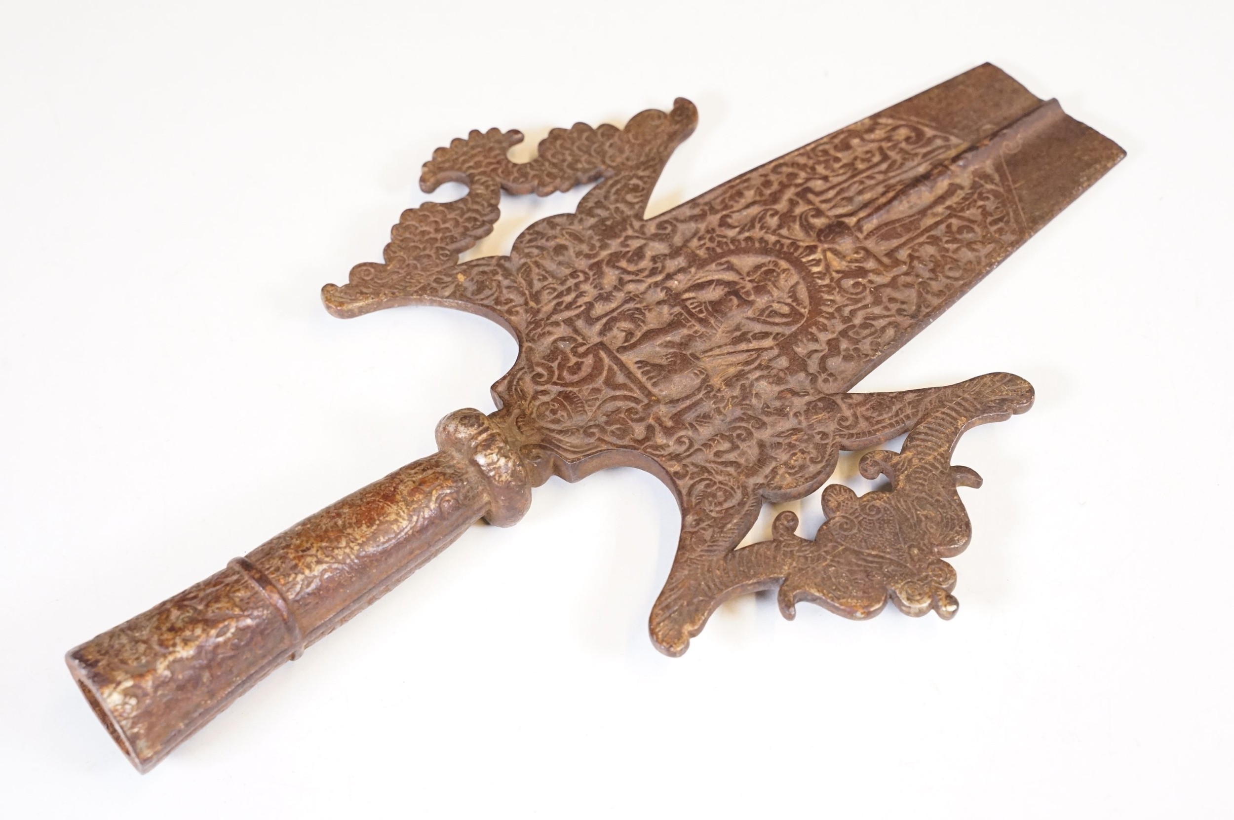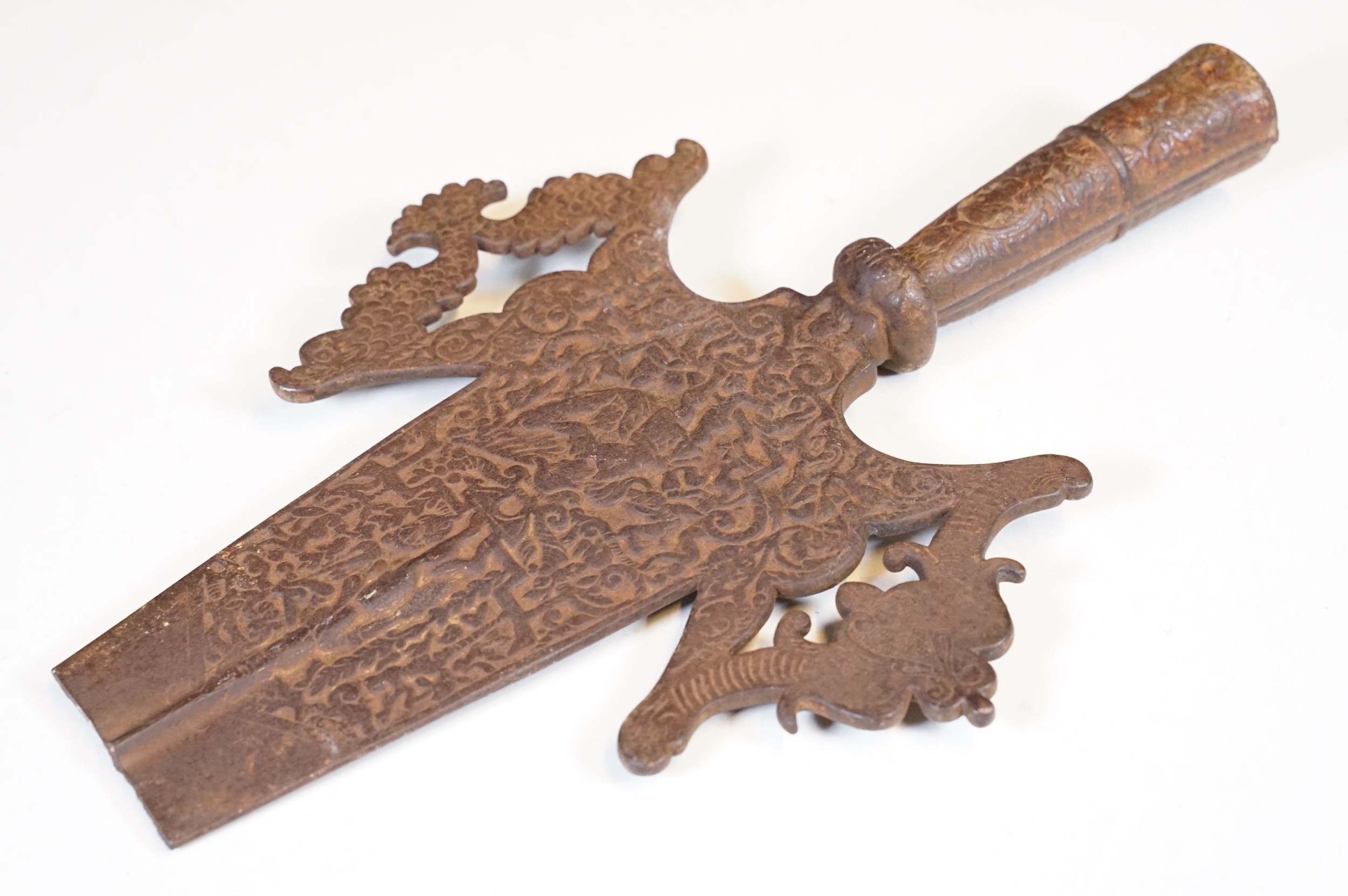 Polearm head with intricate relief work and decorative side lugs, H 35.5cm, W 23cm