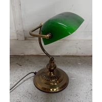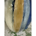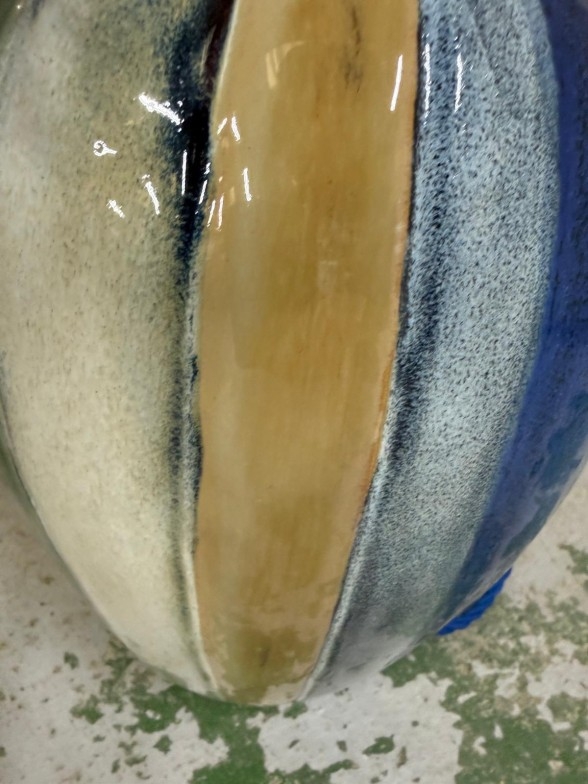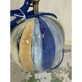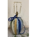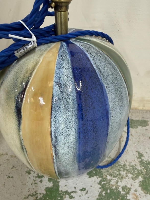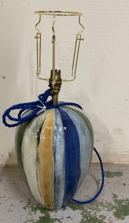 A glazed ceramic table lamp in grey, blue, cream and green stripes. Height 52cm