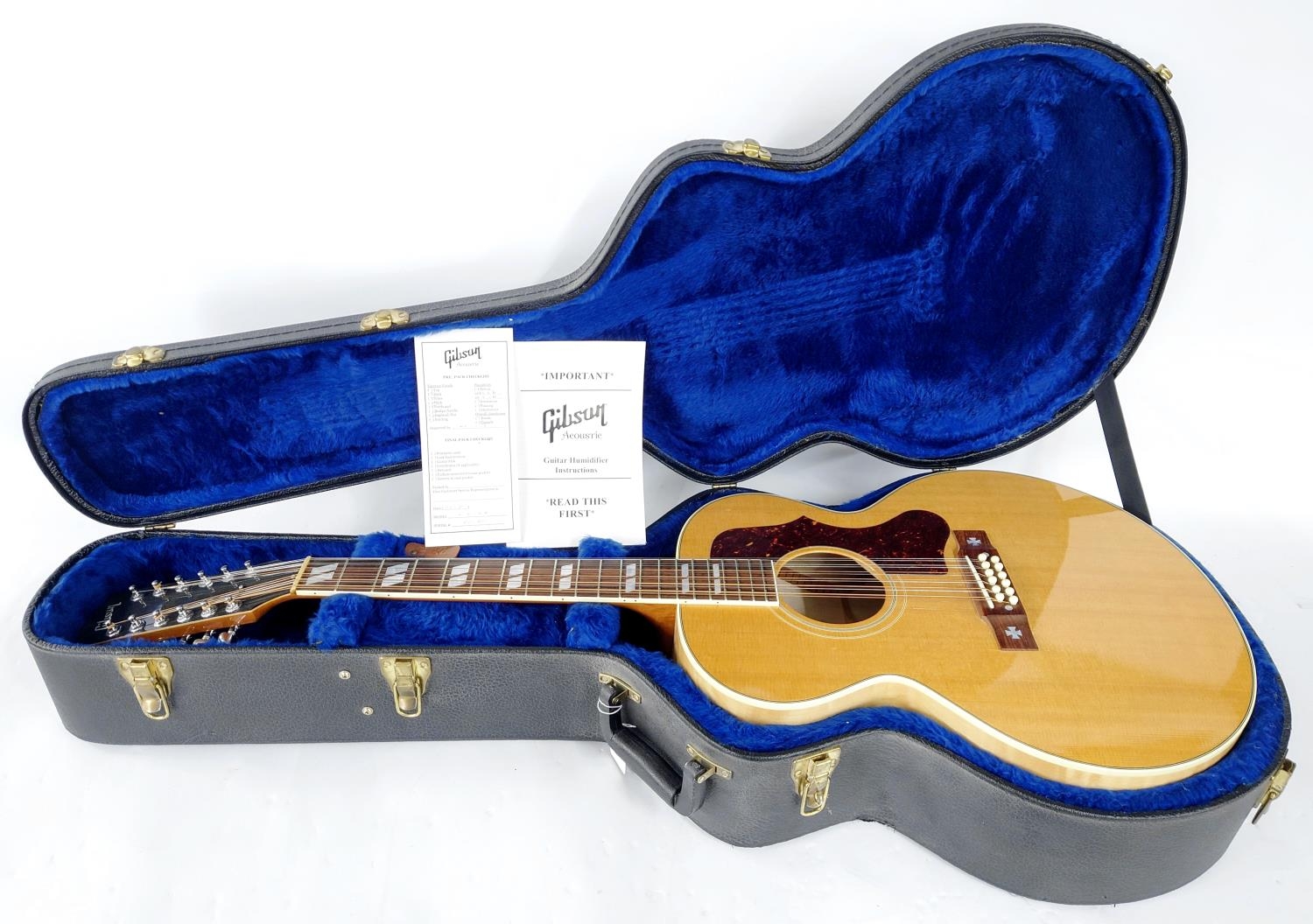 2005 Gibson J-185 twelve string electro-acoustic guitar, made in USA; Back and sides: natural finish maple; Top: natural spruce; Neck: mahogany; Fretboard: rosewood; Frets: good; Electrics: working, later fitted Belcat IRIS-2 pickup system with controls to sound hole and wired through to end pin; Case: original hard case and papers; Overall condition: very good