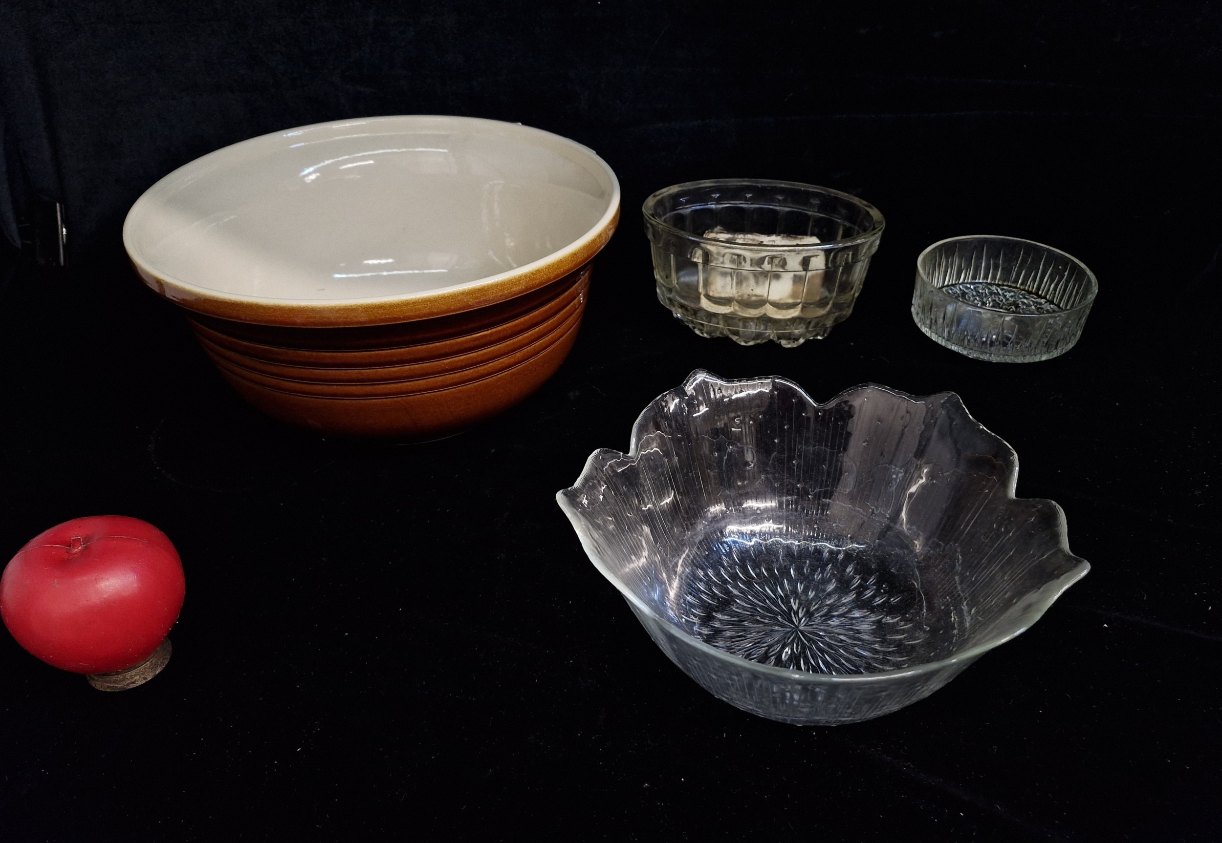 A very large ceramic glazed mixing bowl stamped Zodiac to base, together with a glass jelly mould and a glass bowl.
