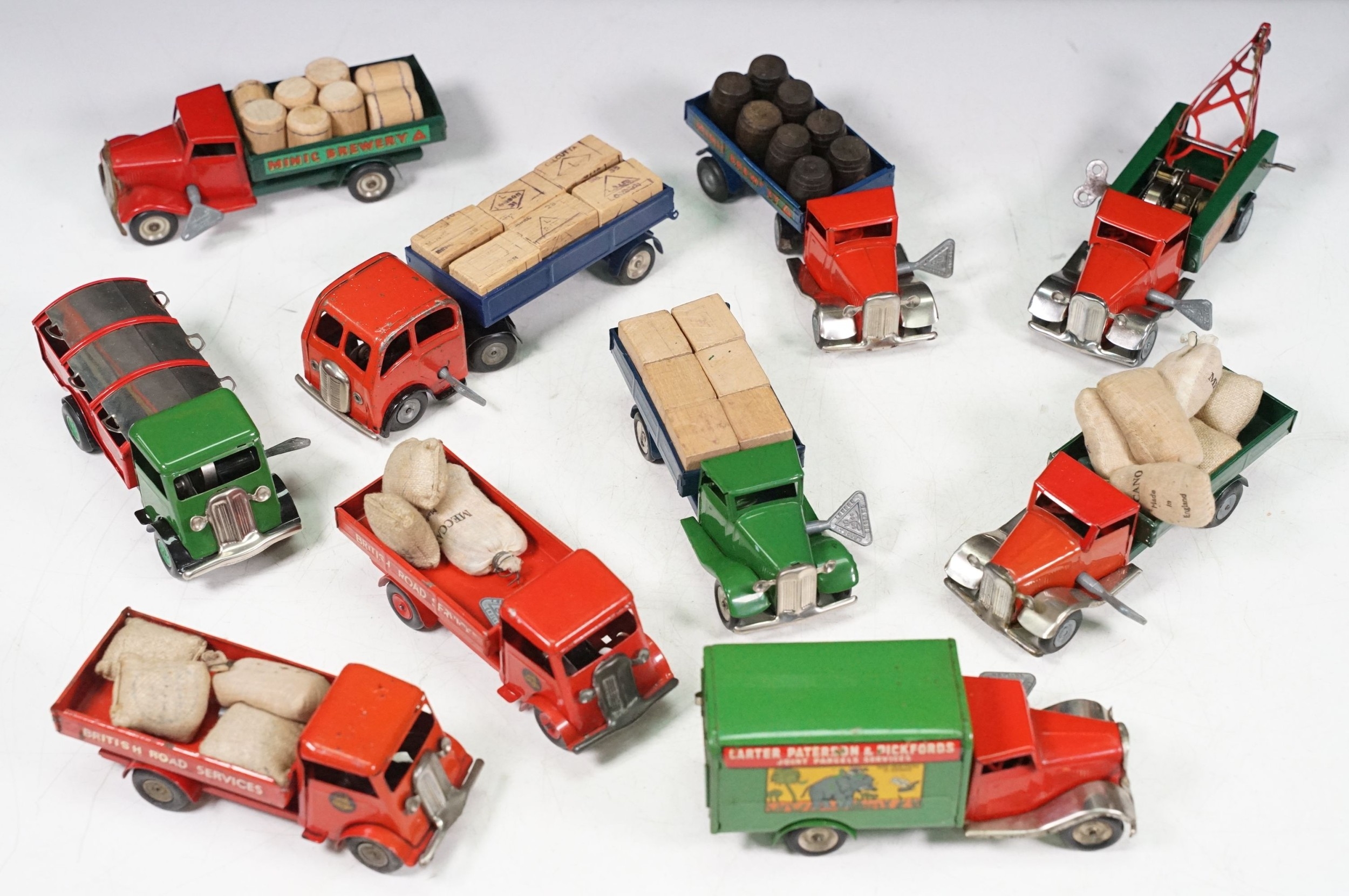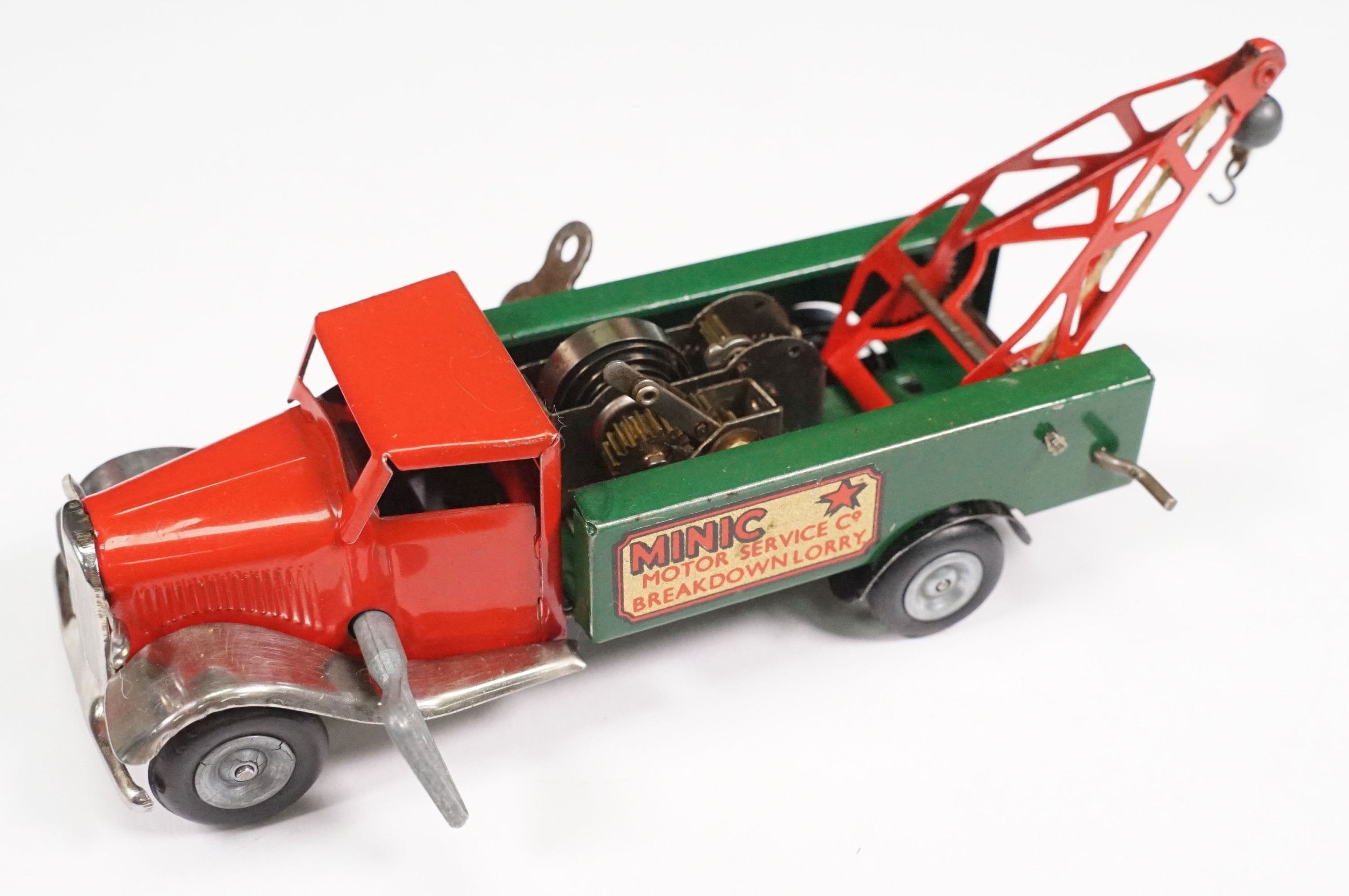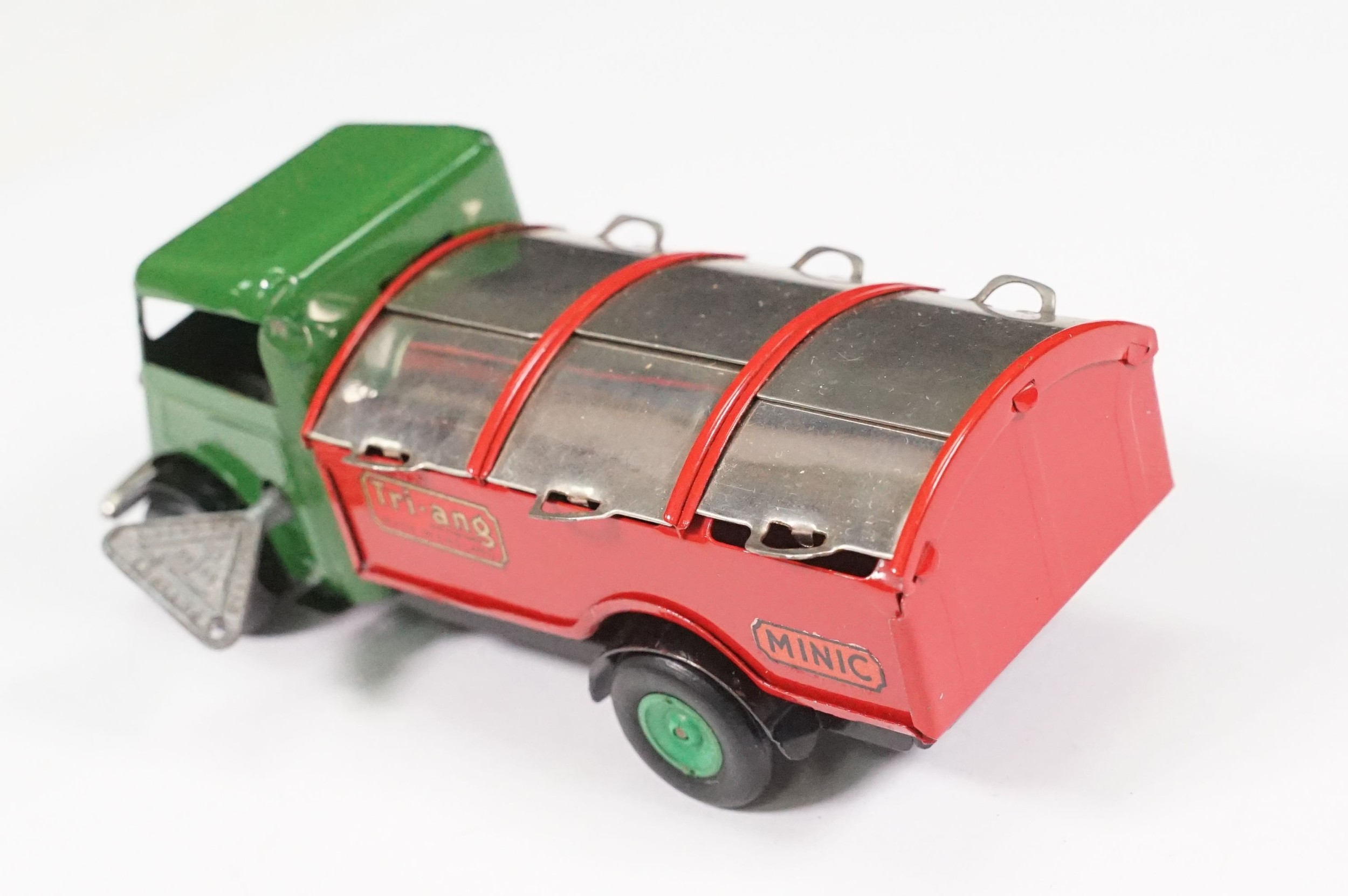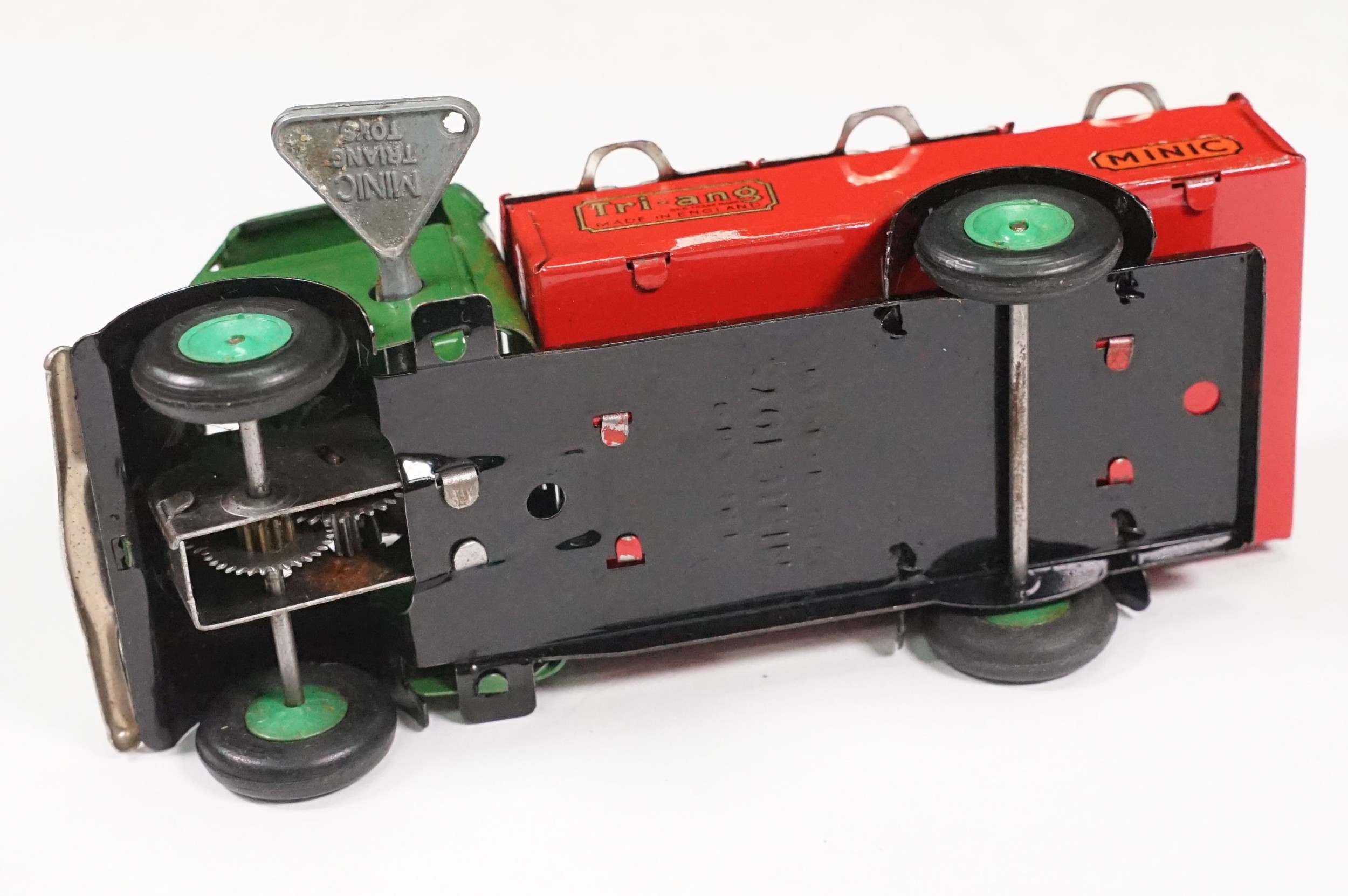 Ten Triang Minic Post-War tinplate and clockwork commercial models to include Carter Paterson Van 22M, Dust Cart 32M, Breakdown Lorry 48M with red cab and green body, Brewery Lorry 72M, British Road Services Open Back Lorry, etc, all complete with original Triang Minic clockwork keys, all models in gd-vg condition overall with some signs of wear in places