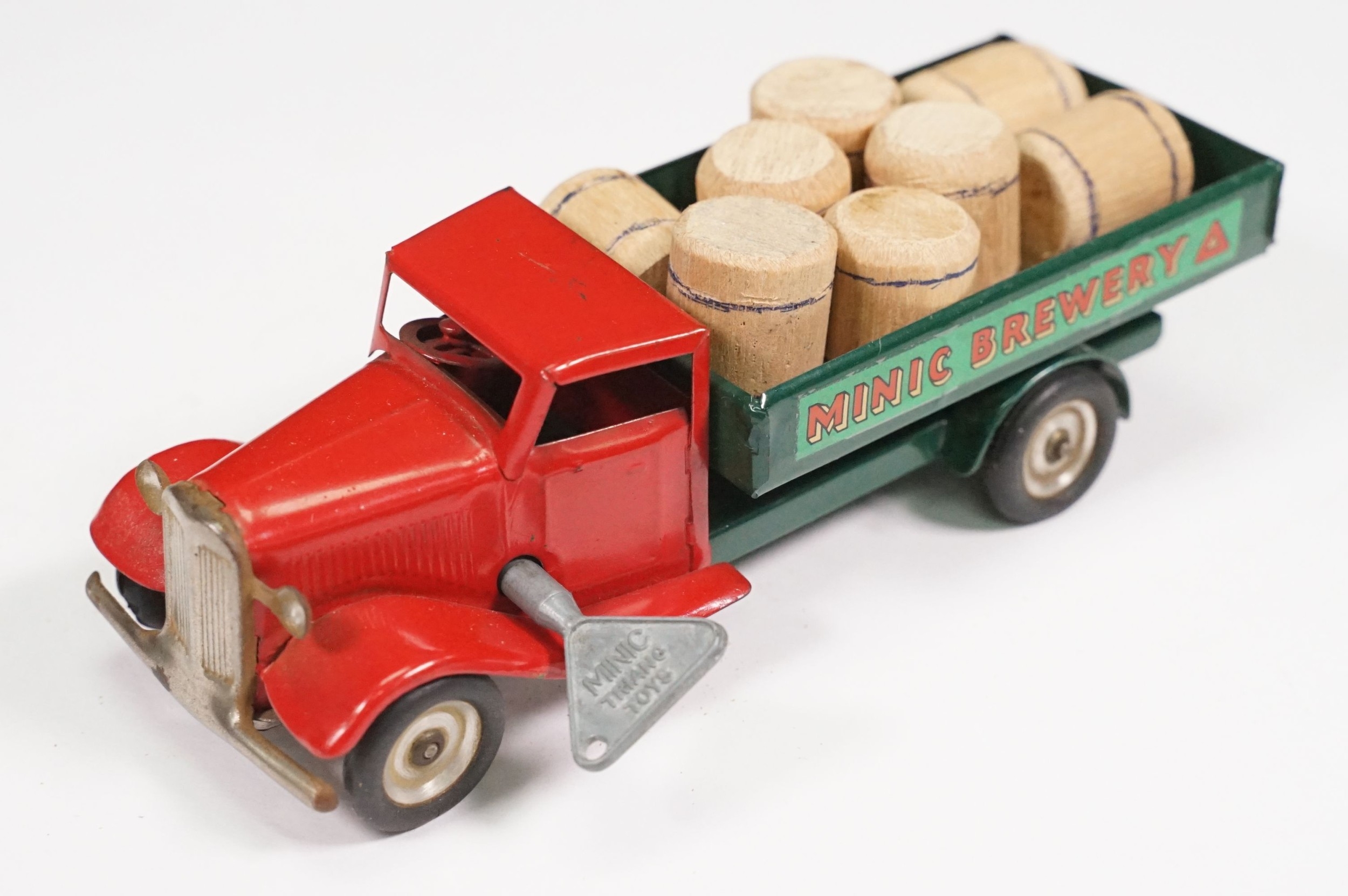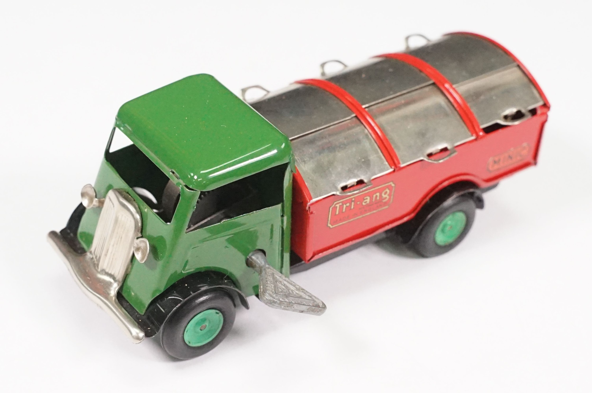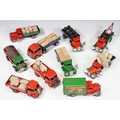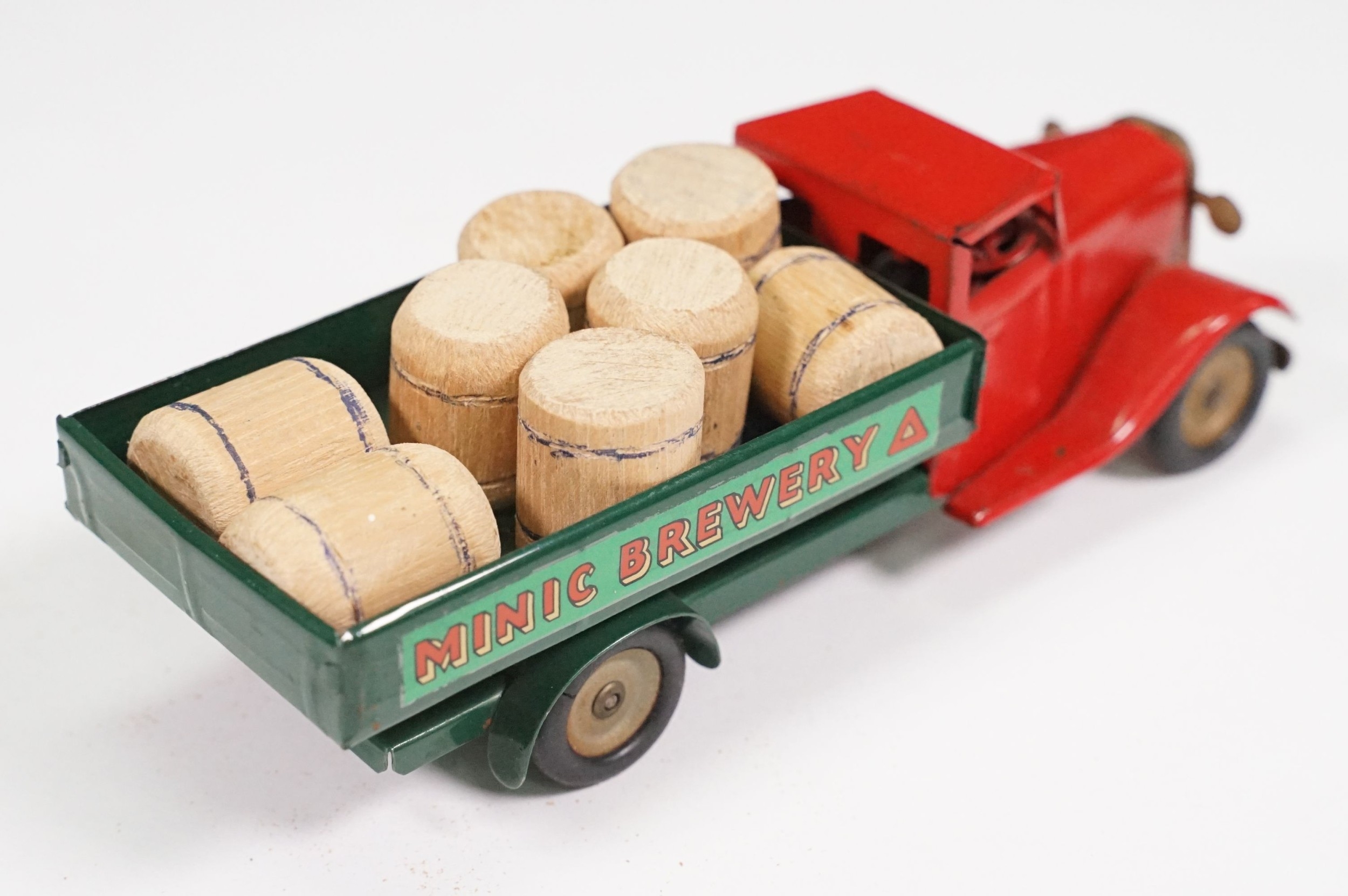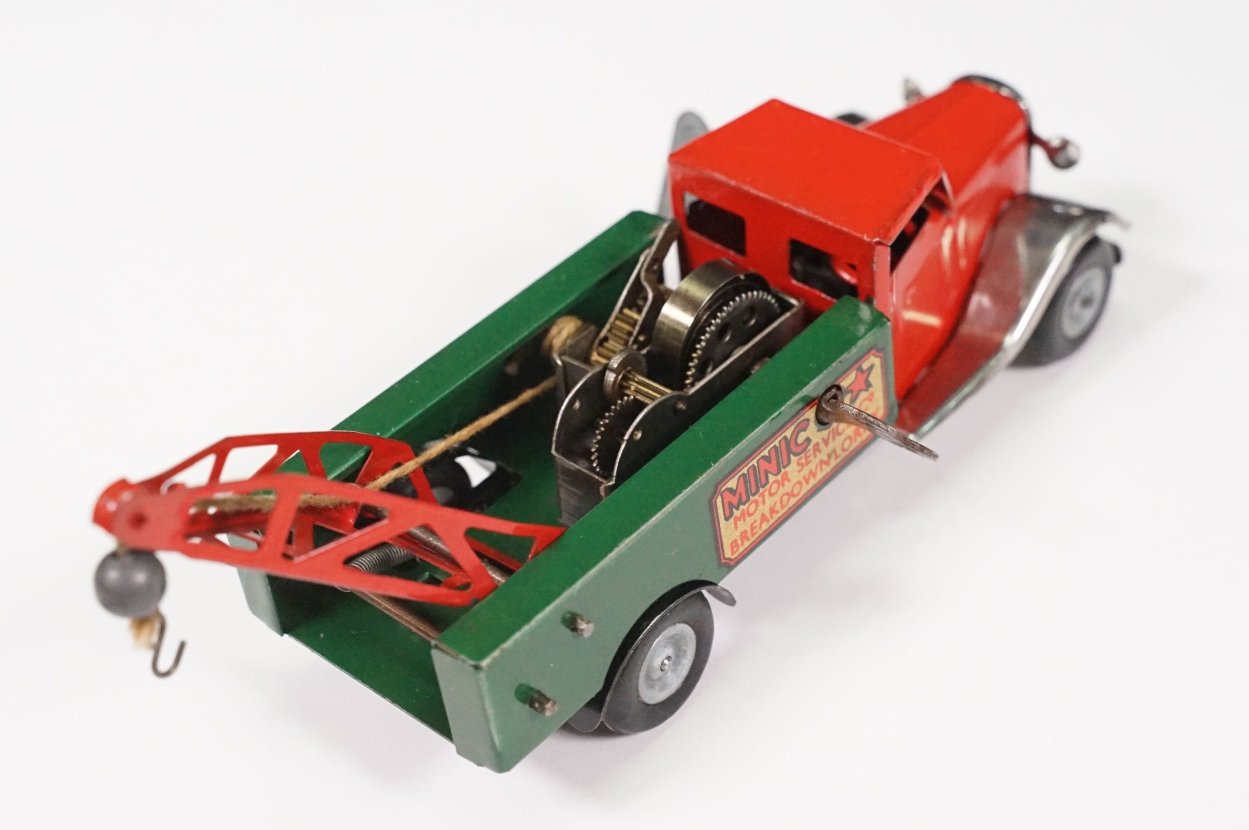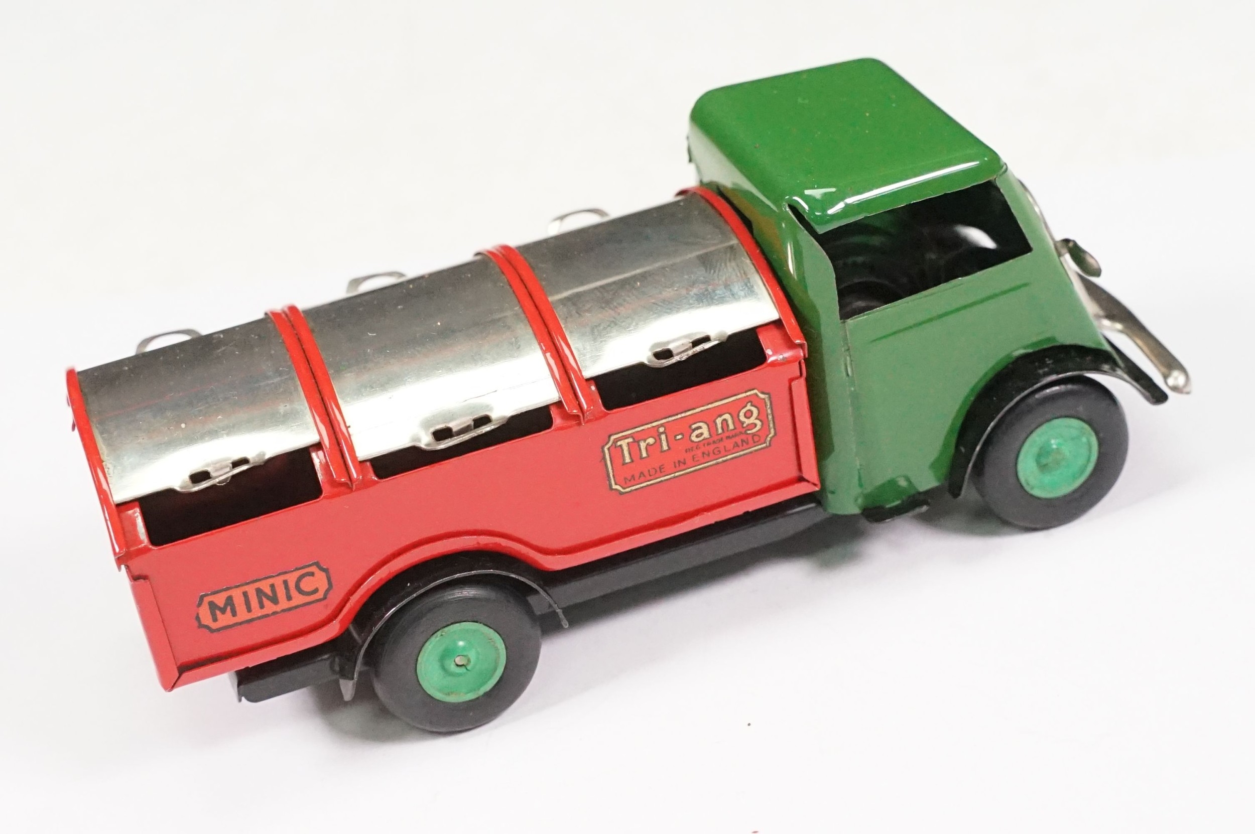 Ten Triang Minic Post-War tinplate and clockwork commercial models to include Carter Paterson Van 22M, Dust Cart 32M, Breakdown Lorry 48M with red cab and green body, Brewery Lorry 72M, British Road Services Open Back Lorry, etc, all complete with original Triang Minic clockwork keys, all models in gd-vg condition overall with some signs of wear in places