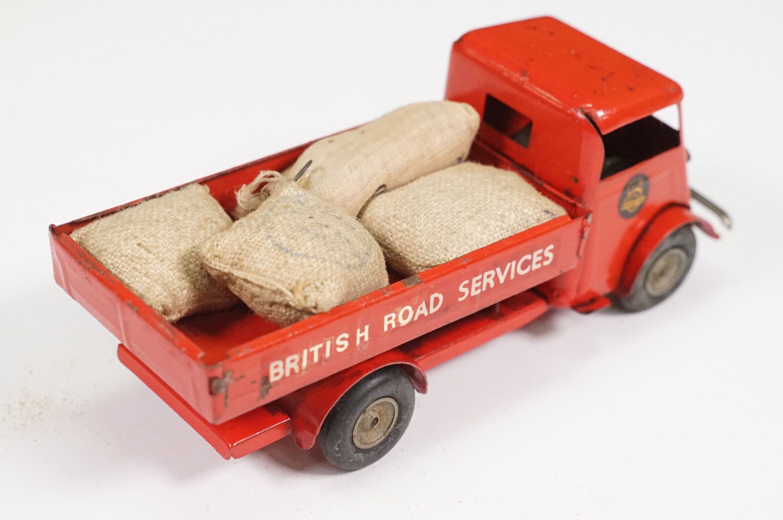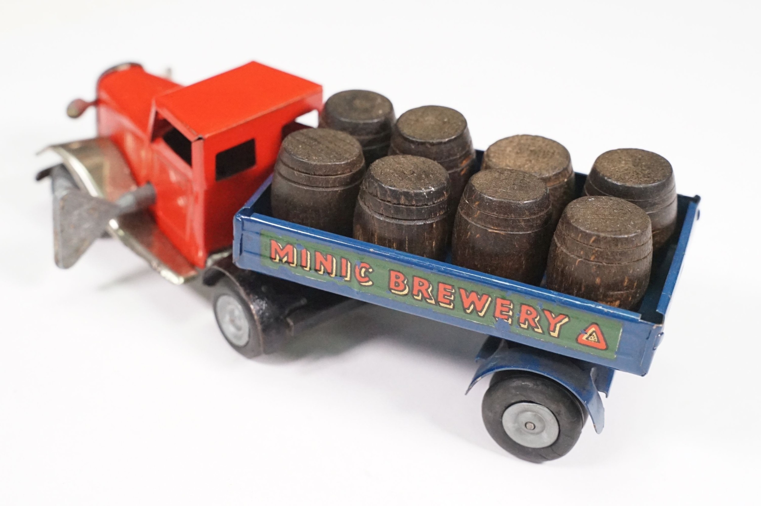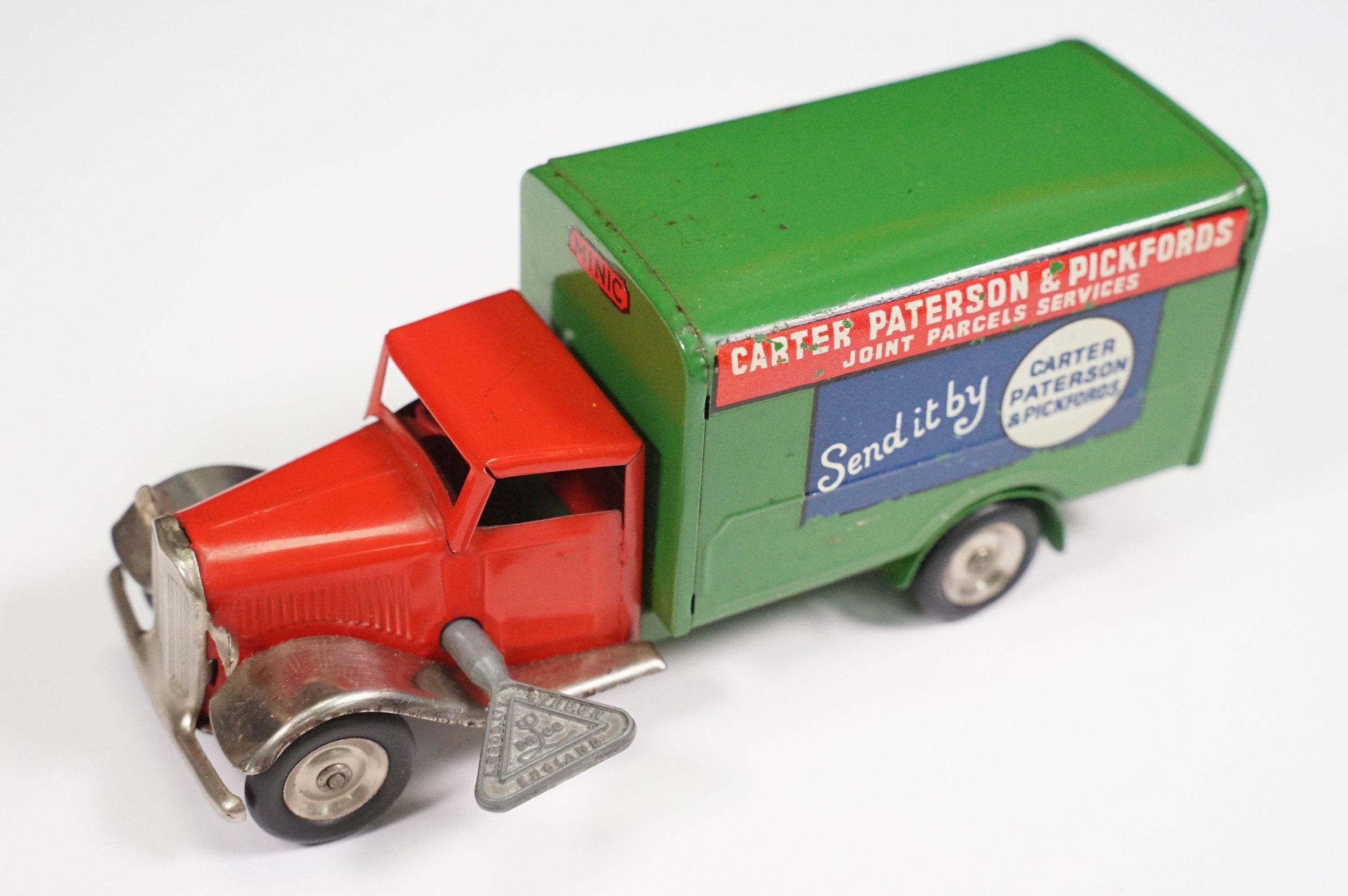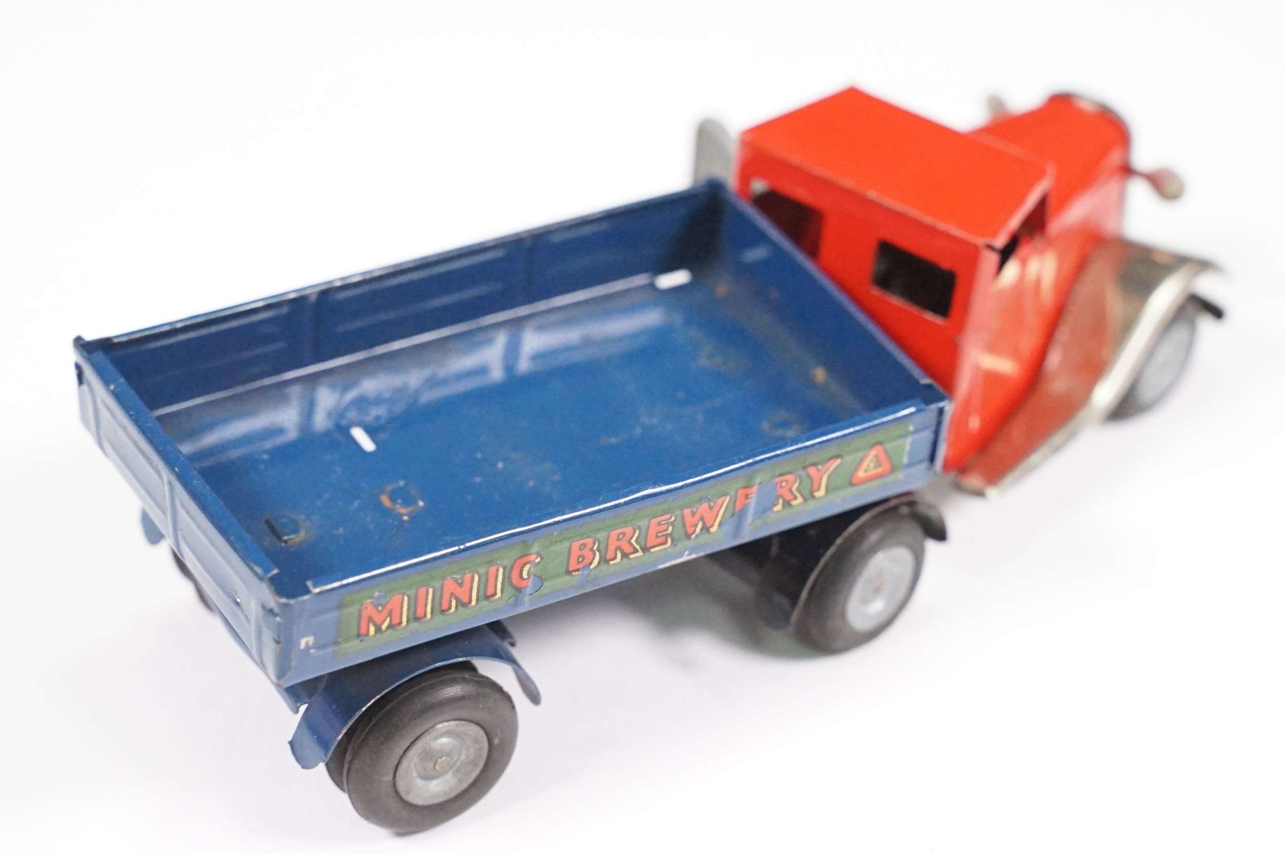 Ten Triang Minic Post-War tinplate and clockwork commercial models to include Carter Paterson Van 22M, Dust Cart 32M, Breakdown Lorry 48M with red cab and green body, Brewery Lorry 72M, British Road Services Open Back Lorry, etc, all complete with original Triang Minic clockwork keys, all models in gd-vg condition overall with some signs of wear in places