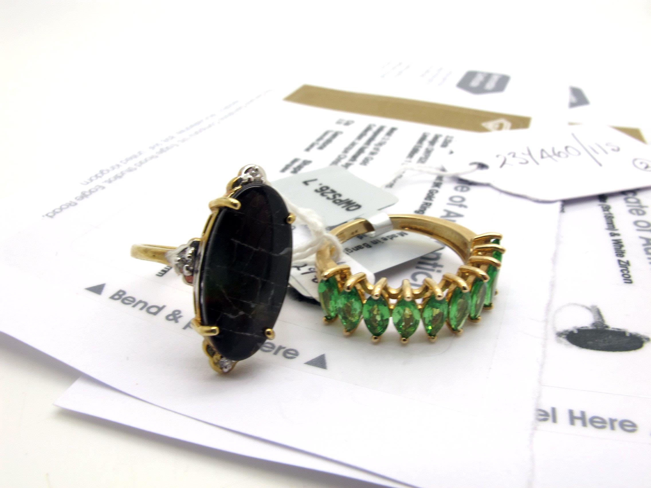 The Genuine Gemstone Company Ltd; A 9 ct Gold Tsavorite Garnet Dress Ring, claw set marquise cut stones, of uniform design, between wide shoulders (finger size O), A 9ct Gold AAA Ammolite and White Zircon dress ring, oval claw set centre, between inset shoulders (finger size L 1/2) (total weight 6.5 grams) (2).