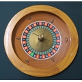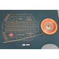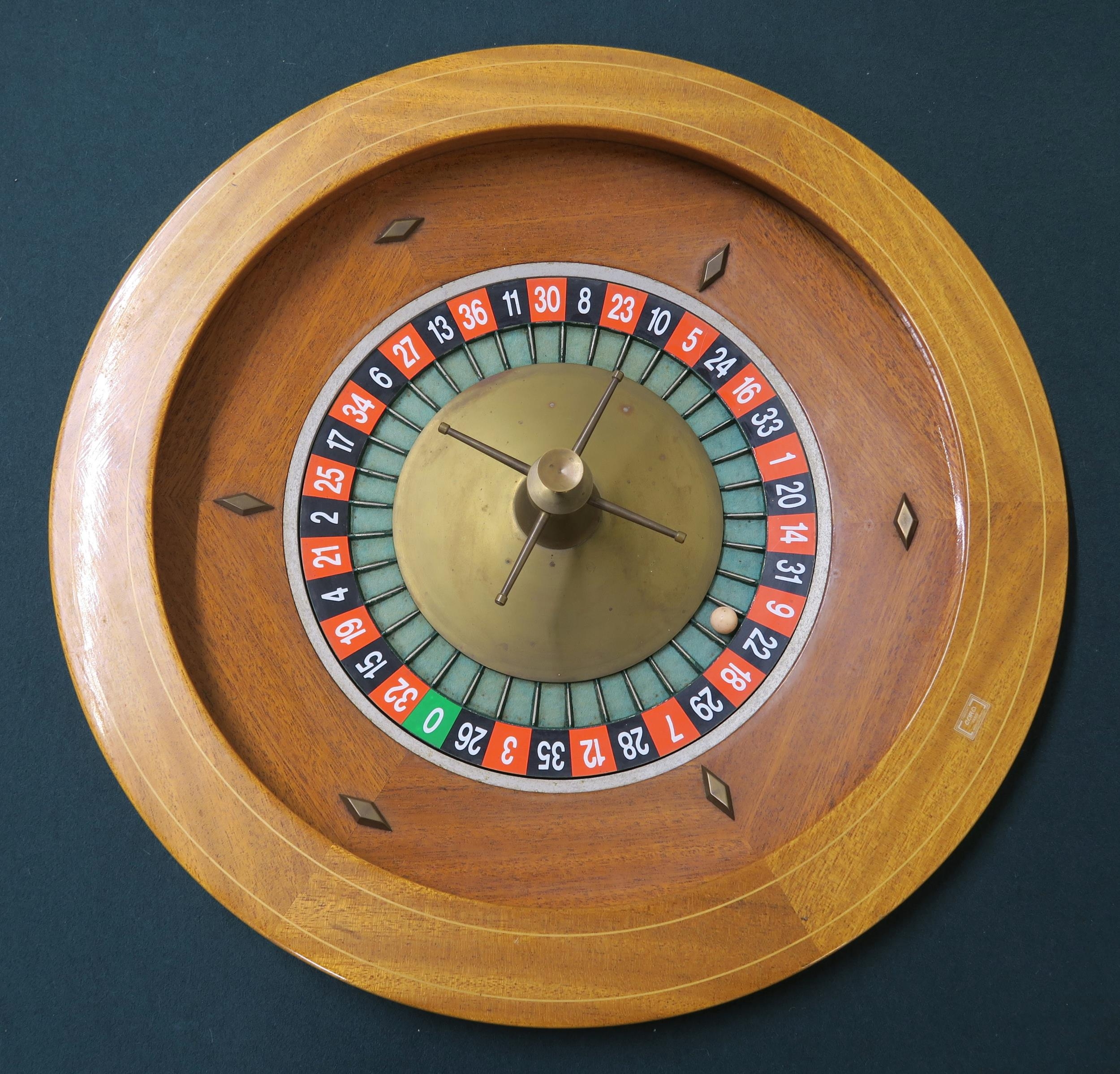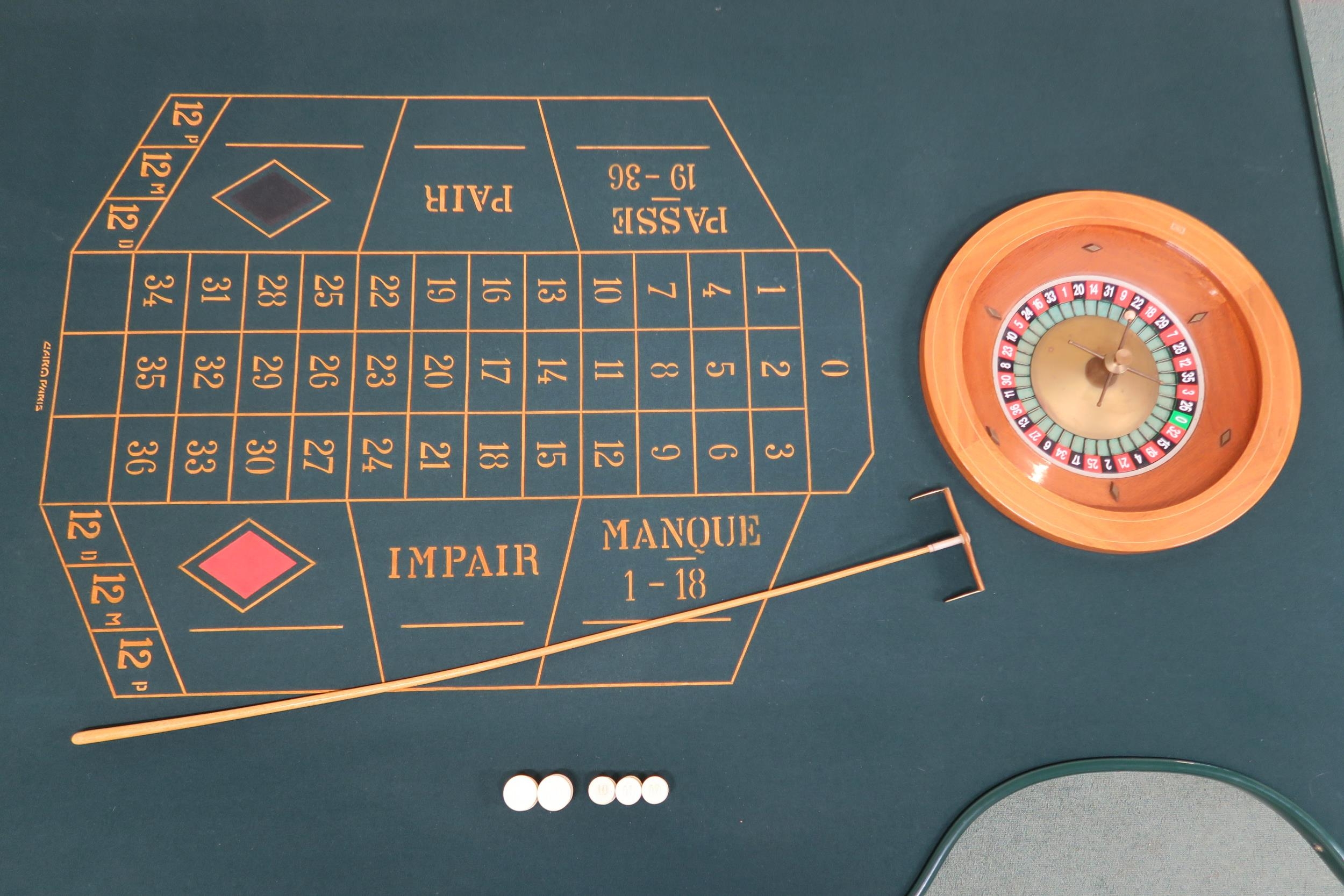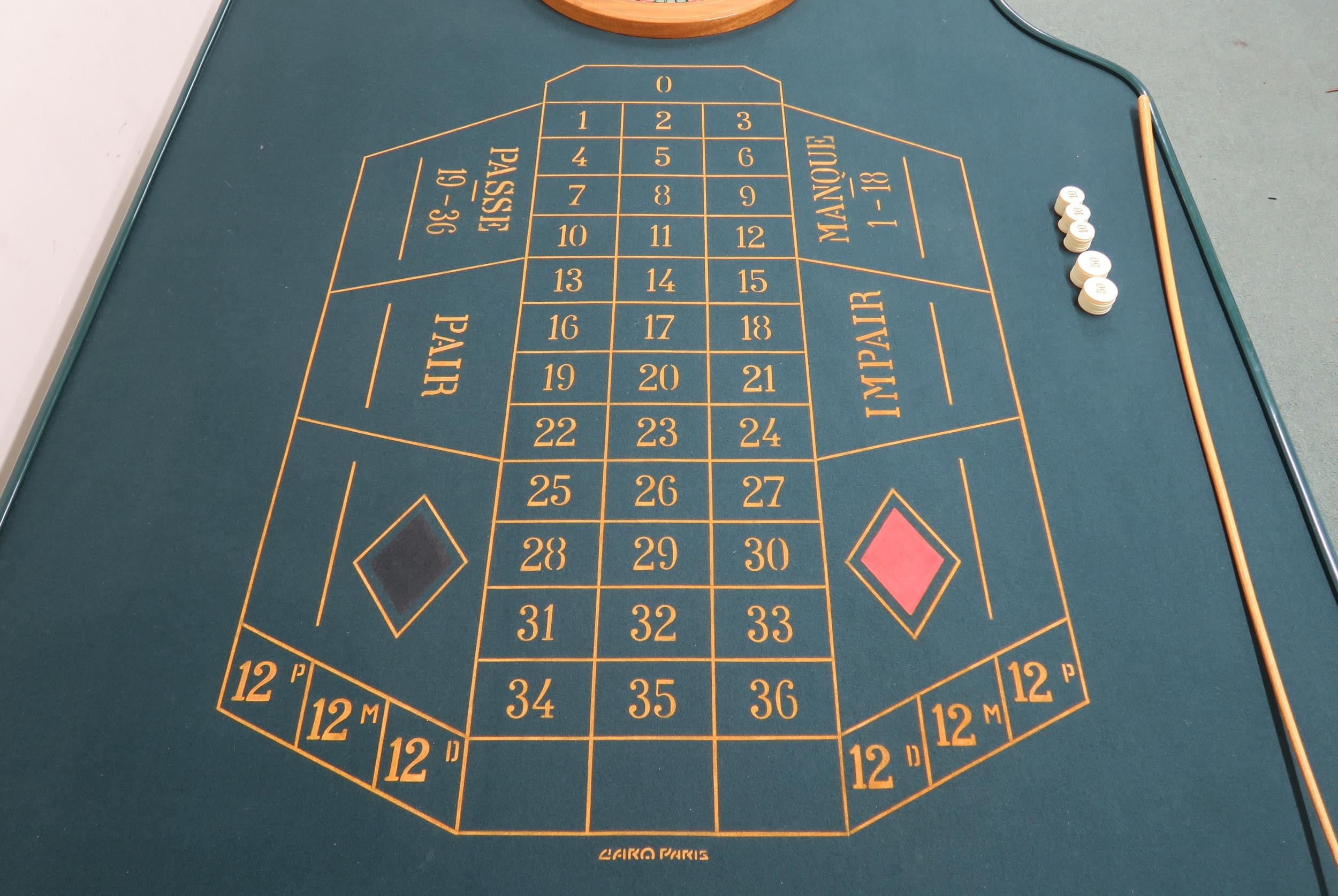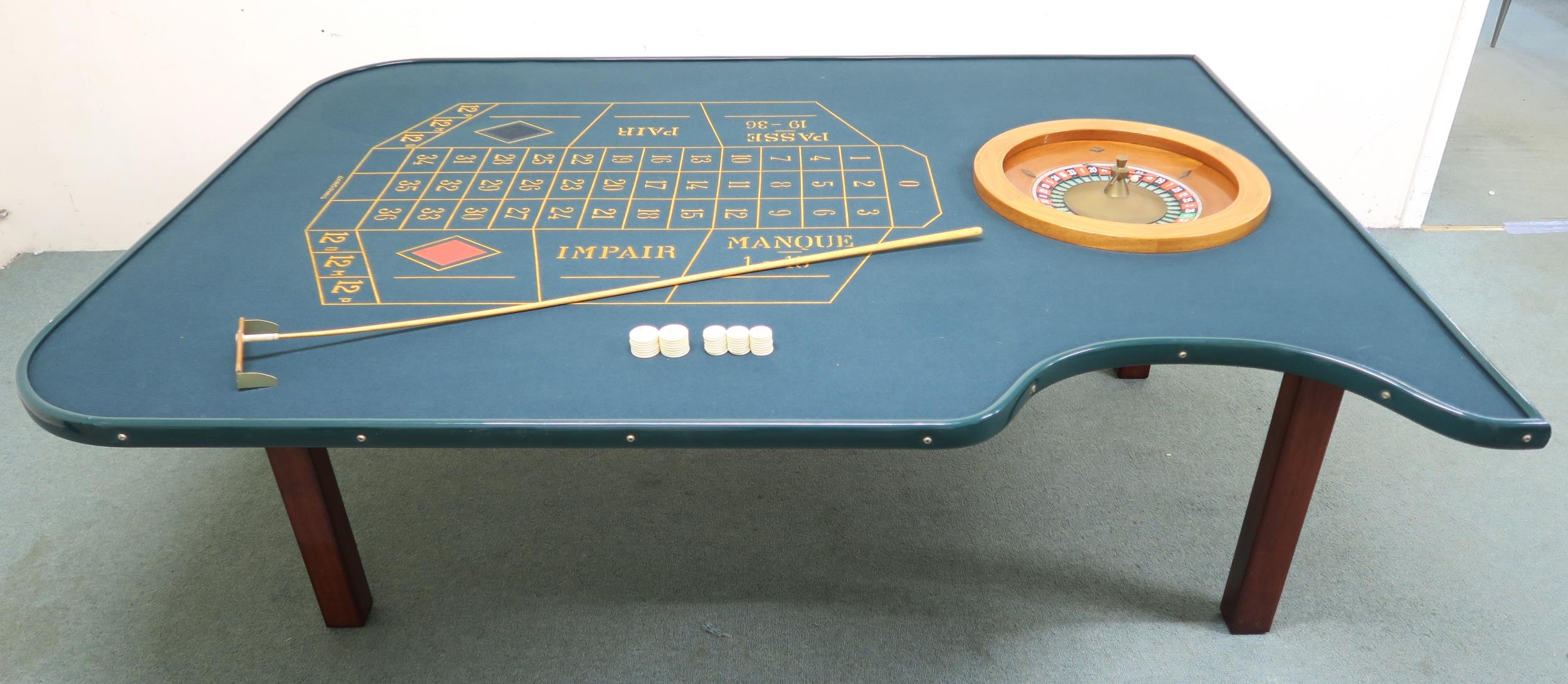 A 20th century French casino roulette table produced by Caro of Paris with shaped baize top, mahogany and brass roulette wheel, croupier chip rake, assorted chips and two piece table cover, 75cm high x 222cm long x 154cm deep