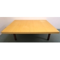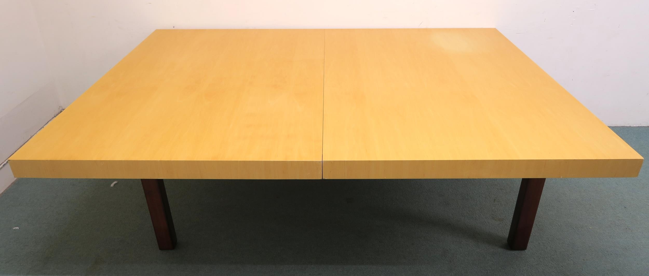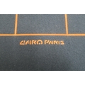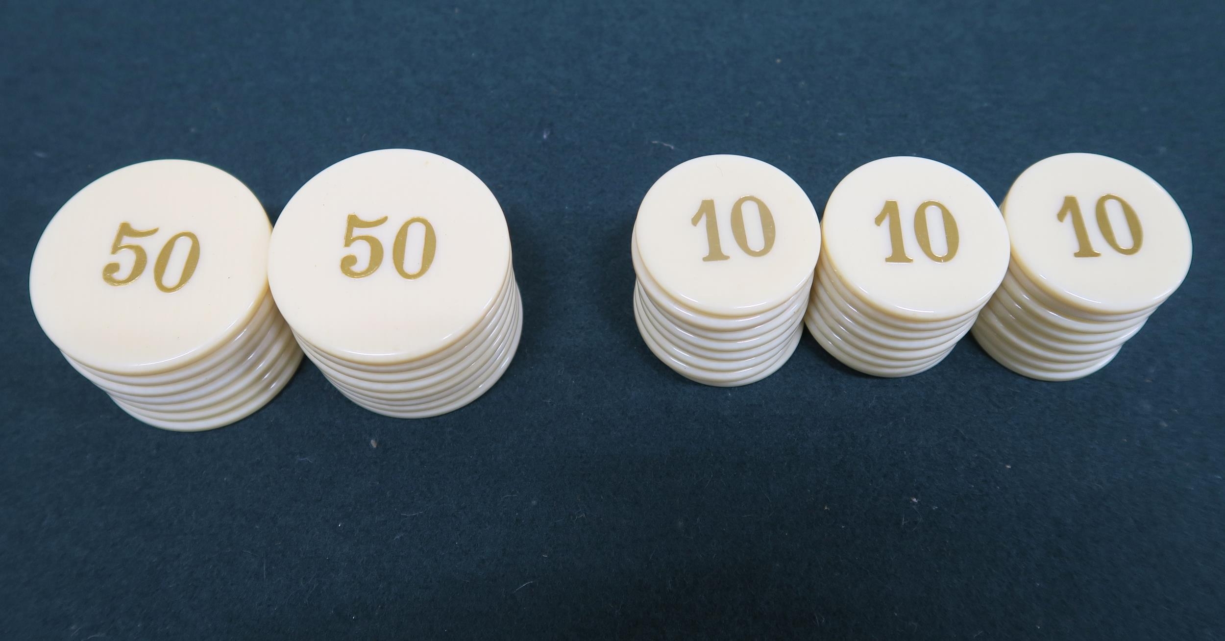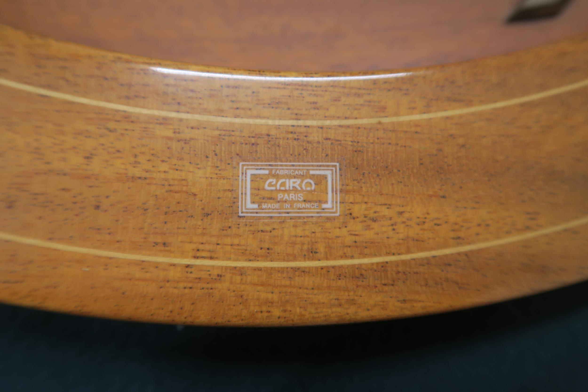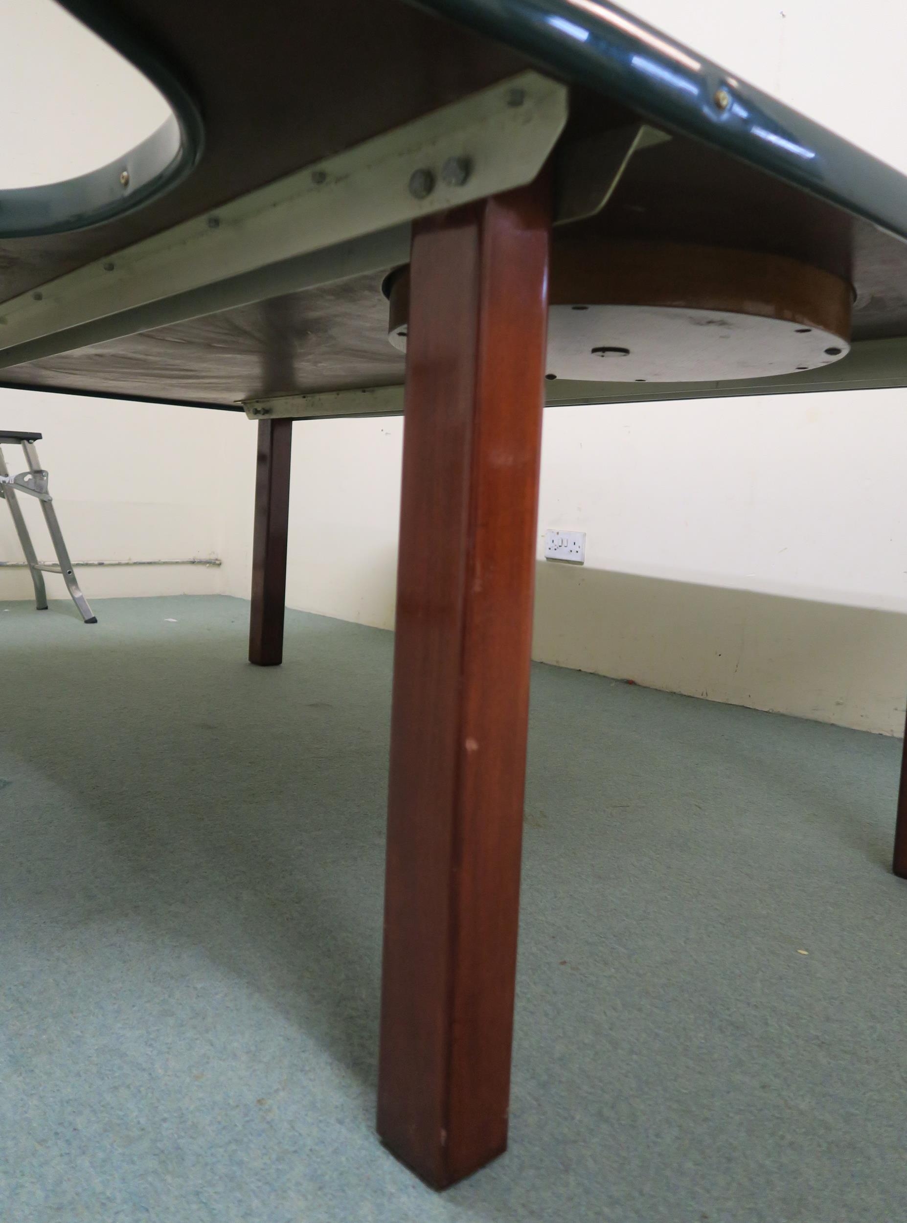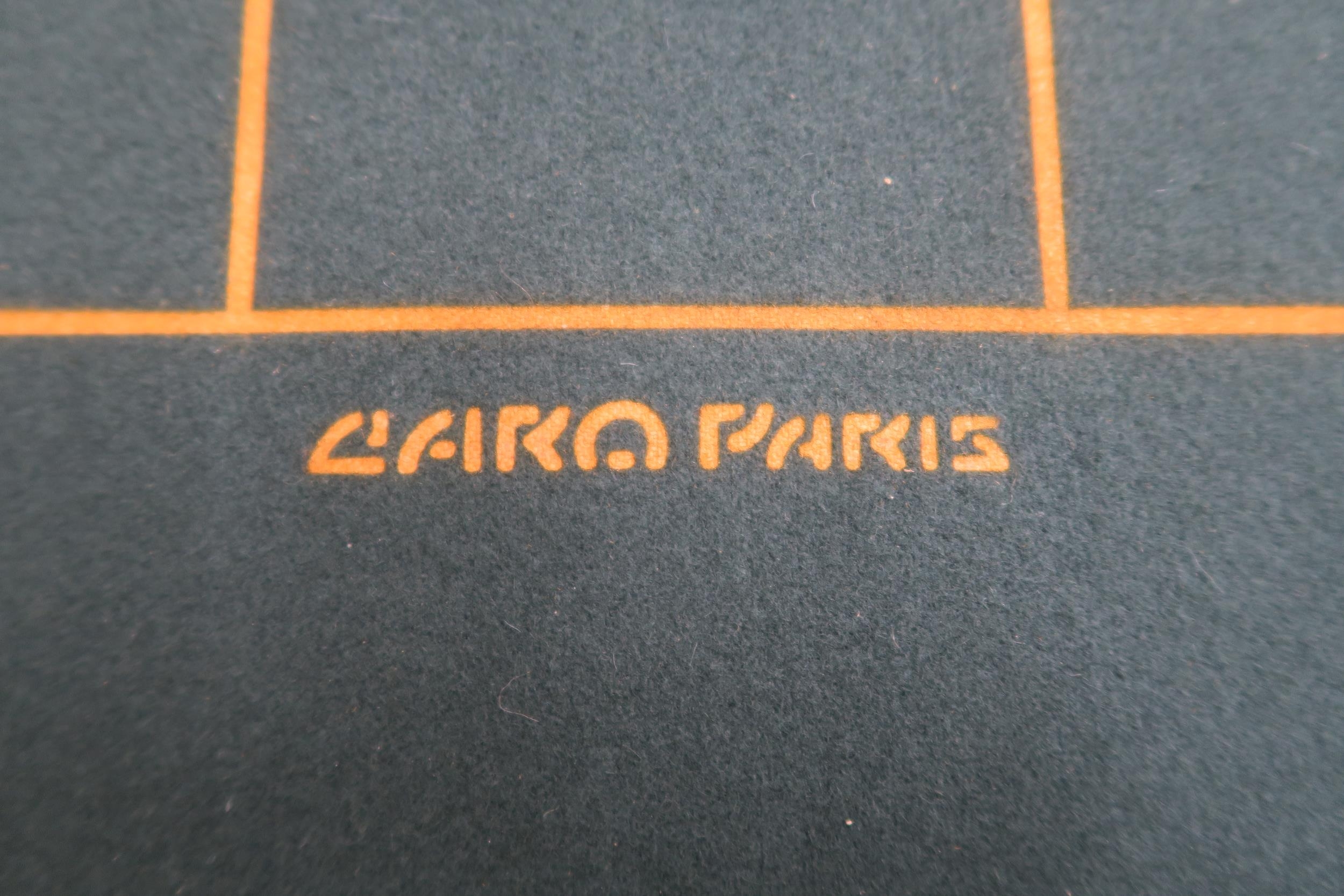 A 20th century French casino roulette table produced by Caro of Paris with shaped baize top, mahogany and brass roulette wheel, croupier chip rake, assorted chips and two piece table cover, 75cm high x 222cm long x 154cm deep